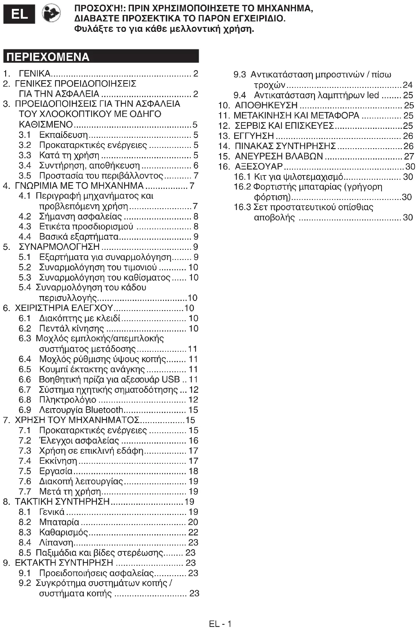 Χλοοκοπτικό τρακτέρ με εποχούμενο χειριστή, μηχανή μπαταρίας ΟΔΗΓΙΕΣ ΧΡΗΣΠΣ ΠΡΟΣΟΧΗ: πριν χρησιμοποιησετε το μηχανημα, διαβαστε προσεκτικα το παρον εγχειριδιο.