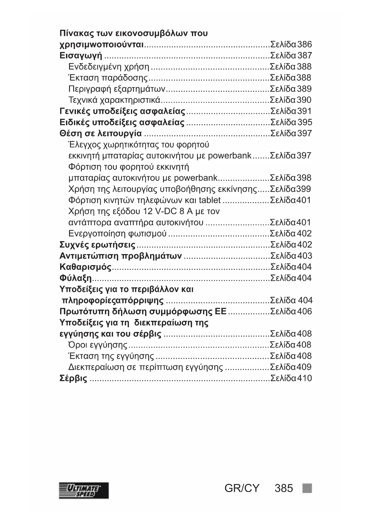 Προειδοποίηση για ηλεκτροπληξία! Κίνδυνος-θάνατος! Προσοχή! Κίνδυνος έκρηξης! Ανάκτηση πρώτων υλών αντί για διάθεση απορριμμάτων! Απορρίψτε τη συσκευασία και τη συσκευή με τρόπο φιλικό προς το περιβάλλον! Είστε υποχρεωμένοι από τη νομοθεσία να απορρίπτετε τις συσκευές με αυτή τη σήμανση ξεχωριστά από τα κοινά αστικά απορρίμματα. Απαγορεύεται η απόρριψη στα οικιακά απορρίμματα. Συνεχές ρεύμα Φορητός εκκινητής μπαταρίας αυτοκινήτου με powerbank UMAP 12000 C3 z Εισαγωγή Συγχαρητήρια! Αποφασίσατε να αποκτήσετε ένα προϊόν κορυφαίας ποιότητας της εταιρείας μας. Εξοικειωθείτε με το προϊόν πριν το θέσετε σε λειτουργία για πρώτη φορά. Διαβάστε για αυτόν τον σκοπό προσεκτικά τις ακόλουθες οδηγίες χρήσης και τις υποδείξεις ασφαλείας. Η θέση αυτού του προϊόντος σε λειτουργία επιτρέπεται να γίνεται μόνο από ενημερωμένα άτομα. ΔΙΑΤΗΡΕΙΤΕ ΤΟ ΠΡΟΪΟΝ ΜΑΚΡΙΑ ΑΠΟ ΠΑΙΔΙΑ! ΥΠΟΔΕΙΞΗ: Κατάλληλο μόνο για βενζινοκινητήρες με μέγιστο κυβισμό έως 3 λίτρα και πετρελαιοκινητήρες με μέγιστο κυβισμό έως 2 λίτρα.388 GR/CY z Ενδεδειγμένη χρήση Αυτός ο φορητός εκκινητής μπαταρίας αυτοκινήτου με powerbank εξυπηρετεί στην πρόσθετη υποστήριξη συστημάτων μπαταρίας οχημάτων 12 V όταν παρουσιάζονται προβλήματα κατά την εκκίνηση βενζινοκινητήρων και πετρελαιοκινητήρων τα οποία οφείλονται σε εξασθενημένες ή άδειες μπαταρίες. Ωστόσο, ο φορητός εκκινητής μπαταρίας αυτοκινήτου με powerbank δεν μπορεί να αντικαταστήσει την μπαταρία του οχήματος. Επιτρέπει απλώς στον χρήστη να βάλει μπροστά τον κινητήρα του οχήματος σε περίπτωση ανάγκης χωρίς τη βοήθεια τρίτου, εφόσον για τη διαδικασία εκκίνησης δεν απαιτούνται περισσότερα από 500 A (μέγ. ρεύμα αιχμής εξόδου). Αυτός ο φορητός εκκινητής μπαταρίας αυτοκινήτου με powerbank δεν εξυπηρετεί στην πρόσθετη υποστήριξη μπαταριών 6 V. Επιπλέον, ο φορητός εκκινητής μπαταρίας αυτοκινήτου με powerbank διαθέτει 2 εξόδους USB. Μπορεί επομένως σε περίπτωση ανάγκης να φορτίσει κινητό τηλέφωνο, συσκευή πλοήγησης ή άλλες συσκευές USB. Φυλάξτε προσεκτικά τις παρούσες οδηγίες. Σε περίπτωση παραχώρησης του προϊόντος σε τρίτους, παραδώστε και όλα τα έγγραφα. Οποιαδήποτε χρήση η οποία αποκλίνει από την προβλεπόμενη απαγορεύεται και είναι δυνητικά επικίνδυνη. Ζημιές οι οποίες οφείλονται σε παράβλεψη των οδηγιών και εσφαλμένη χρήση δεν καλύπτονται από την εγγύηση και δεν εμπίπτουν στο πεδίο ευθύνης του κατασκευαστή. Η συσκευή δεν προορίζεται για επαγγελματική χρήση. Σε περίπτωση επαγγελματικής χρήσης παύει να ισχύει