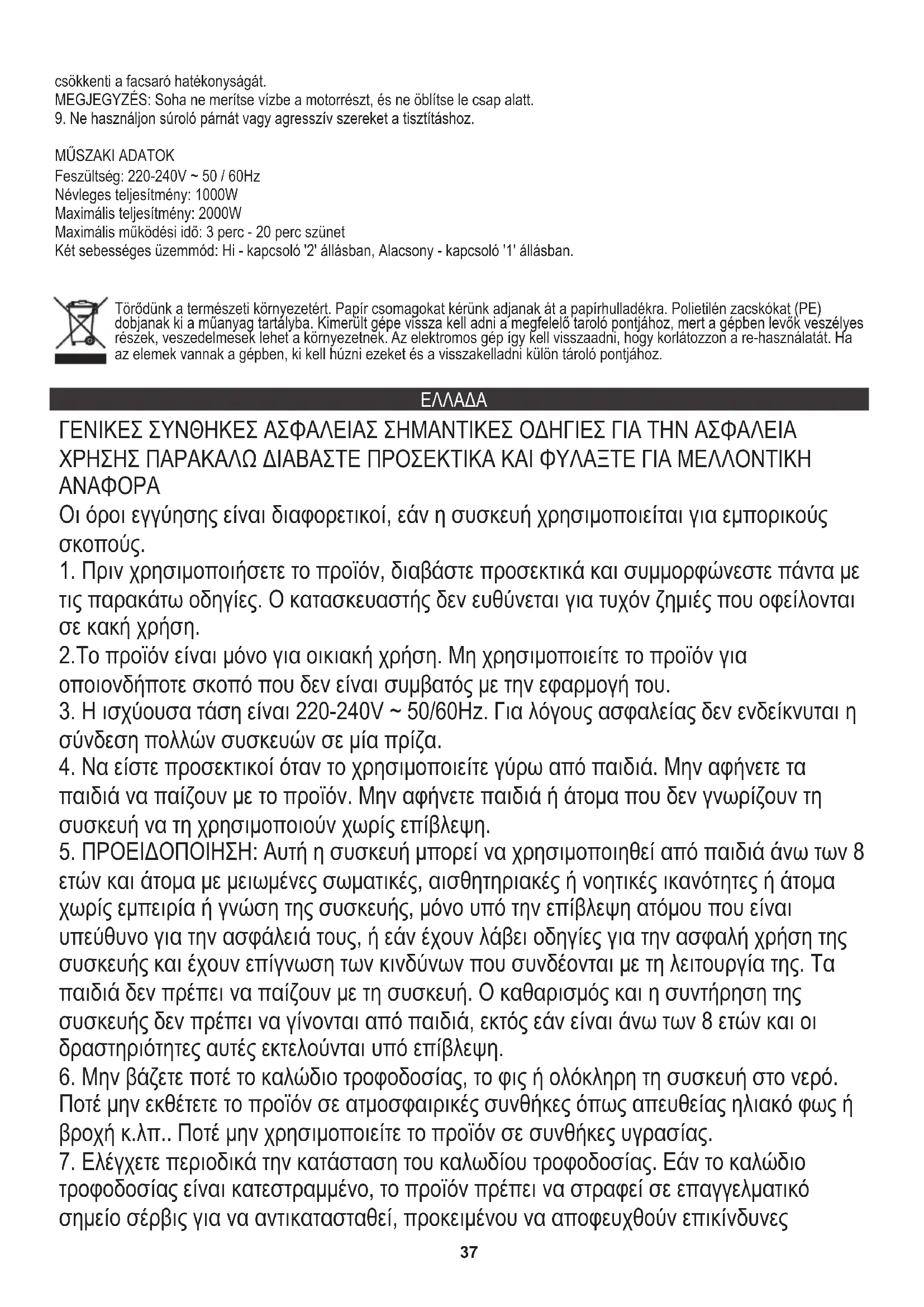 Απελευθερώστε τη λαβή ασφαλείας (11). φροντίζουμε το φυσικό περιβάλλον. Παρακαλούμε να πετάτε τις συσκευασίες από χαρτόνι στον κάδο ανακύκλωσης απορριμμάτων χαρτιού. Τις σακούλες από πολυαιθυλένιο (ΡΕ), απορρίψτε τις στον κάδο ανακύκλωσης πλαστικών. Η φθαρμένη συσκευή πρέπει να απορρίπτεται στο κατάλληλο σημείο, εξαιτίας των επικίνδυνων στοιχείων που περιέχει και τα οποία μπορεί να αποτελέσουν απειλή για το περιβάλλον. Η ηλεκτρική συσκευή πρέπει να απορρίπτεται με τέτοιο τρόπο ώστε να περιοριστεί η επαναχρησιμοποίηση της. Εάν στη συσκευή βρίσκονται μπαταρίες, αυτές πρέπει να αφαιρεθούν και να πεταχτούν σε ξεχωριστό κάδο. (MK) Mакедонски ОПШТИ БЕЗБЕДНОСНИ УСЛОВИ ВАЖНИ ИНСТРУКЦИИ ЗА БЕЗБЕДНОСТ НА УПОТРЕБА ПРОЧИТАЈТЕ ВНИМАТЕЛНО И ЧУВАЈТЕ ЗА ИДНА РЕФЕРЕНЦИЈА Условите за гаранција се различни, доколку уредот се користи за комерцијални цели.