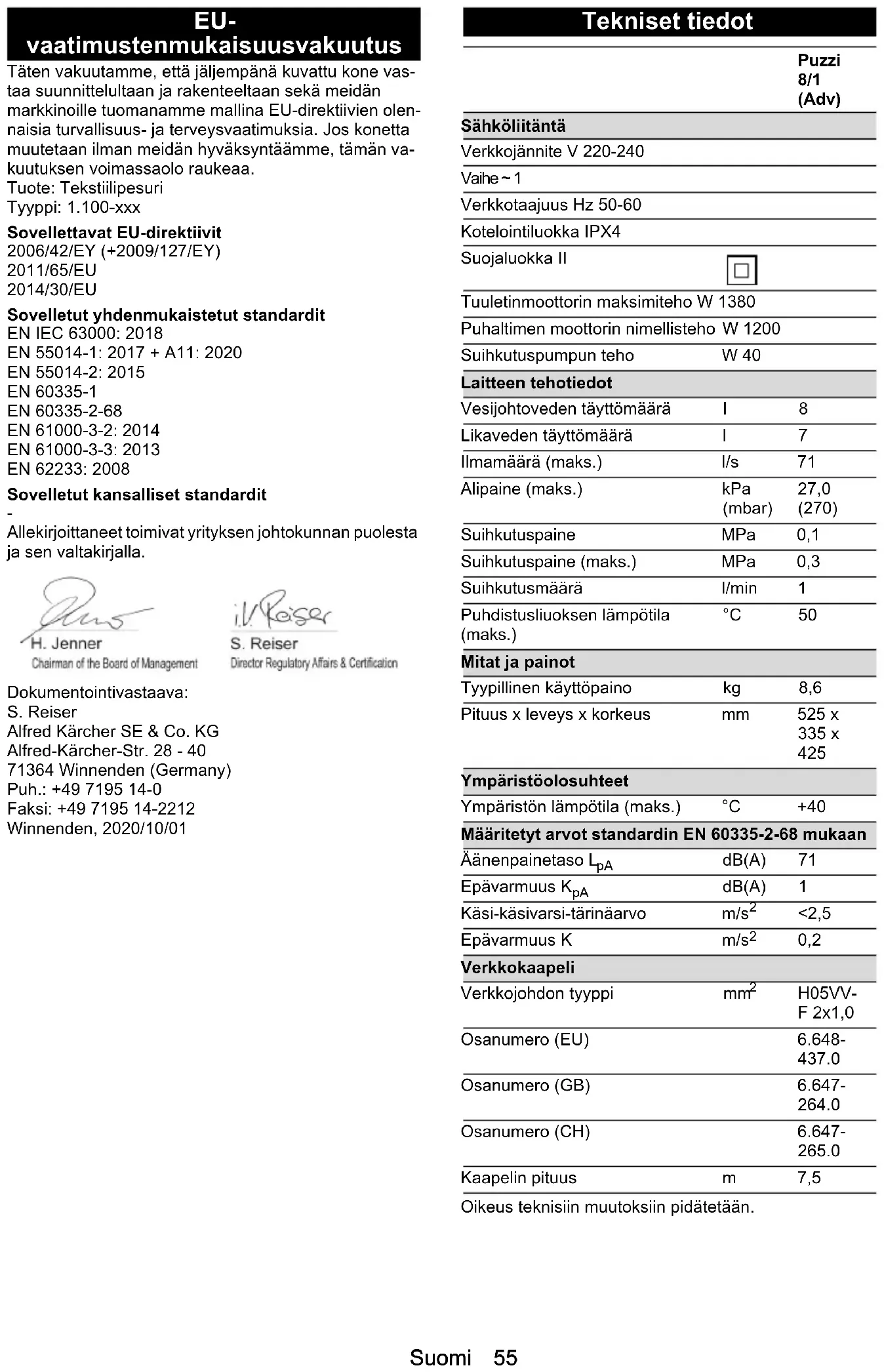 Οι υπογράφοντες ενεργούν κατ’ εντολή και με εξουσιοδότηση από το διοικητικό συμβούλιο. Υπεύθυνος τεχνικού φακέλου: S. Reiser Alfred Kärcher SE & Co. KG Alfred-Kärcher-Str. 28 - 40 71364 Winnenden (Germany) Τηλ.: +49 7195 14-0 Φαξ: +49 7195 14-2212 Winnenden, 2020/10/01 Τεχνικά στοιχεία Με την επιφύλαξη τεχνικών αλλαγών. Puzzi 8/1 (Adv) Ηλεκτρική σύνδεση Τάση δικτύου V 220-240 Φάση ~1 Συχνότητα δικτύου Hz 50-60 Τύπος προστασίας IPX4 Κατηγορία προστασίας II Μέγιστη απόδοση κινητήρα