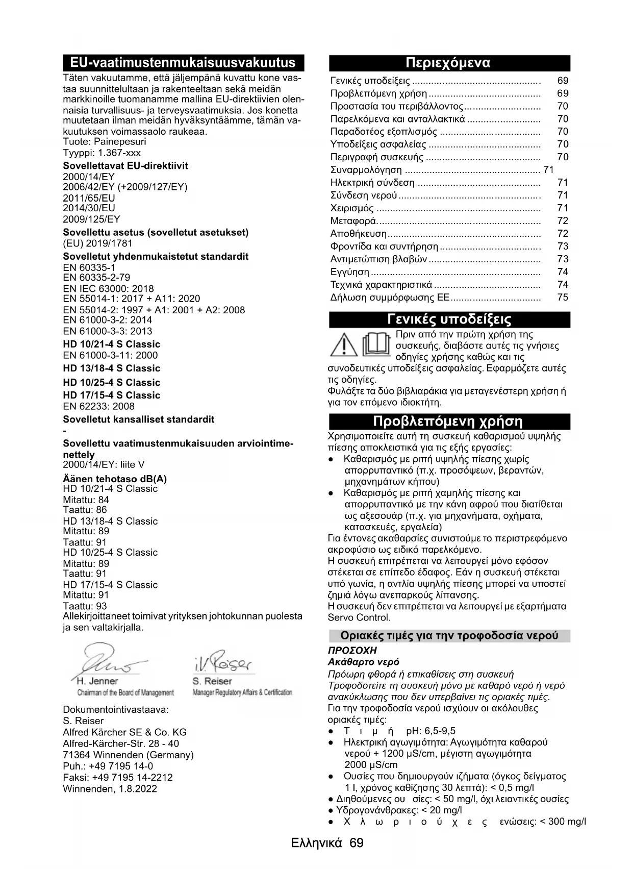 Εφαρμοζόμενη διαδικασία αξιολόγησης συμμόρφωσης 2000/14/EΚ: Παράρτημα V Στάθμη ηχητικής ισχύος dB(A) HD 10/21-4 S Classic Μετρημένη: 84 Εγγυημένη: 86 HD 13/18-4 S Classic Μετρημένη: 89 Εγγυημένη: 91 HD 10/25-4 S Classic Μετρημένη: 89 Εγγυημένη: 91 HD 17/15-4 S Classic Μετρημένη: 91 Εγγυημένη: 93 Οι υπογράφοντες ενεργούν κατ’ εντολή και με εξουσιοδότηση από το διοικητικό συμβούλιο. Υπεύθυνος τεχνικού φακέλου: S. Reiser Alfred Kärcher SE & Co. KG Alfred-Kärcher-Str. 28 - 40 71364 Winnenden (Germany) Τηλ.: +49 7195 14-0 Φαξ: +49 7195 14-2212 Winnenden, 2022/08/01 Πίεση λειτουργίας νερού με πρότυπο