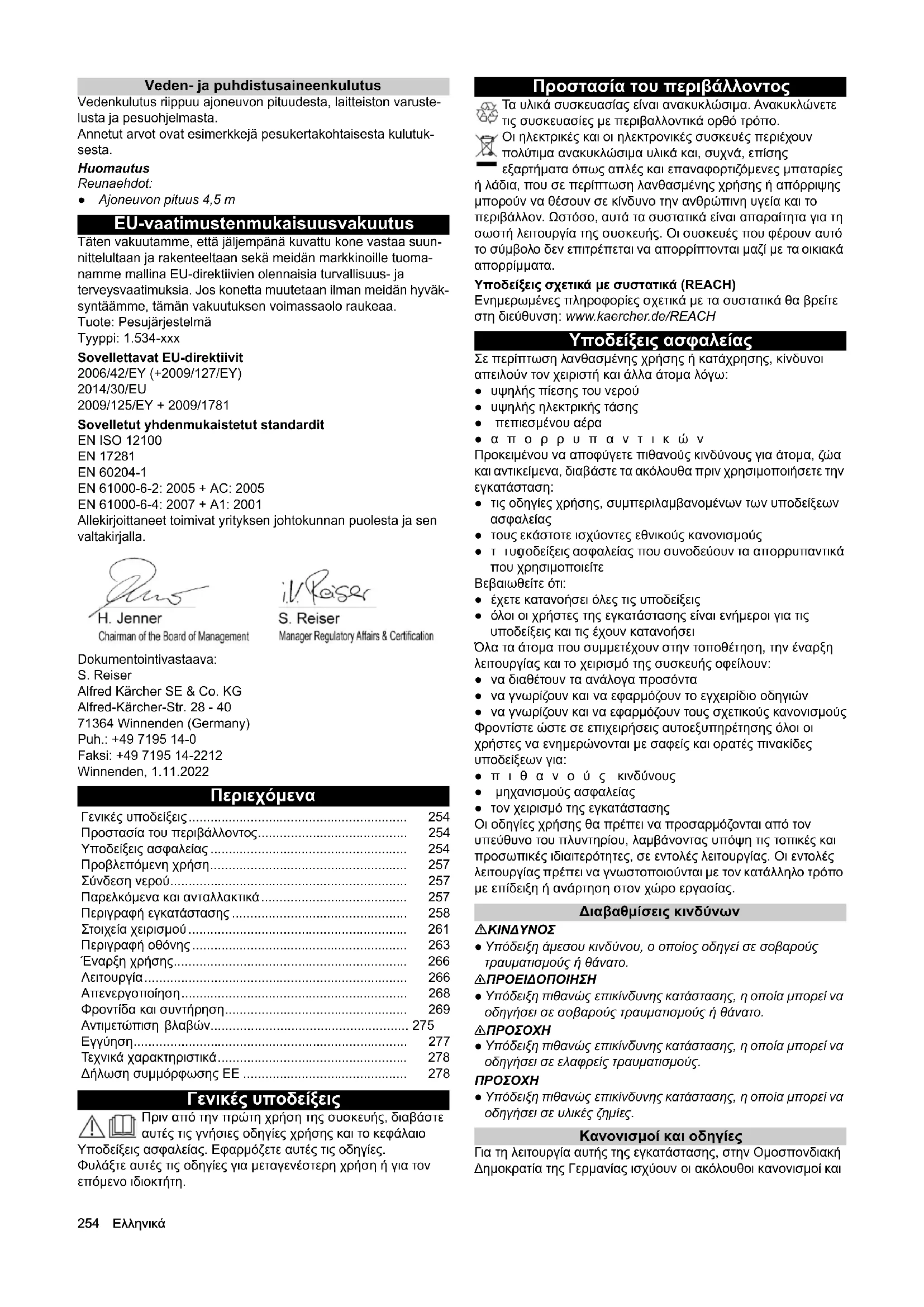 Οριακές συνθήκες: ● Μήκος οχήματος 4,5 m Δήλωση συμμόρφωσης EΕ Με το παρόν δηλώνουμε ότι η παρακάτω μηχανή λόγω του σχεδιασμού και του τύπου κατασκευής της καθώς και στην έκδοση την οποία έχουμε διαθέσει στην αγορά πληροί τις σχετικές βασικές απαιτήσεις για την ασφάλεια και την υγεία των Οδηγιών ΕΕ. Σε περίπτωση τροποποίησης της μηχανής που δεν έχει συμφωνηθεί με εμάς , αυτή η δήλωση ακυρώνεται. Προϊόν: Σύστημα πλύσης Τύπος: 1.534-xxx Σχετικές Οδηγίες ΕΕ 2006/42/EΚ (+2009/127/EΚ) 2014/30/EΕ 2009/125/EK + 2009/1781 Εφαρμοζόμενα εναρμονισμένα πρότυπα EN ISO 12100 EN 17281 EN 60204-1 EN 61000-6-2: 2005 + AC: 2005 EN 61000-6-4: 2007 + A1: 2001 Οι υπογράφοντες ενεργούν κατ’ εντολή και με εξουσιοδότηση από το διοικητικό συμβούλιο.