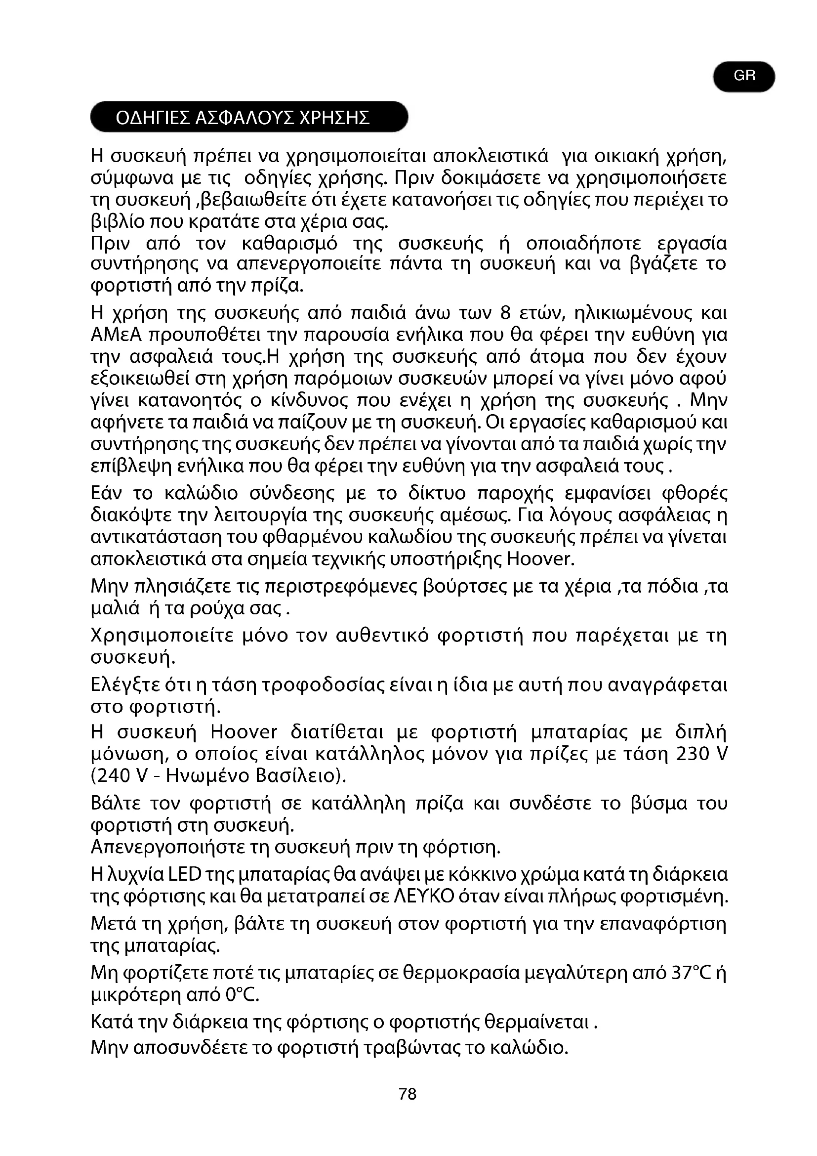 Käytä vain alkuperäisiä Hoover-varaosia. Niitä on saatavana paikalliselta Hoover- jälleenmyyjältä tai valtuutetusta huoltoliikkeestä. Mainitse varaosatilauksen yhteydessä laitteen tyyppinumero. TAKUU Tämän laitteen takuuehdot määrittelee ostomaan Hoover-edustaja. Yksityiskohtaiset tiedot näistä ehdoista saa laitteen myyneeltä jälleenmyyjältä. Tämän takuun mukaisia vaateita esitettäessä on esitettävä myyntitodistus tai ostokuitti. TÄRKEÄÄ: tämän tuotteen akulla on 2 vuoden takuu tuotteen ostopäivästä alkaen. 2 vuoden kuluttua asiakkaan on hankittava uusi akku omalla kustannuksellaan. Oikeus muutoksiin pidätetään. FI78 ΟΔΗΓΙΕΣ ΑΣΦΑΛΟΥΣ ΧΡΗΣΗΣ H συσκευή πρέπει να χρησιμοποιείται αποκλειστικά για οικιακή χρήση, σύμφωνα με τις οδηγίες χρήσης. Πριν δοκιμάσετε να χρησιμοποιήσετε τη συσκευή ,βεβαιωθείτε ότι έχετε κατανοήσει τις οδηγίες που περιέχει το βιβλίο που κρατάτε στα χέρια σας. Πριν από τον καθαρισμό της συσκευής ή οποιαδήποτε εργασία συντήρησης να απενεργοποιείτε πάντα τη συσκευή και να βγάζετε το φορτιστή από την πρίζα. Η χρήση της συσκευής από παιδιά άνω των 8 ετών, ηλικιωμένους και ΑΜεΑ προυποθέτει την παρουσία ενήλικα που θα φέρει την ευθύνη για την ασφαλειά τους.Η χρήση της συσκευής από άτομα που δεν έχουν εξοικειωθεί στη χρήση παρόμοιων συσκευών μπορεί να γίνει μόνο αφού γίνει κατανοητός ο κίνδυνος που ενέχει η χρήση της συσκευής . Μην αφήνετε τα παιδιά να παίζουν με τη συσκευή. Οι εργασίες καθαρισμού και συντήρησης της συσκευής δεν πρέπει να γίνονται από τα παιδιά χωρίς την επίβλεψη ενήλικα που θα φέρει την ευθύνη για την ασφαλειά τους . Εάν το καλώδιο σύνδεσης με το δίκτυο παροχής εμφανίσει φθορές διακόψτε την λειτουργία της συσκευής αμέσως. Για λόγους ασφάλειας η αντικατάσταση του φθαρμένου καλωδίου της συσκευής πρέπει να γίνεται αποκλειστικά στα σημεία τεχνικής υποστήριξης Hoover. Μην πλησιάζετε τις περιστρεφόμενες βούρτσες με τα χέρια ,τα πόδια ,τα μαλιά ή τα ρούχα σας . Χρησιμοποιείτε μόνο τον αυθεντικό φορτιστή που παρέχεται με τη