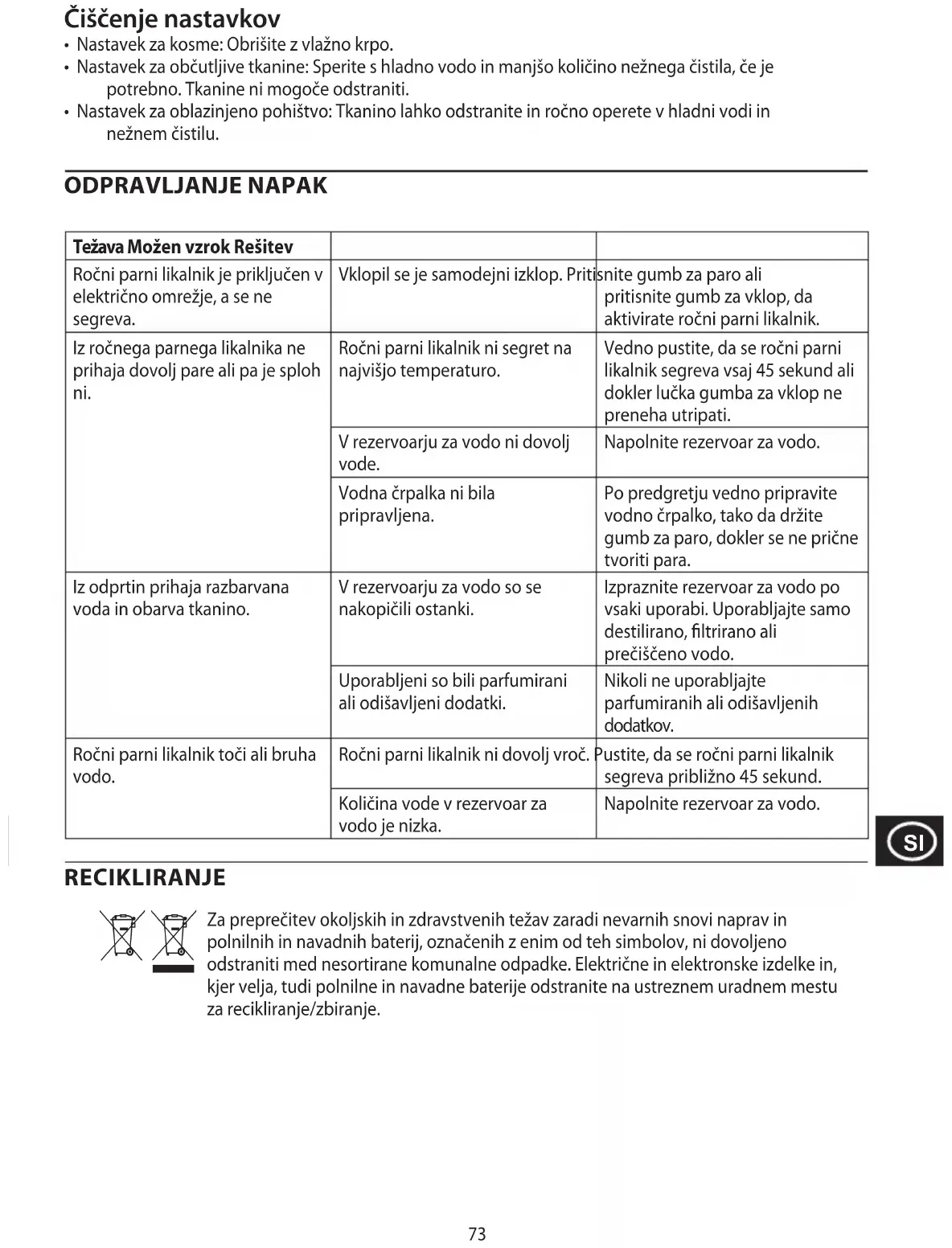- Προσάρτημα για ταπετσαρίες: Το ύφασμα αφαιρείται και πλένεται στο χέρι με κρύο νερό και ήπιο καθαριστικό. ΑΝΤΙΜΕΤΩΠΙΣΗ ΠΡΟΒΛΗΜΑΤΩΝ Πρόβλημα Πιθανή αιτία Λύση Το σύστημα ατμού είναι συνδεδεμένο στην πρίζα, αλλά δεν ζεσταίνεται. Η αυτόματη απενεργοποίηση έχει ενεργοποιηθεί. Πατήστε το κουμπί παραγωγής ατμού ή πατήστε το κουμπί λειτουργίας για να ενεργοποιηθεί το σύστημα ατμού. Δεν υπάρχει αρκετός ατμός ή δεν εξέρχεται καθόλου ατμός από το σύστημα ατμού. Το σύστημα ατμού δεν ζεσταίνεται έως την πλήρη θερμοκρασία. Να αφήνετε πάντα το σύστημα ατμού να προθερμανθεί για τουλάχιστον 45 δευτερόλεπτα ή έως ότου η λυχνία του κουμπιού λειτουργίας σταματήσει να αναβοσβήνει. Δεν υπάρχει αρκετό νερό στο δοχείο νερού. Γεμίστε το δοχείο νερού. Η αντλία νερού δεν έχει γεμίσει. Μετά την προθέρμανση, θα πρέπει πάντα να γεμίζετε την αντλία νερού κρατώντας το κουμπί παραγωγής ατμού, έως ότου σχηματιστεί ατμός. Νερό με χρώμα εξέρχεται από τις οπές και λεκιάζει τα υφάσματα. Έχουν συσσωρευθεί υπολείμματα στο δοχείο νερού. Αδειάζετε το δοχείο νερού μετά από κάθε χρήση. Να χρησιμοποιείτε μόνο απεσταγμένο, φιλτραρισμένο ή κεκαθαρμένο νερό. Χρησιμοποιήθηκαν αρώματα ή αρωματισμένα πρόσθετα. Ποτέ μη χρησιμοποιείτε αρώματα ή αρωματισμένα πρόσθετα.
