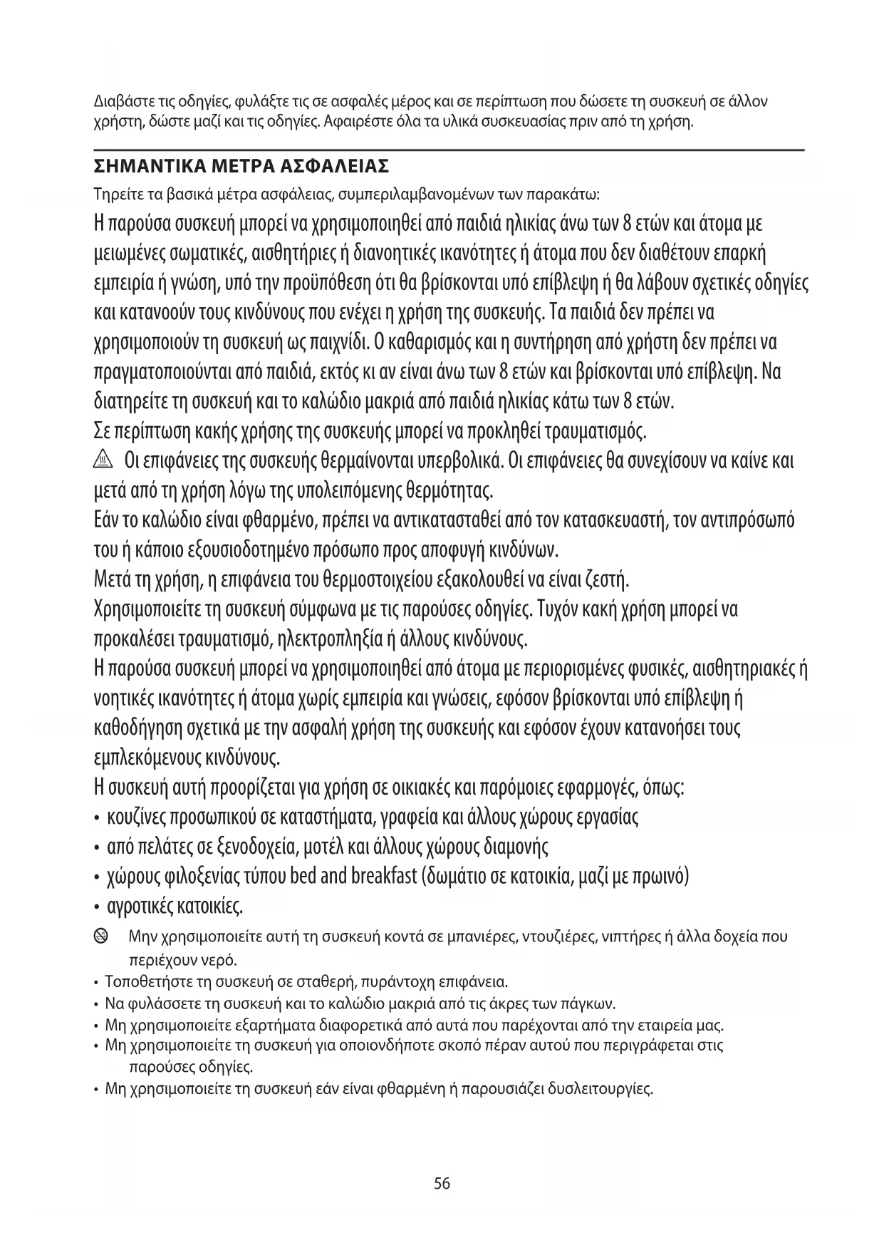 Τηρείτε τα βασικά μέτρα ασφάλειας, συμπεριλαμβανομένων των παρακάτω: Η παρούσα συσκευή μπορεί να χρησιμοποιηθεί από παιδιά ηλικίας άνω των 8 ετών και άτομα με μειωμένες σωματικές, αισθητήριες ή διανοητικές ικανότητες ή άτομα που δεν διαθέτουν επαρκή εμπειρία ή γνώση, υπό την προϋπόθεση ότι θα βρίσκονται υπό επίβλεψη ή θα λάβουν σχετικές οδηγίες και κατανοούν τους κινδύνους που ενέχει η χρήση της συσκευής. Τα παιδιά δεν πρέπει να χρησιμοποιούν τη συσκευή ως παιχνίδι. Ο καθαρισμός και η συντήρηση από χρήστη δεν πρέπει να πραγματοποιούνται από παιδιά, εκτός κι αν είναι άνω των 8 ετών και βρίσκονται υπό επίβλεψη. Να διατηρείτε τη συσκευή και το καλώδιο μακριά από παιδιά ηλικίας κάτω των 8 ετών. Σε περίπτωση κακής χρήσης της συσκευής μπορεί να προκληθεί τραυματισμός. h Οι επιφάνειες της συσκευής θερμαίνονται υπερβολικά. Οι επιφάνειες θα συνεχίσουν να καίνε και μετά από τη χρήση λόγω της υπολειπόμενης θερμότητας. Εάν το καλώδιο είναι φθαρμένο, πρέπει να αντικατασταθεί από τον κατασκευαστή, τον αντιπρόσωπό του ή κάποιο εξουσιοδοτημένο πρόσωπο προς αποφυγή κινδύνων. Μετά τη χρήση, η επιφάνεια του θερμοστοιχείου εξακολουθεί να είναι ζεστή. Χρησιμοποιείτε τη συσκευή σύμφωνα με τις παρούσες οδηγίες. Τυχόν κακή χρήση μπορεί να προκαλέσει τραυματισμό, ηλεκτροπληξία ή άλλους κινδύνους. Η παρούσα συσκευή μπορεί να χρησιμοποιηθεί από άτομα με περιορισμένες φυσικές, αισθητηριακές ή νοητικές ικανότητες ή άτομα χωρίς εμπειρία και γνώσεις, εφόσον βρίσκονται υπό επίβλεψη ή καθοδήγηση σχετικά με την ασφαλή χρήση της συσκευής και εφόσον έχουν κατανοήσει τους εμπλεκόμενους κινδύνους. Η συσκευή αυτή προορίζεται για χρήση σε οικιακές και παρόμοιες εφαρμογές, όπως: