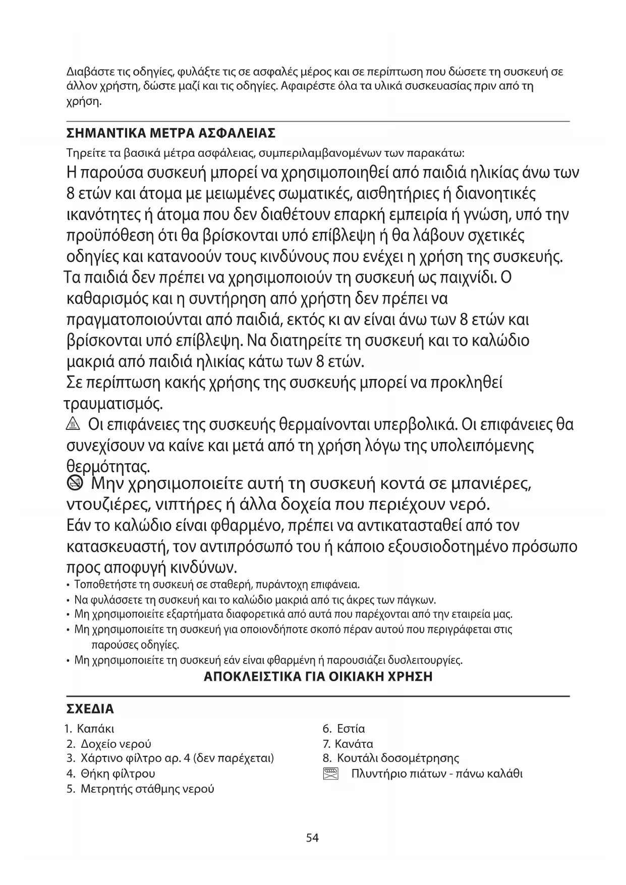 Τηρείτε τα βασικά μέτρα ασφάλειας, συμπεριλαμβανομένων των παρακάτω: Η παρούσα συσκευή μπορεί να χρησιμοποιηθεί από παιδιά ηλικίας άνω των 8 ετών και άτομα με μειωμένες σωματικές, αισθητήριες ή διανοητικές ικανότητες ή άτομα που δεν διαθέτουν επαρκή εμπειρία ή γνώση, υπό την προϋπόθεση ότι θα βρίσκονται υπό επίβλεψη ή θα λάβουν σχετικές οδηγίες και κατανοούν τους κινδύνους που ενέχει η χρήση της συσκευής. Τα παιδιά δεν πρέπει να χρησιμοποιούν τη συσκευή ως παιχνίδι. Ο καθαρισμός και η συντήρηση από χρήστη δεν πρέπει να πραγματοποιούνται από παιδιά, εκτός κι αν είναι άνω των 8 ετών και βρίσκονται υπό επίβλεψη. Να διατηρείτε τη συσκευή και το καλώδιο μακριά από παιδιά ηλικίας κάτω των 8 ετών. Σε περίπτωση κακής χρήσης της συσκευής μπορεί να προκληθεί τραυματισμός. h Οι επιφάνειες της συσκευής θερμαίνονται υπερβολικά. Οι επιφάνειες θα συνεχίσουν να καίνε και μετά από τη χρήση λόγω της υπολειπόμενης θερμότητας. b Μην χρησιμοποιείτε αυτή τη συσκευή κοντά σε μπανιέρες, ντουζιέρες, νιπτήρες ή άλλα δοχεία που περιέχουν νερό. Εάν το καλώδιο είναι φθαρμένο, πρέπει να αντικατασταθεί από τον κατασκευαστή, τον αντιπρόσωπό του ή κάποιο εξουσιοδοτημένο πρόσωπο προς αποφυγή κινδύνων.