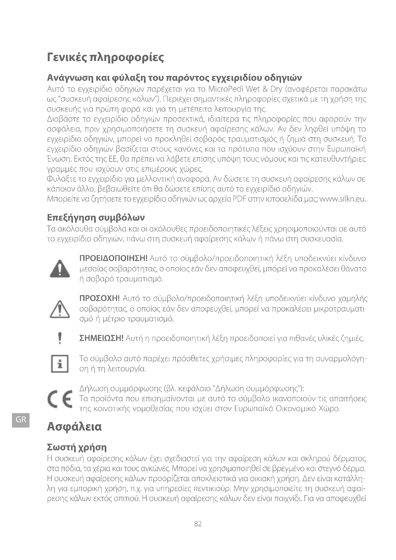 Γενικές πληροφορίες Ανάγνωση και φύλαξη του παρόντος εγχειριδίου οδηγιών Αυτό το εγχειρίδιο οδηγιών παρέχεται για το MicroPedi Wet & Dry (αναφέρεται παρακάτω ως “συσκευή αφαίρεσης κάλων”). Περιέχει σημαντικές πληροφορίες σχετικά με τη χρήση της συσκευής για πρώτη φορά και για τη μετέπειτα λειτουργία της. Διαβάστε το εγχειρίδιο οδηγιών προσεκτικά, ιδιαίτερα τις πληροφορίες που αφορούν την ασφάλεια, πριν χρησιμοποιήσετε τη συσκευή αφαίρεσης κάλων. Αν δεν ληφθεί υπόψη το εγχειρίδιο οδηγιών, μπορεί να προκληθεί σοβαρός τραυματισμός ή ζημιά στη συσκευή. Το εγχειρίδιο οδηγιών βασίζεται στους κανόνες και τα πρότυπα που ισχύουν στην Ευρωπαϊκή Ένωση. Εκτός της ΕΕ, θα πρέπει να λάβετε επίσης υπόψη τους νόμους και τις κατευθυντήριες γραμμές που ισχύουν στις επιμέρους χώρες. Φυλάξτε το εγχειρίδιο για μελλοντική αναφορά. Αν δώσετε τη συσκευή αφαίρεσης κάλων σε κάποιον άλλο, βεβαιωθείτε ότι θα δώσετε επίσης αυτό το εγχειρίδιο οδηγιών. Μπορείτε να ζητήσετε το εγχειρίδιο οδηγιών ως αρχείο PDF στην ιστοσελίδα μας: www.silkn.eu. Επεξήγηση συμβόλων Τα ακόλουθα σύμβολα και οι ακόλουθες προειδοποιητικές λέξεις χρησιμοποιούνται σε αυτό το εγχειρίδιο οδηγιών, πάνω στη συσκευή αφαίρεσης κάλων ή πάνω στη συσκευασία. ΠΡΟΕΙΔΟΠΟΙΗΣΗ! Αυτό το σύμβολο/προειδοποιητική λέξη υποδεικνύει κίνδυνο μεσαίας σοβαρότητας, ο οποίος εάν δεν αποφευχθεί, μπορεί να προκαλέσει θάνατο ή σοβαρό τραυματισμό. ΠΡΟΣΟΧΗ! Αυτό το σύμβολο/προειδοποιητική λέξη υποδεικνύει κίνδυνο χαμηλής σοβαρότητας, ο οποίος εάν δεν αποφευχθεί, μπορεί να προκαλέσει μικροτραυματι- σμό ή μέτριο τραυματισμό. ΣΗΜΕΙΩΣΗ! Αυτή η προειδοποιητική λέξη προειδοποιεί για πιθανές υλικές ζημιές. Το σύμβολο αυτό παρέχει πρόσθετες χρήσιμες πληροφορίες για τη συναρμολόγη- ση ή τη λειτουργία. Δήλωση συμμόρφωσης (βλ. κεφάλαιο “Δήλωση συμμόρφωσης”): Τα προϊόντα που επισημαίνονται με αυτό το σύμβολο ικανοποιούν τις απαιτήσεις της κοινοτικής νομοθεσίας που ισχύει στον Ευρωπαϊκό Οικονομικό Χώρο.