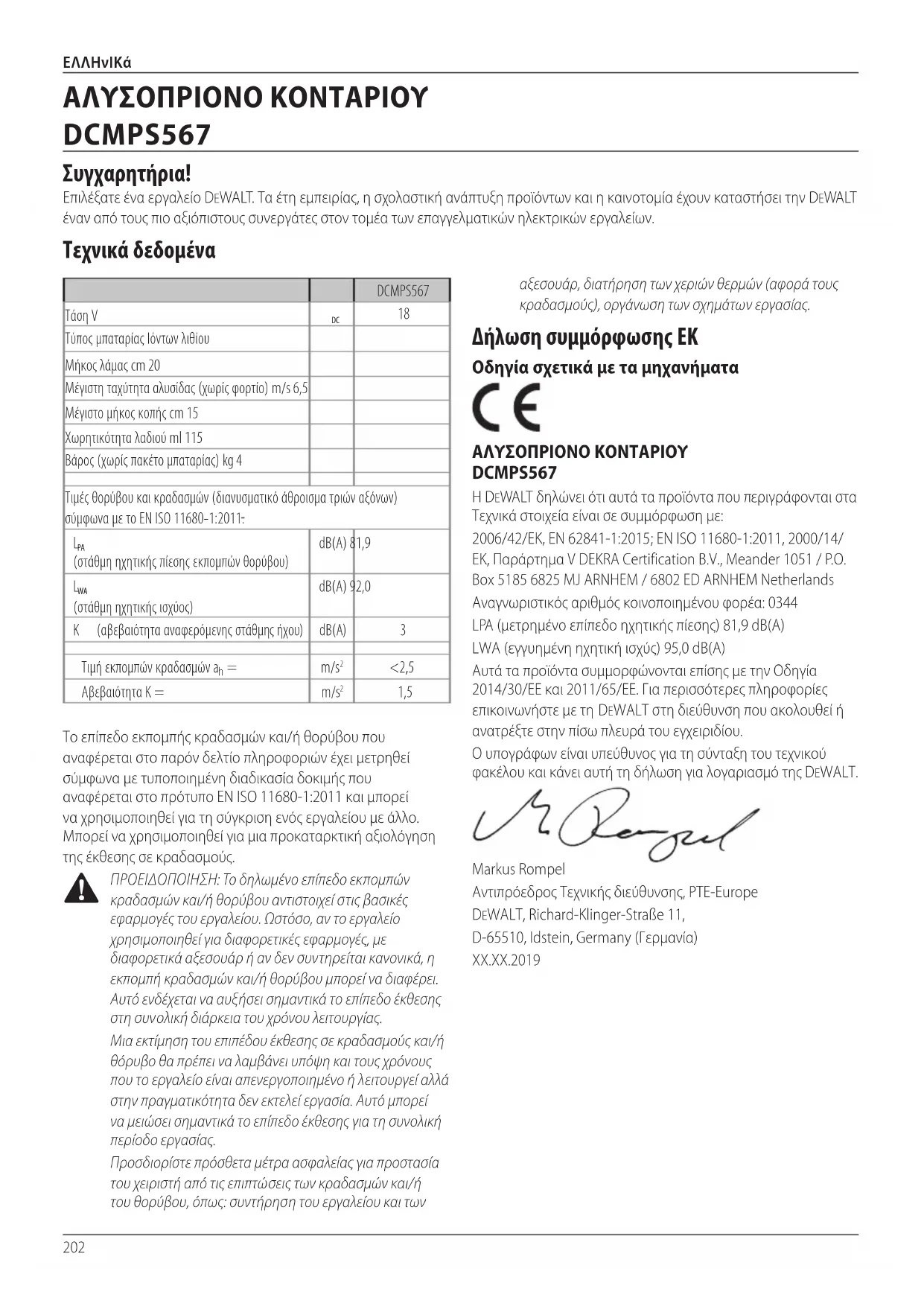 ΕΚ, Παράρτημα V DEKRA Certification B.V., Meander 1051 / P.O. Box 5185 6825 MJ ARNHEM / 6802 ED ARNHEM Netherlands Αναγνωριστικός αριθμός κοινοποιημένου φορέα: 0344 LPA (μετρημένο επίπεδο ηχητικής πίεσης) 81,9 dB(A) LWA (εγγυημένη ηχητική ισχύς) 95,0 dB(A) Αυτά τα προϊόντα συμμορφώνονται επίσης με την Οδηγία 2014/30/ΕΕ και 2011/65/ΕΕ. Για περισσότερες πληροφορίες επικοινωνήστε με τη DeWALT στη διεύθυνση που ακολουθεί ή ανατρέξτε στην πίσω πλευρά του εγχειριδίου. Ο υπογράφων είναι υπεύθυνος για τη σύνταξη του τεχνικού φακέλου και κάνει αυτή τη δήλωση για λογαριασμό της DeWALT. Markus Rompel Αντιπρόεδρος Τεχνικής διεύθυνσης, PTE-Europe DeWALT, Richard-Klinger-Straße 11, D-65510, Idstein, Germany (Γερμανία) XX.XX.2019203