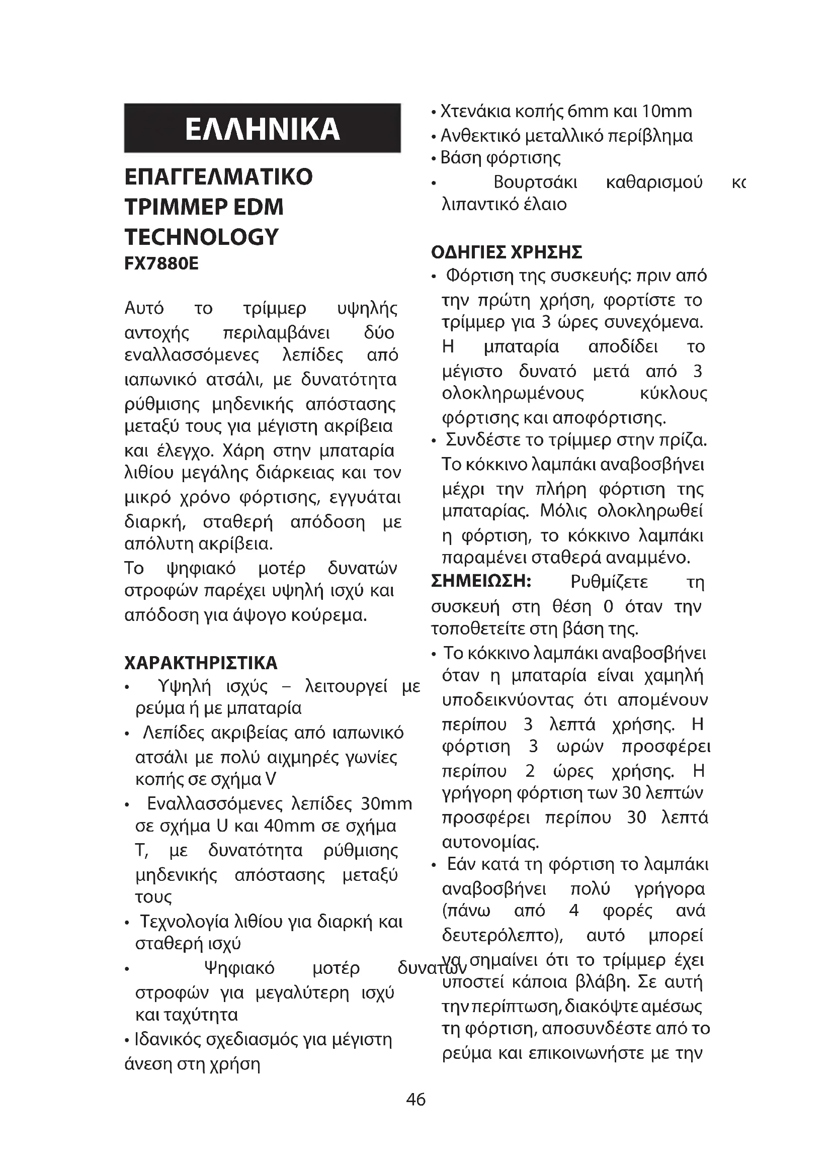 - Huollon jälkeen laita leikkuupää takaisin paikoilleen.46 ΕΠΑΓΓΕΛΜΑΤΙΚΟ TΡΙΜΜΕΡ EDM TECHNOLOGY FX7880E Αυτό το τρίμμερ υψηλής αντοχής περιλαμβάνει δύο εναλλασσόμενες λεπίδες από ιαπωνικό ατσάλι, με δυνατότητα ρύθμισης μηδενικής απόστασης μεταξύ τους για μέγιστη ακρίβεια και έλεγχο. Χάρη στην μπαταρία λιθίου μεγάλης διάρκειας και τον μικρό χρόνο φόρτισης, εγγυάται διαρκή, σταθερή απόδοση με απόλυτη ακρίβεια. Το ψηφιακό μοτέρ δυνατών στροφών παρέχει υψηλή ισχύ και απόδοση για άψογο κούρεμα. ΧΑΡΑΚΤΗΡΙΣΤΙΚΑ