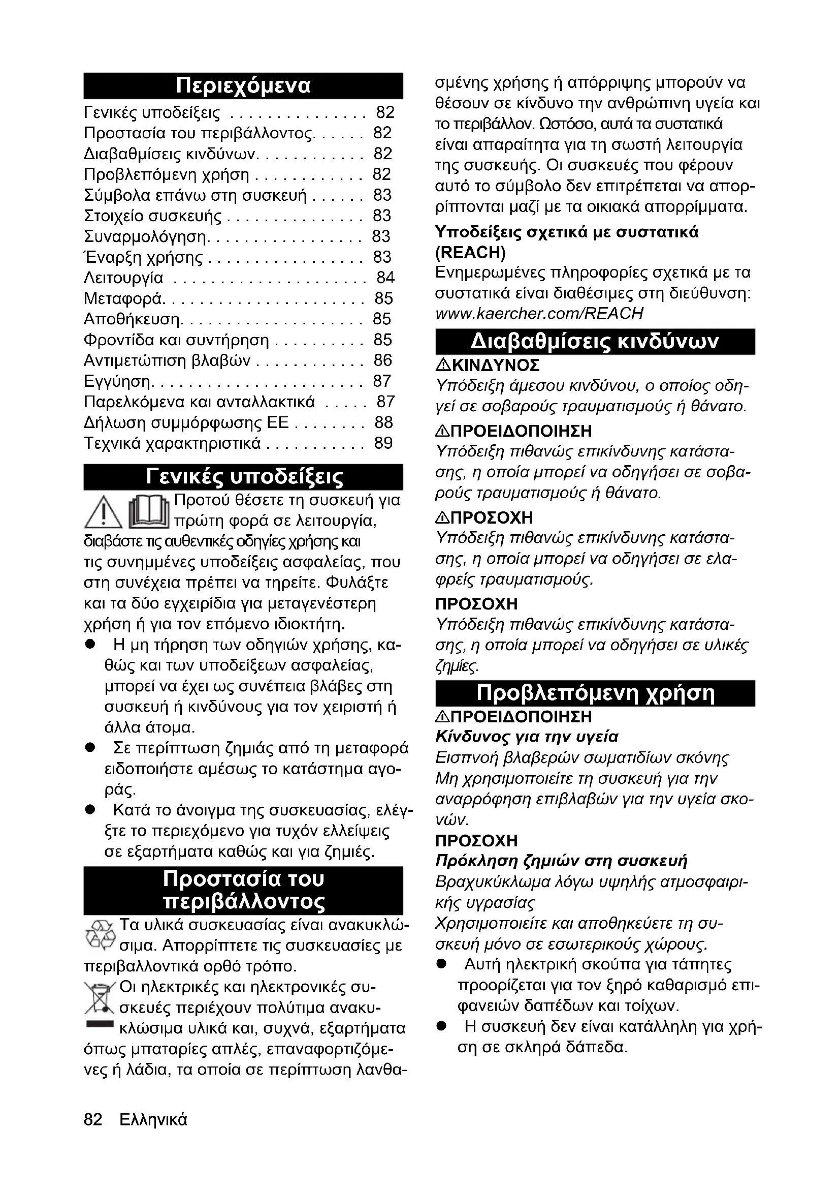 Κατά το άνοιγμα της συσκευασίας, ελέγ- ξτε το περιεχόμενο για τυχόν ελλείψεις σε εξαρτήματα καθώς και για ζημιές. Προστασία του περιβάλλοντος Τα υλικά συσκευασίας είναι ανακυκλώ- σιμα. Απορρίπτετε τις συσκευασίες με περιβαλλοντικά ορθό τρόπο. Οι ηλεκτρικές και ηλεκτρονικές συ- σκευές περιέχουν πολύτιμα ανακυ- κλώσιμα υλικά και, συχνά, εξαρτήματα όπως μπαταρίες απλές, επαναφορτιζόμε- νες ή λάδια, τα οποία σε περίπτωση λανθα- σμένης χρήσης ή απόρριψης μπορούν να θέσουν σε κίνδυνο την ανθρώπινη υγεία και το περιβάλλον. Ωστόσο, αυτά τα συστατικά είναι απαραίτητα για τη σωστή λειτουργία της συσκευής. Οι συσκευές που φέρουν αυτό το σύμβολο δεν επιτρέπεται να απορ- ρίπτονται μαζί με τα οικιακά απορρίμματα. Υποδείξεις σχετικά με συστατικά (REACH) Ενημερωμένες πληροφορίες σχετικά με τα συστατικά είναι διαθέσιμες στη διεύθυνση: www.kaercher.com/REACH Διαβαθμίσεις κινδύνων