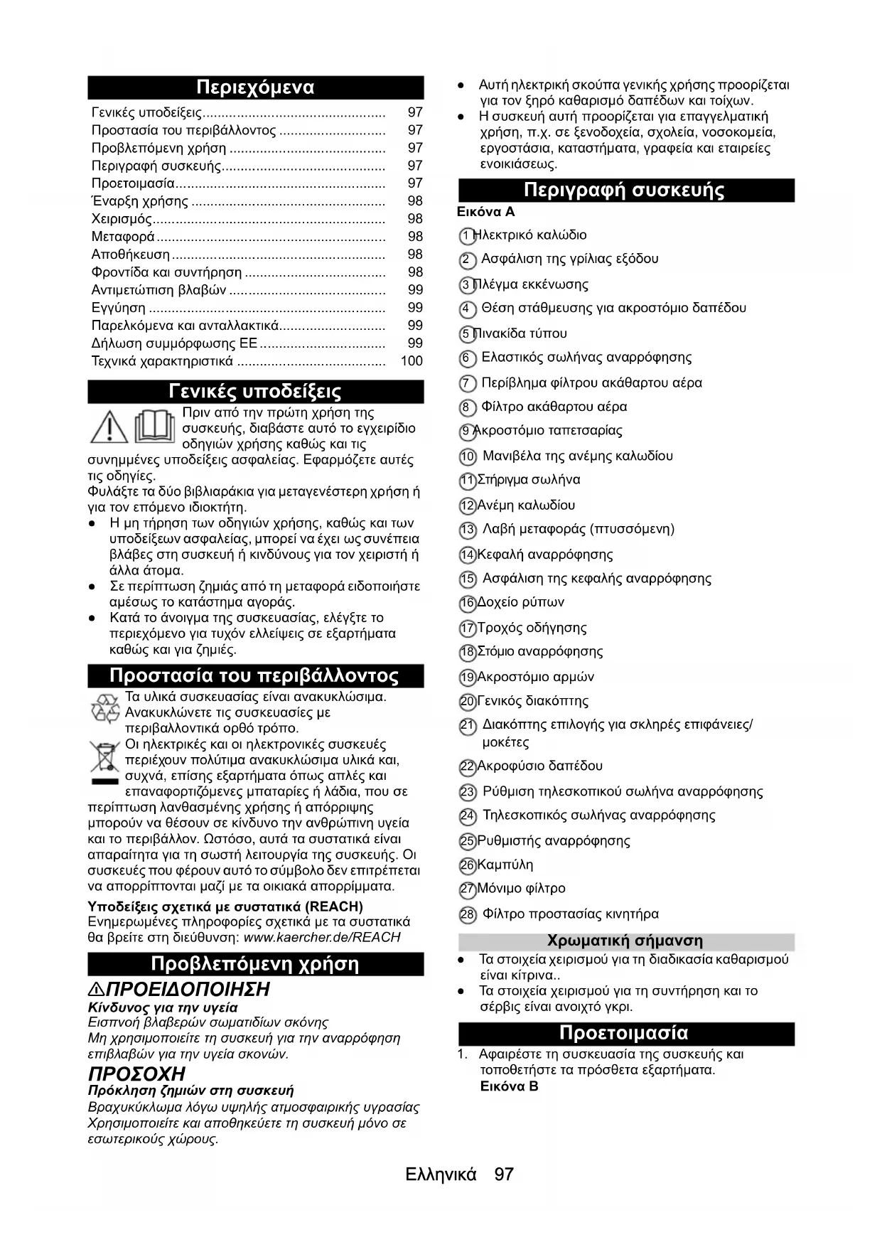 H05VV 2x1,0 GF H05VV 2x1,0 GF Broj dela (EU) 6.650-915.0 6.650-915.0 Broj dela (GB) 6.652-282.0 6.652-282.0 Broj dela (CH) 6.652-281.0 6.652-281.0 Dužina kabla m 12 12Ελληνικά 97 Περιεχόμενα Γενικές υποδείξεις Πριν από την πρώτη χρήση της συσκευής, διαβάστε αυτό το εγχειρίδιο οδηγιών χρήσης καθώς και τις συνημμένες υποδείξεις ασφαλείας. Εφαρμόζετε αυτές τις οδηγίες. Φυλάξτε τα δύο βιβλιαράκια για μεταγενέστερη χρήση ή για τον επόμενο ιδιοκτήτη. ●Η μη τήρηση των οδηγιών χρήσης, καθώς και των υποδείξεων ασφαλείας, μπορεί να έχει ως συνέπεια βλάβες στη συσκευή ή κινδύνους για τον χειριστή ή άλλα άτομα. ●Σε περίπτωση ζημιάς από τη μεταφορά ειδοποιήστε αμέσως το κατάστημα αγοράς. ●Κατά το άνοιγμα της συσκευασίας, ελέγξτε το περιεχόμενο για τυχόν ελλείψεις σε εξαρτήματα καθώς και για ζημιές. Προστασία του περιβάλλοντος Τα υλικά συσκευασίας είναι ανακυκλώσιμα. Ανακυκλώνετε τις συσκευασίες με περιβαλλοντικά ορθό τρόπο. Οι ηλεκτρικές και οι ηλεκτρονικές συσκευές περιέχουν πολύτιμα ανακυκλώσιμα υλικά και, συχνά, επίσης εξαρτήματα όπως απλές και επαναφορτιζόμενες μπαταρίες ή λάδια, που σε περίπτωση λανθασμένης χρήσης ή απόρριψης μπορούν να θέσουν σε κίνδυνο την ανθρώπινη υγεία και το περιβάλλον . Ωστόσο, αυτά τα συστατικά είναι απαραίτητα για τη σωστή λειτουργία της συσκευής. Οι συσκευές που φέρουν αυτό το σύμβολο δεν επιτρέπεται να απορρίπτονται μαζί με τα οικιακά απορρίμματα. Υποδείξεις σχετικά με συστατικά (REACH) Ενημερωμένες πληροφορίες σχετικά με τα συστατικά θα βρείτε στη διεύθυνση: www.kaercher.de/REACH Προβλεπόμενη χρήση 몇 ΠΡΟΕΙΔΟΠΟΙΗΣΗ Κίνδυνος για την υγεία Εισπνοή βλαβερών σωματιδίων σκόνης Μη χρησιμοποιείτε τη συσκευή για την αναρρόφηση επιβλαβών για την υγεία σκονών.