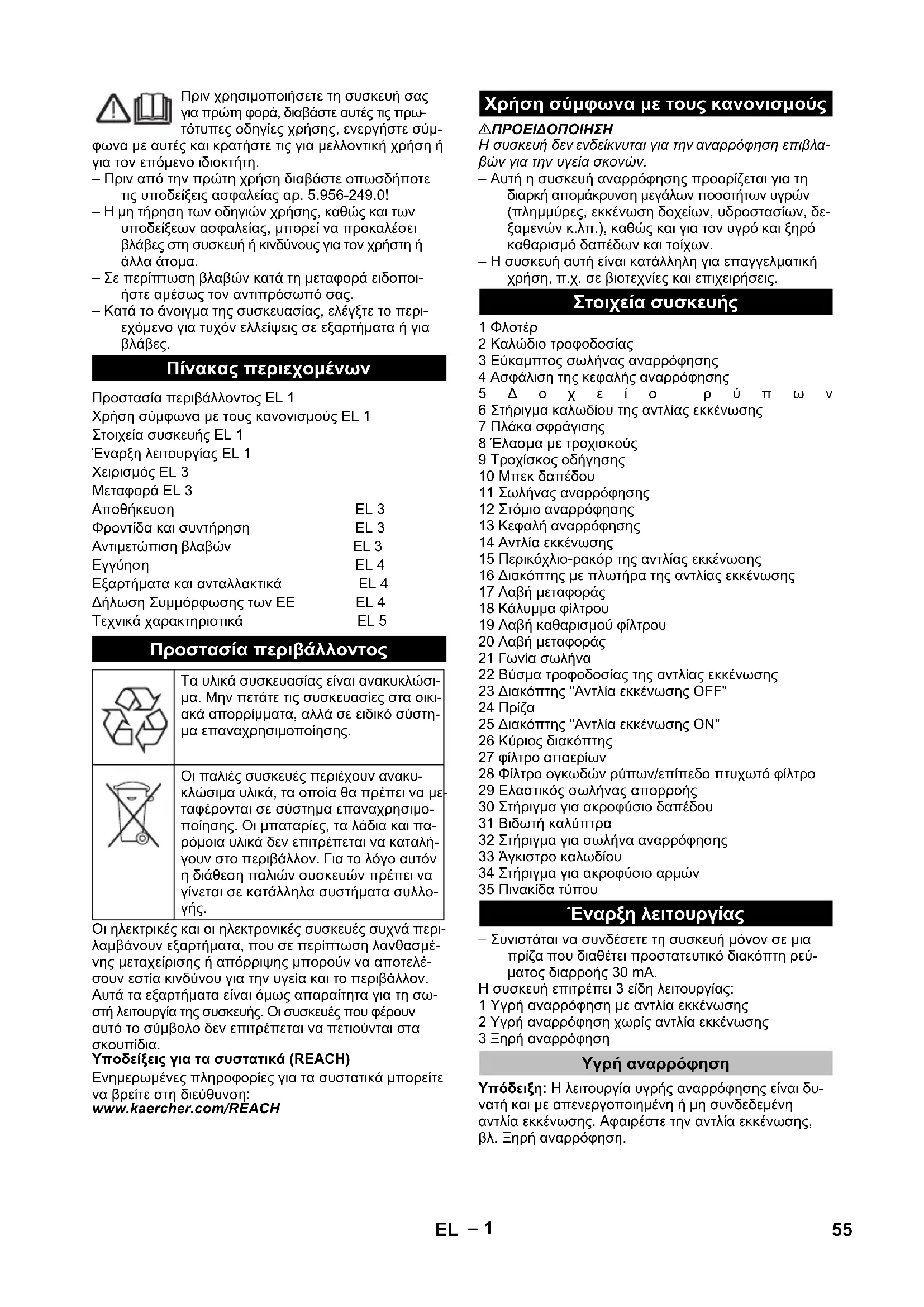 Χρήση σύμφωνα με τους κανονισμούς Στοιχεία συσκευής Έναρξη λειτουργίας Υγρή αναρρόφηση 55EL– 2
