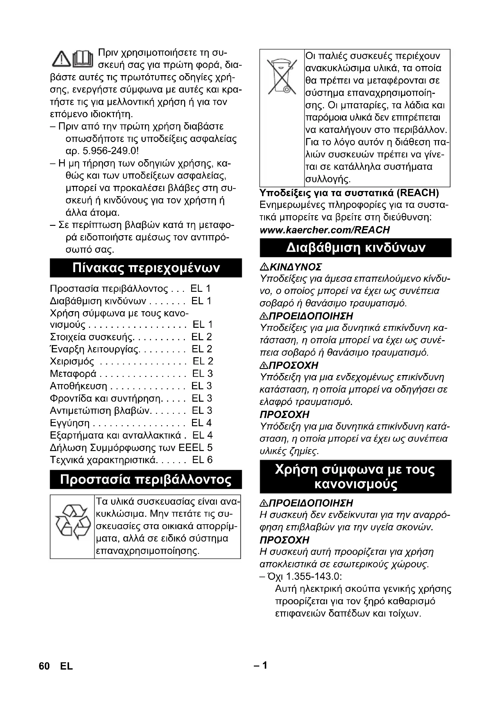 αποκλειστικά σε εσωτερικούς χώρους. – Όχι 1.355-143.0: Αυτή ηλεκτρική σκούπα γενικής χρήσης προορίζεται για τον ξηρό καθαρισμό επιφανειών δαπέδων και τοίχων. Πίνακας περιεχομένων Προστασία περιβάλλοντος . . . EL 1 Διαβάθμιση κινδύνων . . . . . . . EL 1 Χρήση σύμφωνα με τους κανο- νισμούς . . . . . . . . . . . . . . . . . . EL 1 Στοιχεία συσκευής. . . . . . . . . . EL 2 Έναρξη λειτουργίας. . . . . . . . . EL 2 Χειρισμός . . . . . . . . . . . . . . . . EL 2 Μεταφορά . . . . . . . . . . . . . . . . EL 3 Αποθήκευση . . . . . . . . . . . . . . EL 3 Φροντίδα και συντήρηση. . . . . EL 3 Αντιμετώπιση βλαβών. . . . . . . EL 3 Εγγύηση . . . . . . . . . . . . . . . . . EL 4 Εξαρτήματα και ανταλλακτικά . EL 4 Δήλωση Συμμόρφωσης των ΕEEL 5 Τεχνικά χαρακτηριστικά. . . . . . EL 6 Προστασία περιβάλλοντος Τα υλικά συσκευασίας είναι ανα- κυκλώσιμα. Μην πετάτε τις συ- σκευασίες στα οικιακά απορρίμ- ματα, αλλά σε ειδικό σύστημα επαναχρησιμοποίησης. Οι παλιές συσκευές περιέχουν ανακυκλώσιμα υλικά, τα οποία θα πρέπει να μεταφέρονται σε σύστημα επαναχρησιμοποίη- σης. Οι μπαταρίες, τα λάδια και παρόμοια υλικά δεν επιτρέπεται να καταλήγουν στο περιβάλλον. Για το λόγο αυτόν η διάθεση πα- λιών συσκευών πρέπει να γίνε- ται σε κατάλληλα συστήματα