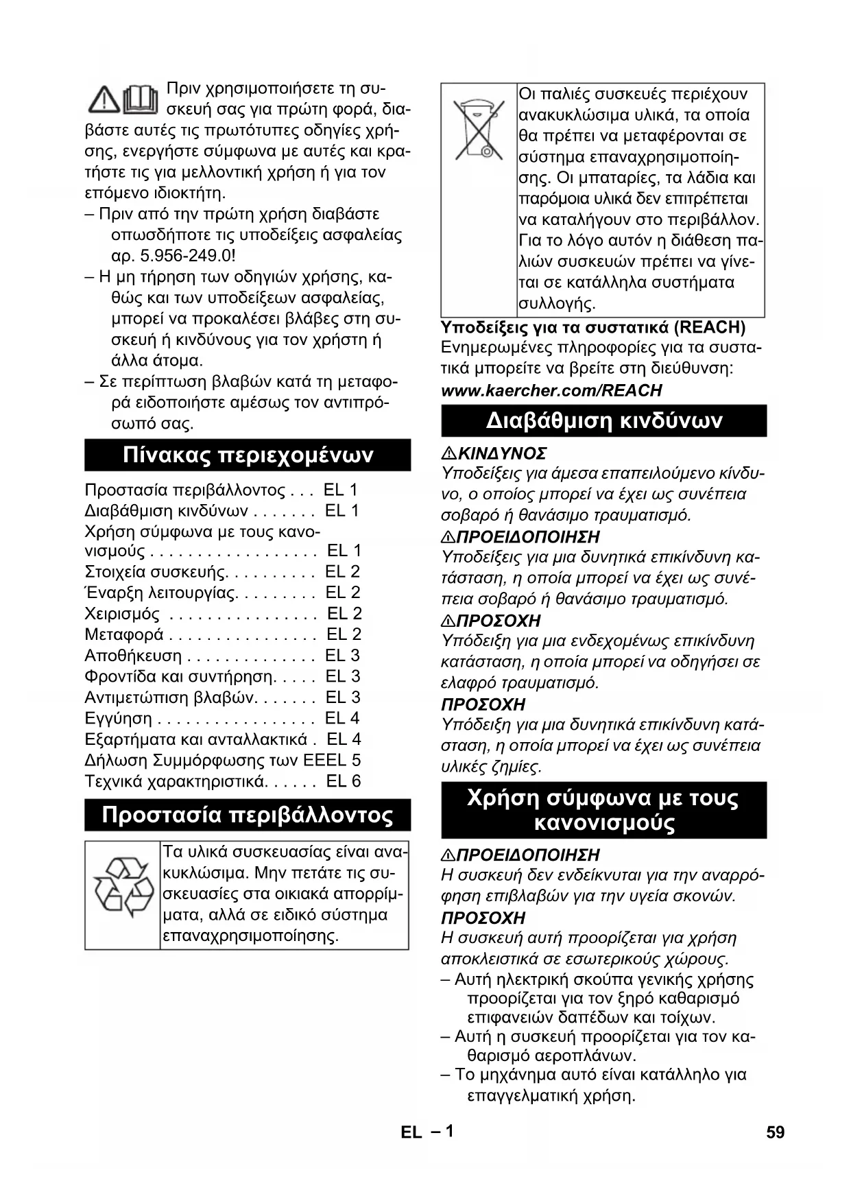 αποκλειστικά σε εσωτερικούς χώρους. – Αυτή ηλεκτρική σκούπα γενικής χρήσης προορίζεται για τον ξηρό καθαρισμό επιφανειών δαπέδων και τοίχων. – Αυτή η συσκευή προορίζεται για τον κα- θαρισμό αεροπλάνων. – Το μηχάνημα αυτό είναι κατάλληλο για επαγγελματική χρήση. Πίνακας περιεχομένων Προστασία περιβάλλοντος . . . EL 1 Διαβάθμιση κινδύνων . . . . . . . EL 1 Χρήση σύμφωνα με τους κανο- νισμούς . . . . . . . . . . . . . . . . . . EL 1 Στοιχεία συσκευής. . . . . . . . . . EL 2 Έναρξη λειτουργίας. . . . . . . . . EL 2 Χειρισμός . . . . . . . . . . . . . . . . EL 2 Μεταφορά . . . . . . . . . . . . . . . . EL 2 Αποθήκευση . . . . . . . . . . . . . . EL 3 Φροντίδα και συντήρηση. . . . . EL 3 Αντιμετώπιση βλαβών. . . . . . . EL 3 Εγγύηση . . . . . . . . . . . . . . . . . EL 4 Εξαρτήματα και ανταλλακτικά . EL 4 Δήλωση Συμμόρφωσης των ΕEEL 5 Τεχνικά χαρακτηριστικά. . . . . . EL 6 Προστασία περιβάλλοντος Τα υλικά συσκευασίας είναι ανα- κυκλώσιμα. Μην πετάτε τις συ- σκευασίες στα οικιακά απορρίμ- ματα, αλλά σε ειδικό σύστημα επαναχρησιμοποίησης. Οι παλιές συσκευές περιέχουν ανακυκλώσιμα υλικά, τα οποία θα πρέπει να μεταφέρονται σε σύστημα επαναχρησιμοποίη- σης. Οι μπαταρίες, τα λάδια και παρόμοια υλικά δεν επιτρέπεται να καταλήγουν στο περιβάλλον. Για το λόγο αυτόν η διάθεση πα- λιών συσκευών πρέπει να γίνε- ται σε κατάλληλα συστήματα