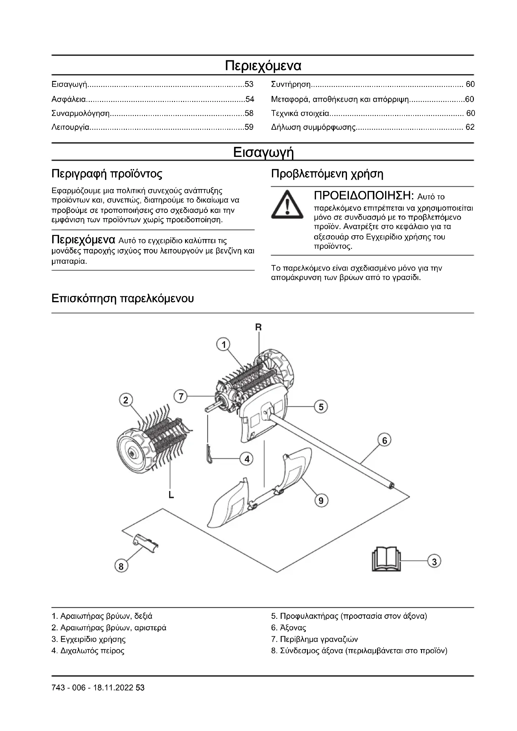 Ορισμοί για την ασφάλεια Για την επισήμανση ειδικών σημαντικών τμημάτων του εγχειριδίου χρήσης χρησιμοποιούνται προειδοποιήσεις, συστάσεις προσοχής και σημειώσεις. ΠΡΟΕΙΔΟΠΟΙΗΣΗ: Χρησιμοποιείται όταν υπάρχει κίνδυνος τραυματισμού ή θανάτου του χειριστή ή άλλων παριστάμενων ατόμων, αν δεν τηρηθούν οι οδηγίες που παρέχονται στο εγχειρίδιο. ΠΡΟΣΟΧΗ: Χρησιμοποιείται όταν υπάρχει κίνδυνος πρόκλησης ζημιάς στο προϊόν ή/και στο παρελκόμενο, σε άλλα υλικά ή στον παρακείμενο χώρο, αν δεν τηρηθούν οι οδηγίες που παρέχονται στο εγχειρίδιο. 54 743 - 006 - 18.11.2022Περιεχόμενα Χρησιμοποιείται για παροχή περισσότερων πληροφοριών, οι οποίες χρειάζονται σε μια δεδομένη κατάσταση. Γενικές οδηγίες ασφαλείας ΠΡΟΕΙΔΟΠΟΙΗΣΗ: Προτού χρησιμοποιήσετε το παρελκόμενο, διαβάστε τις παρακάτω οδηγίες ασφαλείας.
