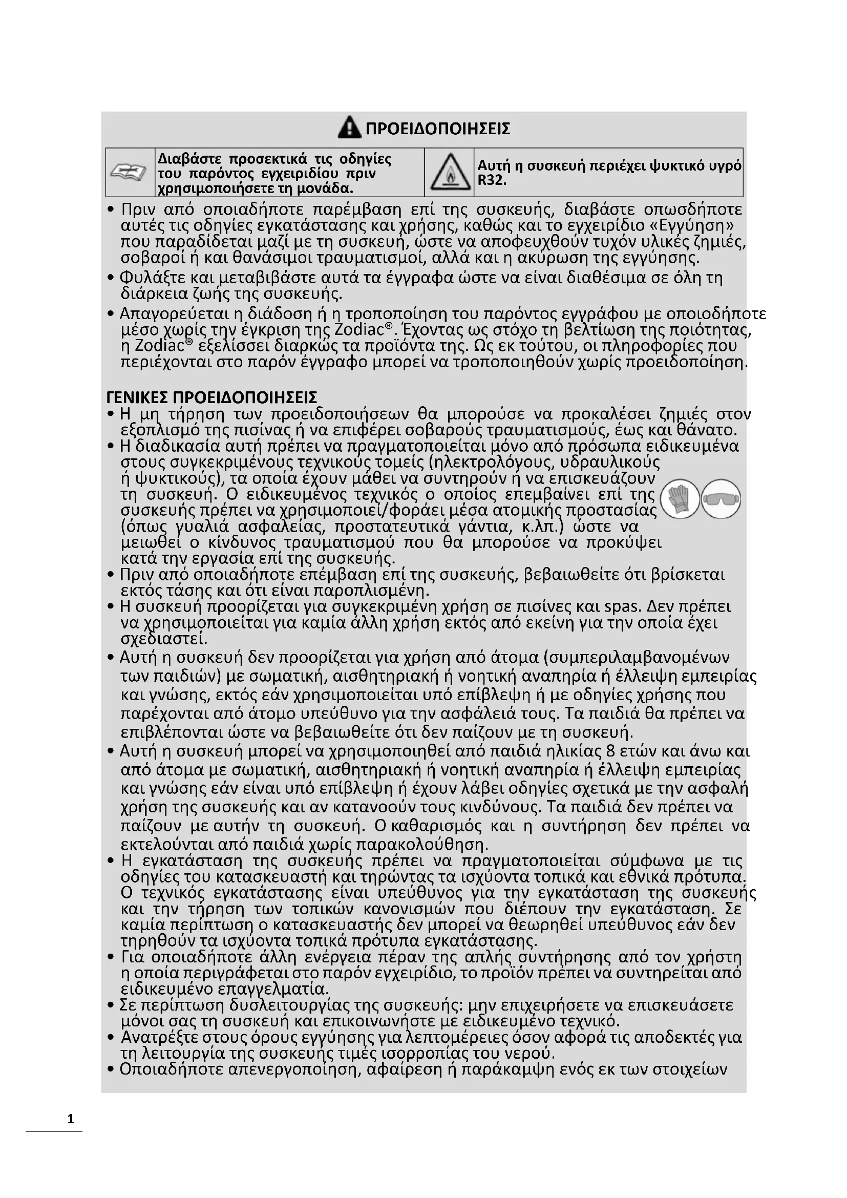 - Απαγορεύεται η διάδοση ή η τροποποίηση του παρόντος εγγράφου με οποιοδήποτε μέσο χωρίς την έγκριση της Zodiac®. Έχοντας ως στόχο τη βελτίωση της ποιότητας, η Zodiac® εξελίσσει διαρκώς τα προϊόντα της. Ως εκ τούτου, οι πληροφορίες που περιέχονται στο παρόν έγγραφο μπορεί να τροποποιηθούν χωρίς προειδοποίηση. ΓΕΝΙΚΕΣ ΠΡΟΕΙΔΟΠΟΙΗΣΕΙΣ
