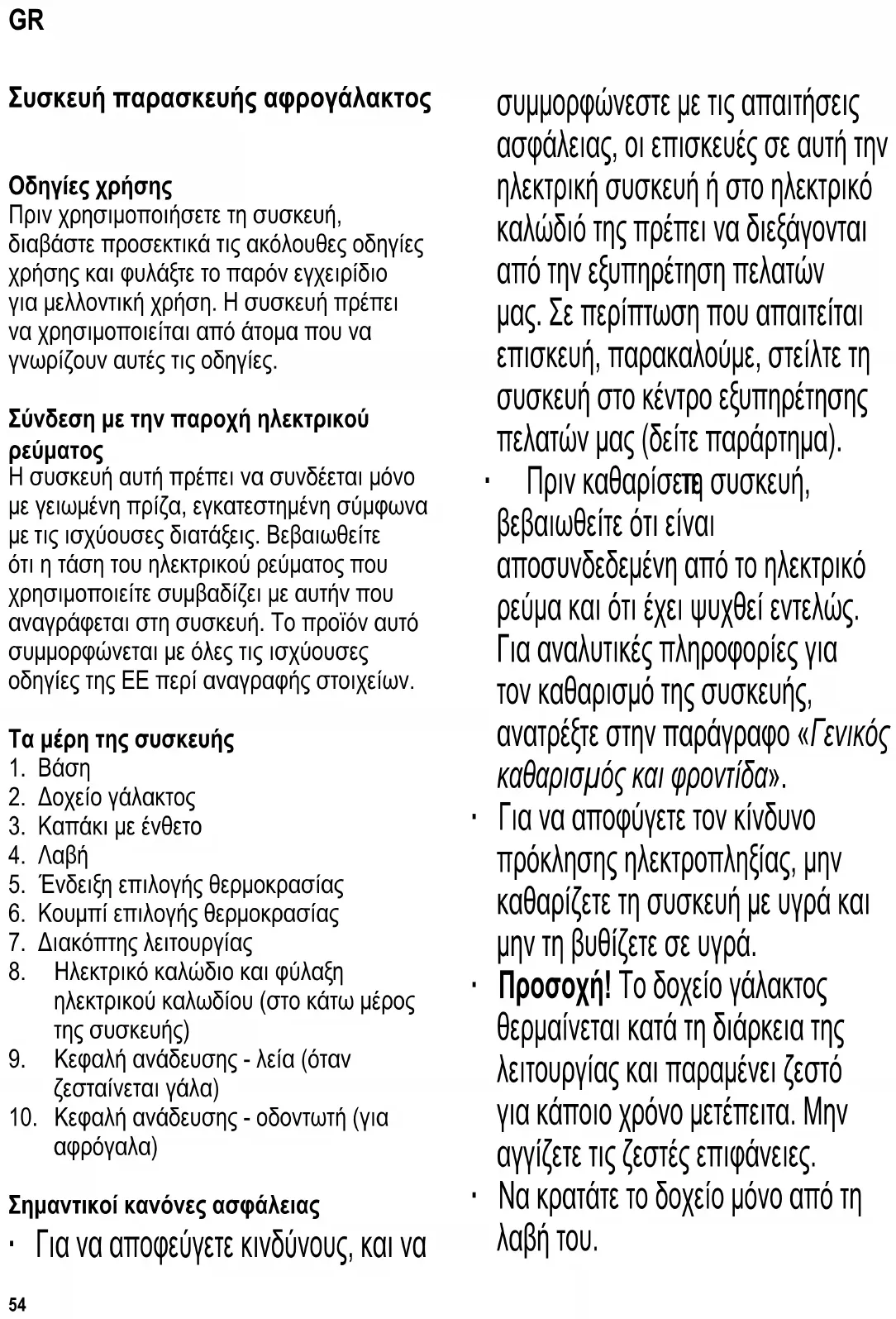 je dokładnie zapakować i dołączyć imię, nazwisko i adres nadawcy oraz przyczynę odesłania. Jeśli urządzenie jest nadal na gwarancji, proszę także dołączyć paragon zakupu, lub fakturę zakupową.54 Συσκευή παρασκευής αφρογάλακτος Οδηγίες χρήσης Πριν χρησιμοποιήσετε τη συσκευή, διαβάστε προσεκτικά τις ακόλουθες οδηγίες χρήσης και φυλάξτε το παρόν εγχειρίδιο για μελλοντική χρήση. Η συσκευή πρέπει να χρησιμοποιείται από άτομα που να γνωρίζουν αυτές τις οδηγίες. Σύνδεση με την παροχή ηλεκτρικού