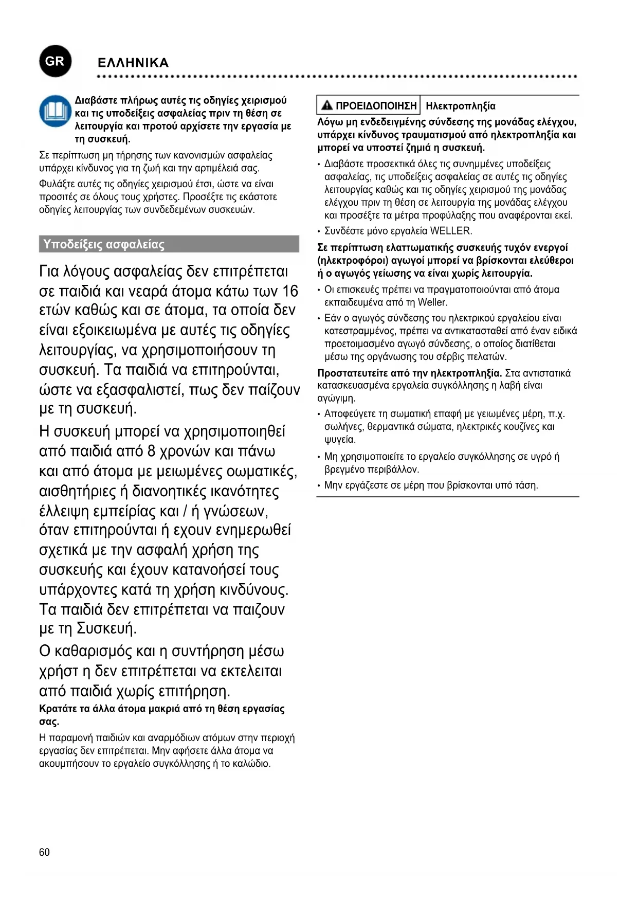 - Μη φέρετε εύφλεκτα αντικείμενα, υγρά ή αέρια κοντά στο καυτό εργαλείο συγκόλλησης. Το ηλεκτρικό καλώδιο επιτρέπεται να συνδεθεί μόνο σε εγκεκριμένες γι’ αυτό πρίζες του ρεύματος ή προσαρμογείς. Ελέγξτε,εάνητάσητουδικτύουταυτίζεται μετηντιμήστηνπινακίδατύπου.Συνδέστετησυσκευήστην πρίζαμόνοότανείναιαπενεργοποιημένη. Μη χρησιμοποιείτε το καλώδιο για σκοπούς, για τους οποίους δεν προορίζεται.Μη μεταφέρετε τη συσκευή ποτέ από το καλώδιο. Μη χρησιμοποιείτε το καλώδιο, για να τραβήξετε το φις από την πρίζα του ρεύματος. Προστατεύετε το καλώδιο από ζέστη, λάδι και κοφτερές ακμές. Να είστε προσεκτικοί. Προσέχετε, τι κάνετε. Δείξτε ιδιαίτερη σύνεση στην εργασία. Μη χρησιμοποιείτε το εργαλείο συγκόλλησης, όταν δεν είστε συγκεντρωμένοι. Αποφύγετε την ασυνήθιστη στάση του σώματος. Διαμορφώστε τη θέση εργασίας σας εργονομικά σωστά. Αποφύγετε την κακή στάση του σώματος κατά την εργασία, η κακή στάση του σώματος προκαλεί σωματικές βλάβες Το εργαλείο συγκόλλησης επιτρέπεται να τίθεται σε λειτουργία μόνο σε τεχνικά άψογη κατάσταση. Οι διατάξεις προστασίας δεν επιτρέπεται να τεθούν εκτός λειτουργίας. Οι βλάβες και τα ελαττώματα πρέπει να αποκαθίστανται αμέσως. Πριν από κάθε χρήση της συσκευής / του εργαλείου πρέπει να ελέγχονται οι διατάξεις προστασίας προσεκτικά για την άψογη και σύμφωνα με το σκοπό προορισμού λειτουργία τους. Ελέγξτε, εάν τα κινούμενα μέρη λειτουργούν άψογα και δε μαγκώνουν ή εάν κάποια μέρη είναι χαλασμένα. Όλα τα εξαρτήματα πρέπει να είναι σωστά συναρμολογημένα και να πληρούν όλες τις προϋποθέσεις, για την εξασφάλιση μιας άψογης λειτουργίας της συσκευής. Χρησιμοποιείτε το σωστό εργαλείο. Χρησιμοποιείτε μόνο εξαρτήματα ή πρόσθετες συσκευές, που αναφέρονται στον κατάλογο των εξαρτημάτων ή έχουν εγκριθεί από τον κατασκευαστή. Χρησιμοποιείτε εξαρτήματα ή πρόσθετες συσκευές WELLER μόνο στις γνήσιες συσκευές WELLER. Η χρήση άλλων εργαλείων και εξαρτημάτων μπορεί να σημαίνει για σας έναν κίνδυνο τραυματισμού. Ασφαλίστε το εργαλείο. Χρησιμοποιείτε διατάξεις σύσφιγξης για τη συγκράτηση του επεξεργαζόμενου