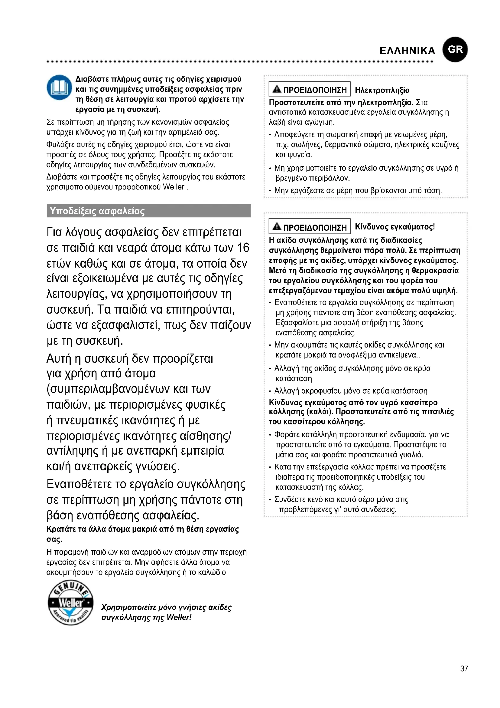 SUOMI37 Διαβάστε πλήρως αυτές τις οδηγίες χειρισμού και τις συνημμένες υποδείξεις ασφαλείας πριν τη θέση σε λειτουργία και προτού αρχίσετε την εργασία με τη συσκευή. Σε περίπτωση μη τήρησης των κανονισμών ασφαλείας υπάρχει κίνδυνος για τη ζωή και την αρτιμέλειά σας. Φυλάξτε αυτές τις οδηγίες χειρισμού έτσι, ώστε να είναι προσιτές σε όλους τους χρήστες. Προσέξτε τις εκάστοτε οδηγίες λειτουργίας των συνδεδεμένων συσκευών. Διαβάστε και προσέξτε τις οδηγίες λειτουργίας του εκάστοτε χρησιμοποιούμενου τροφοδοτικού Weller . Υποδείξεις ασφαλείας Για λόγους ασφαλείας δεν επιτρέπεται σε παιδιά και νεαρά άτομα κάτω των 16 ετών καθώς και σε άτομα, τα οποία δεν είναι εξοικειωμένα με αυτές τις οδηγίες λειτουργίας, να χρησιμοποιήσουν τη συσκευή. Τα παιδιά να επιτηρούνται, ώστε να εξασφαλιστεί, πως δεν παίζουν με τη συσκευή. Αυτή η συσκευή δεν προορίζεται για χρήση από άτομα (συμπεριλαμβανομένων και των παιδιών, με περιορισμένες φυσικές ή πνευματικές ικανότητες ή με περιορισμένες ικανότητες αίσθησης/ αντίληψης ή με ανεπαρκή εμπειρία και/ή ανεπαρκείς γνώσεις. Εναποθέτετε το εργαλείο συγκόλλησης σε περίπτωση μη χρήσης πάντοτε στη βάση εναπόθεσης ασφαλείας. Κρατάτε τα άλλα άτομα μακριά από τη θέση εργασίας