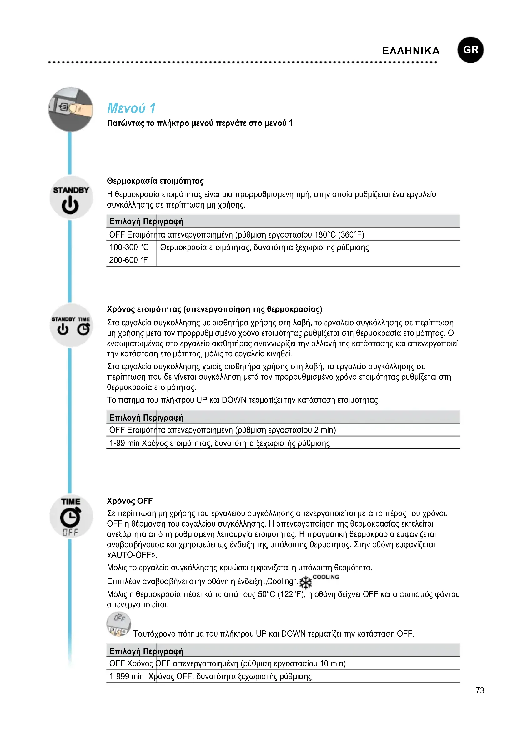 SUOMI73 Μενού 1 Πατώντας το πλήκτρο μενού περνάτε στο μενού 1 Θερμοκρασα ετοιμτητας Η θερμοκρασία ετοιμότητας είναι μια προρρυθμισμένη τιμή, στην οποία ρυθμίζεται ένα εργαλείο συγκόλλησης σε περίπτωση μη χρήσης. Επιλογή Περιγραφή OFF Ετοιμότητα απενεργοποιημένη (ρύθμιση εργοστασίου 180°C (360°F) 100-300 °C 200-600 °F Θερμοκρασία ετοιμότητας, δυνατότητα ξεχωριστής ρύθμισης Χρνος ετοιμτητας (απενεργοποηση της θερμοκρασας) Στα εργαλεία συγκόλλησης με αισθητήρα χρήσης στη λαβή, το εργαλείο συγκόλλησης σε περίπτωση μη χρήσης μετά τον προρρυθμισμένο χρόνο ετοιμότητας ρυθμίζεται στη θερμοκρασία ετοιμότητας. Ο ενσωματωμένος στο εργαλείο αισθητήρας αναγνωρίζει την αλλαγή της κατάστασης και απενεργοποιεί την κατάσταση ετοιμότητας, μόλις το εργαλείο κινηθεί. Στα εργαλεία συγκόλλησης χωρίς αισθητήρα χρήσης στη λαβή, το εργαλείο συγκόλλησης σε περίπτωση που δε γίνεται συγκόλληση μετά τον προρρυθμισμένο χρόνο ετοιμότητας ρυθμίζεται στη θερμοκρασία ετοιμότητας. Το πάτημα του πλήκτρου UP και DOWN τερματίζει την κατάσταση ετοιμότητας. Επιλογή Περιγραφή OFF Ετοιμότητα απενεργοποιημένη (ρύθμιση εργοστασίου 2 min) 1-99 min Χρόνος ετοιμότητας, δυνατότητα ξεχωριστής ρύθμισης Χρνος OFF Σε περίπτωση μη χρήσης του εργαλείου συγκόλλησης απενεργοποιείται μετά το πέρας του χρόνου OFF η θέρμανση του εργαλείου συγκόλλησης. Η απενεργοποίηση της θερμοκρασίας εκτελείται ανεξάρτητα από τη ρυθμισμένη λειτουργία ετοιμότητας. Η πραγματική θερμοκρασία εμφανίζεται αναβοσβήνουσα και χρησιμεύει ως ένδειξη της υπόλοιπης θερμότητας. Στην οθόνη εμφανίζεται «AUTO-OFF». Μόλις το εργαλείο συγκόλλησης κρυώσει εμφανίζεται η υπόλοιπη θερμότητα. Επιπλέον αναβοσβήνει στην οθόνη η ένδειξη „Cooling“. Μόλις η θερμοκρασία πέσει κάτω από τους 50°C (122°F), η οθόνη δείχνει OFF και ο φωτισμός φόντου απενεργοποιείται. Ταυτόχρονο πάτημα του πλήκτρου UP και DOWN τερματίζει την κατάσταση OFF. Επιλογή Περιγραφή OFF Χρόνος OFF απενεργοποιημένη (ρύθμιση εργοστασίου 10 min) 1-999 min Χρόνος OFF, δυνατότητα ξεχωριστής ρύθμισης