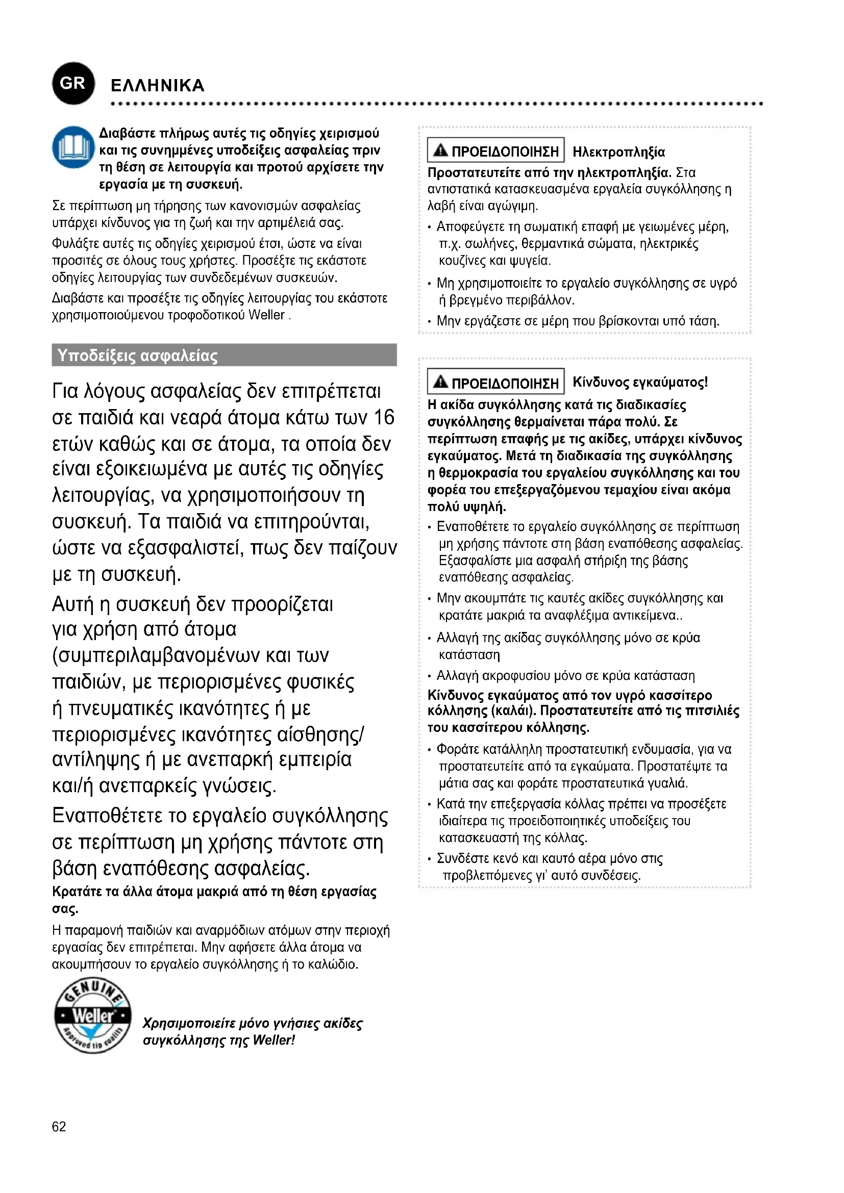 SUOMI62 Διαβάστε πλήρως αυτές τις οδηγίες χειρισμού και τις συνημμένες υποδείξεις ασφαλείας πριν τη θέση σε λειτουργία και προτού αρχίσετε την εργασία με τη συσκευή. Σε περίπτωση μη τήρησης των κανονισμών ασφαλείας υπάρχει κίνδυνος για τη ζωή και την αρτιμέλειά σας. Φυλάξτε αυτές τις οδηγίες χειρισμού έτσι, ώστε να είναι προσιτές σε όλους τους χρήστες. Προσέξτε τις εκάστοτε οδηγίες λειτουργίας των συνδεδεμένων συσκευών. Διαβάστε και προσέξτε τις οδηγίες λειτουργίας του εκάστοτε χρησιμοποιούμενου τροφοδοτικού Weller . Υποδείξεις ασφαλείας Για λόγους ασφαλείας δεν επιτρέπεται σε παιδιά και νεαρά άτομα κάτω των 16 ετών καθώς και σε άτομα, τα οποία δεν είναι εξοικειωμένα με αυτές τις οδηγίες λειτουργίας, να χρησιμοποιήσουν τη συσκευή. Τα παιδιά να επιτηρούνται, ώστε να εξασφαλιστεί, πως δεν παίζουν με τη συσκευή. Αυτή η συσκευή δεν προορίζεται για χρήση από άτομα (συμπεριλαμβανομένων και των παιδιών, με περιορισμένες φυσικές ή πνευματικές ικανότητες ή με περιορισμένες ικανότητες αίσθησης/ αντίληψης ή με ανεπαρκή εμπειρία και/ή ανεπαρκείς γνώσεις. Εναποθέτετε το εργαλείο συγκόλλησης σε περίπτωση μη χρήσης πάντοτε στη βάση εναπόθεσης ασφαλείας. Κρατάτε τα άλλα άτομα μακριά από τη θέση εργασίας