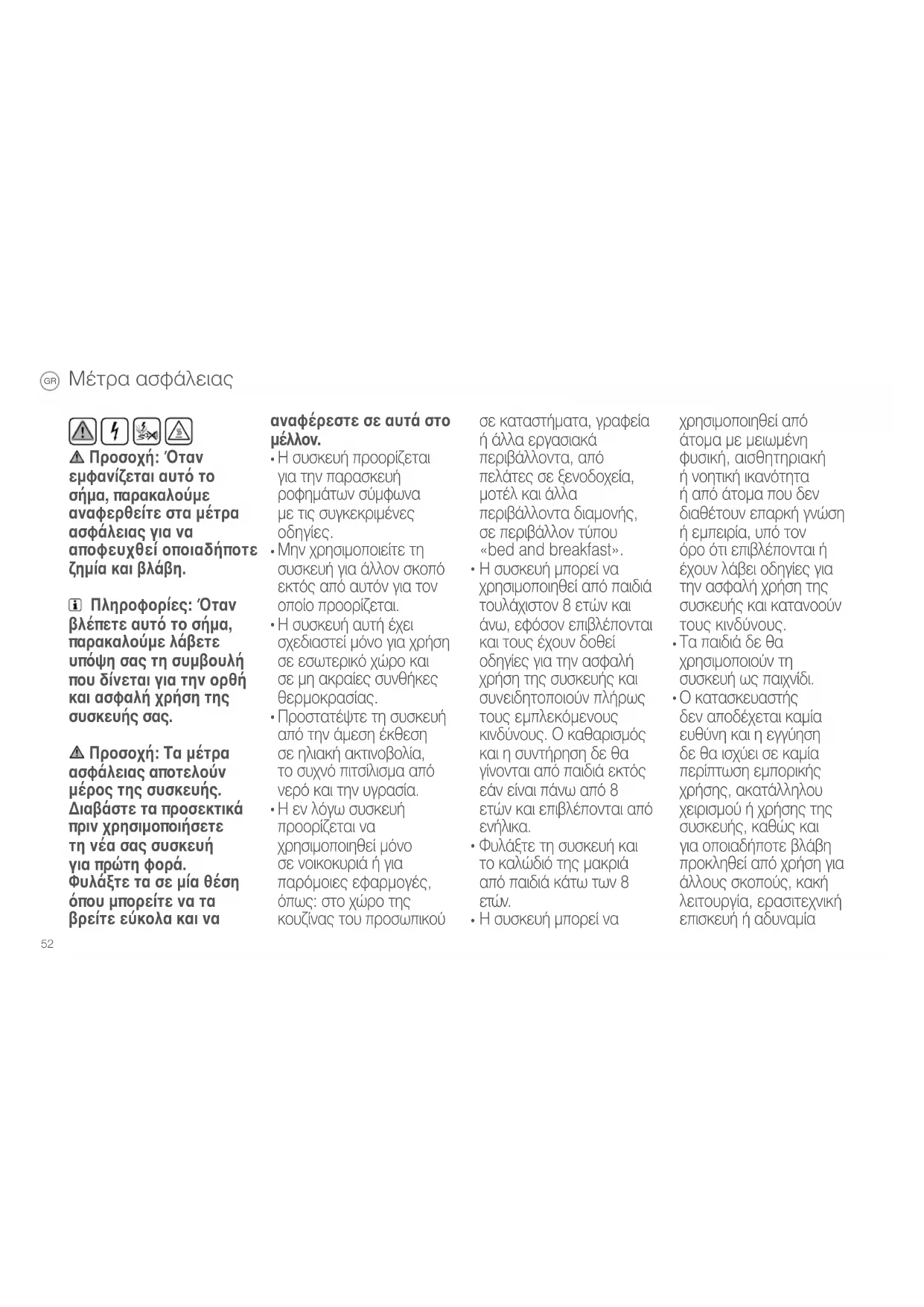 Ο κατασκευαστής δεν αποδέχεται καμία ευθύνη και η εγγύηση δε θα ισχύει σε καμία περίπτωση εμπορικής χρήσης, ακατάλληλου χειρισμού ή χρήσης της συσκευής, καθώς και για οποιαδήποτε βλάβη προκληθεί από χρήση για άλλους σκοπούς, κακή λειτουργία, ερασιτεχνική επισκευή ή αδυναμία Μέτρα ασφάλειας UM_NESPRESSO_ESSENZA_MINI_KRUPS.indb 52 21.03.17 15:26GR