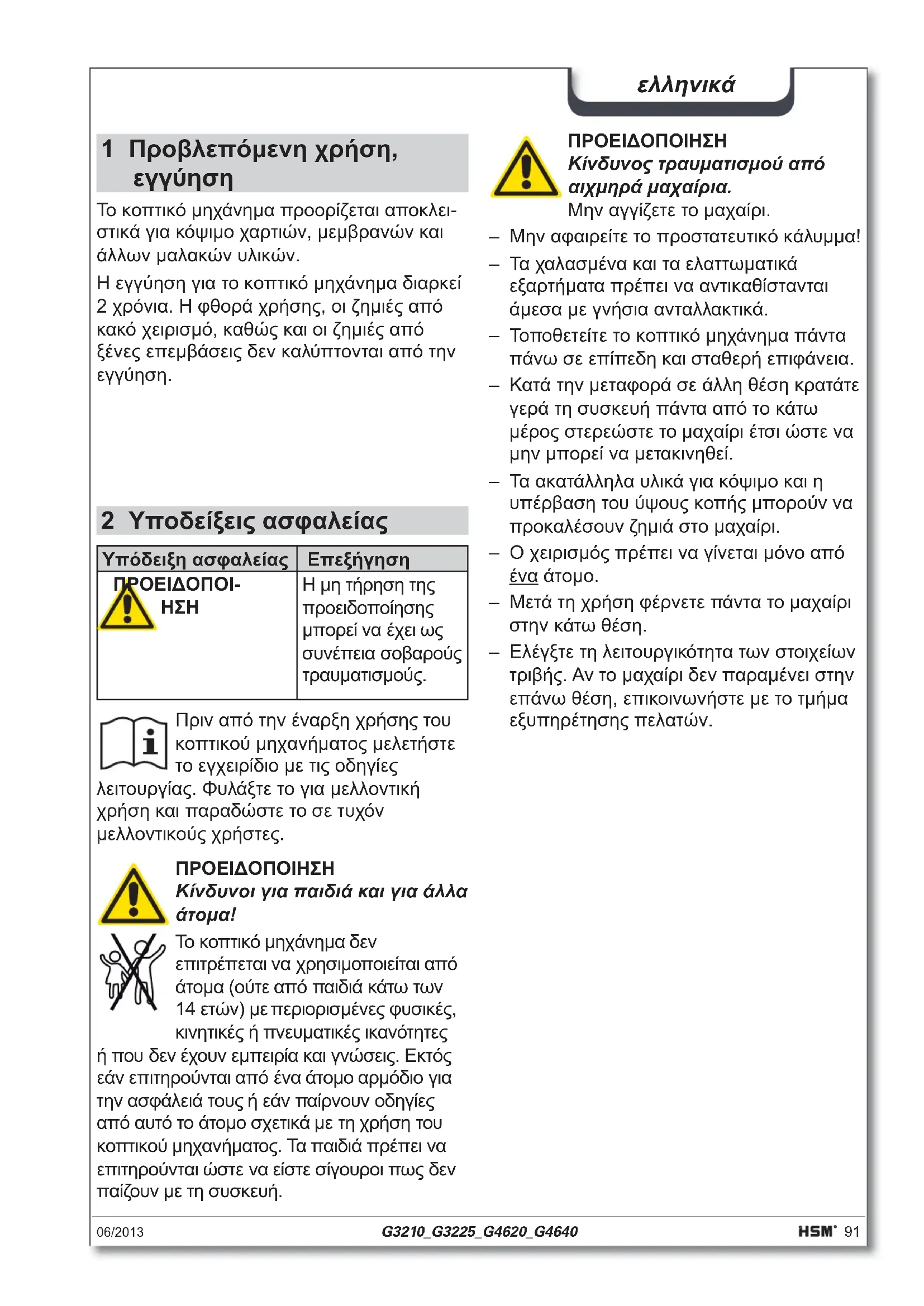 Η μη τήρηση της προειδοποίησης μπορεί να έχει ως συνέπεια σοβαρούς τραυματισμούς. Πριν από την έναρξη χρήσης του κοπτικού μηχανήματος μελετήστε το εγχειρίδιο με τις οδηγίες λειτουργίας. Φυλάξτε το για μελλοντική χρήση και παραδώστε το σε τυχόν μελλοντικούς χρήστες. ΠΡΟΕΙΔΟΠΟΙΗΣΗ Κίνδυνοι για παιδιά και για άλλα