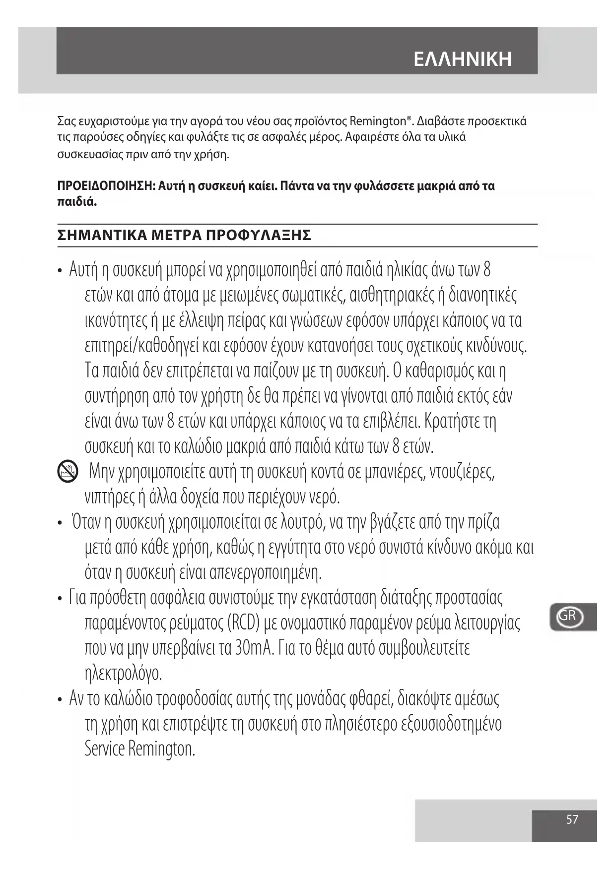 Για την αποφυγή προβλημάτων στο περιβάλλον και την υγεία λόγω επιβλαβών ουσιών, οι συσκευές και οι επαναφορτιζόμενες και μη επαναφορτιζόμενες μπαταρίες που επισημαίνονται με κάποιο από αυτά τα σύμβολα, δεν πρέπει να απορρίπτονται με τα κοινά οικιακά απορρίμματα. Να απορρίπτετε πάντα τις ηλεκτρικές και ηλεκτρονικές συσκευές και, όπου χρειάζεται, τις επαναφορτιζόμενες και μη επαναφορτιζόμενες μπαταρίες, σε κατάλληλο, επίσημο σημείο συλλογής/ανακύκλωσης.61 Zahvaljujemo se vam za nakup novega izdelka Remington®. Prosimo, da skrbno preberete ta navodila in jih varno shranite. Pred uporabo odstranite vso embalažo. OPOZORILO: Ta naprava je vroča. Vedno naj bo nedosegljiva otrokom.