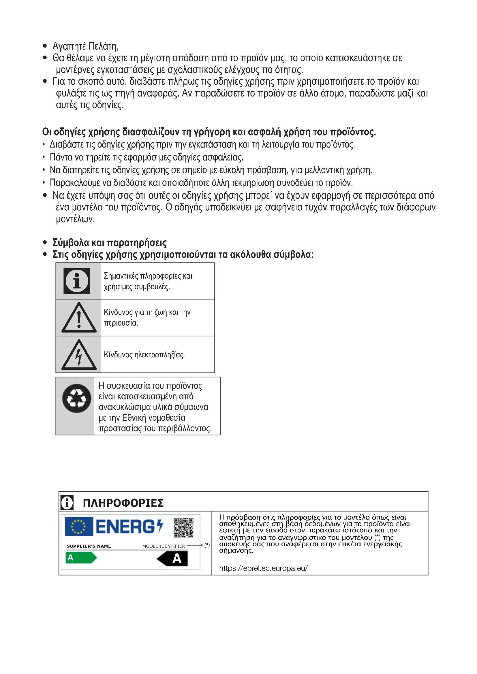 Η πρόσβαση στις πληροφορίες για το μοντέλο όπως είναι αποθηκευμένες στη βάση δεδομένων για τα προϊόντα είναι εφικτή με την είσοδο στον παρακάτω ιστότοπο και την αναζήτηση για το αναγνωριστικό του μοντέλου (*) της συσκευής σας που αναφέρεται στην ετικέτα ενεργειακής σήμανσης.https://eprel.ec.europa.eu/