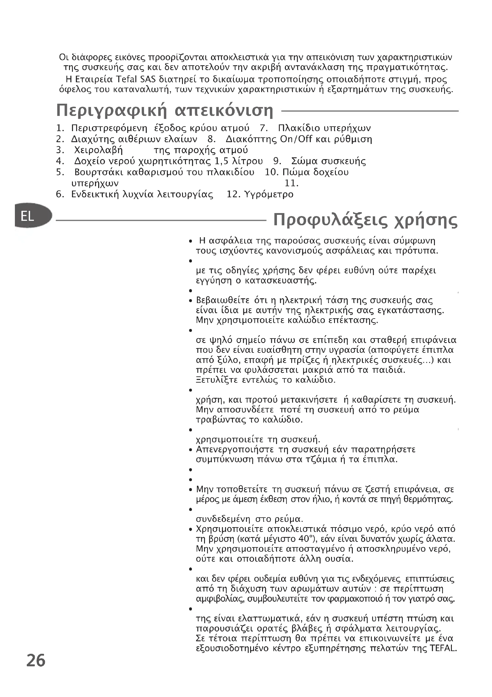 Οι διάφορες εικόνες προορίζονται αποκλειστικά για την απεικόνιση των χαρακτηριστικών της συσκευής σας και δεν αποτελούν την ακριβή αντανάκλαση της πραγματικότητας. Η Εταιρεία Tefal SAS διατηρεί το δικαίωμα τροποποίησης οποιαδήποτε στιγμή, προς όφελος του καταναλωτή, των τεχνικών χαρακτηριστικών ή εξαρτημάτων της συσκευής. Περιγραφική απεικόνιση