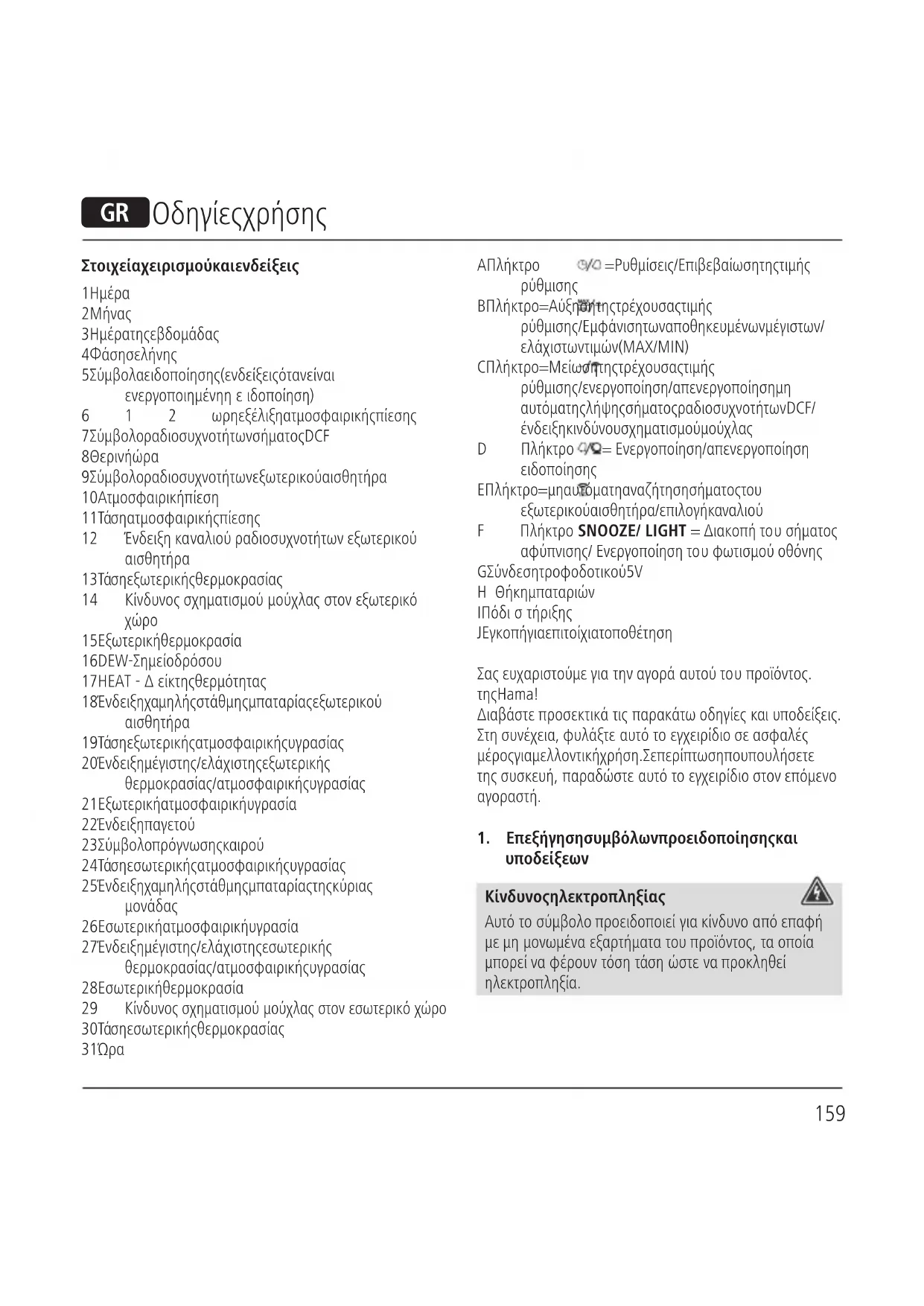 B Πλήκτρο = Αύξηση της τρέχουσας τιμής ρύθμισης/Eμφάνιση των αποθηκευμένων μέγιστων/ ελάχιστων τιμών (MAX/MIN) C Πλήκτρο = Μείωση της τρέχουσας τιμής ρύθμισης/ενεργοποίηση/απενεργοποίηση μη αυτόματης λήψης σήματος ραδιοσυχνοτήτων DCF/ ένδειξη κινδύνου σχηματισμού μούχλας D Πλήκτρο = Ενεργοποίηση/απενεργοποίηση ειδοποίησης E Πλήκτρο = μη αυτόματη αναζήτηση σήματος του εξωτερικού αισθητήρα/επιλογή καναλιού F Πλήκτρο SNOOZE/ LIGHT = Διακοπή τουσήματος αφύπνισης/ Ενεργοποίηση τουφωτισμού οθόνης G Σύνδεση τροφοδοτικού 5V H Θήκη μπαταριών I Πόδιστήριξης J Εγκοπή για επιτοίχια τοποθέτηση Σας ευχαριστούμε για την αγορά αυτού τουπροϊόντος. της Hama! Διαβάστε προσεκτικάτις παρακάτω οδηγίες καιυποδείξεις. Στη συνέχεια, φυλάξτε αυτότοεγχειρίδιο σε ασφαλές μέρος για μελλοντική χρήση. Σε περίπτωση που πουλήσετε της συσκευή, παραδώστε αυτότοεγχειρίδιο στον επόμενο