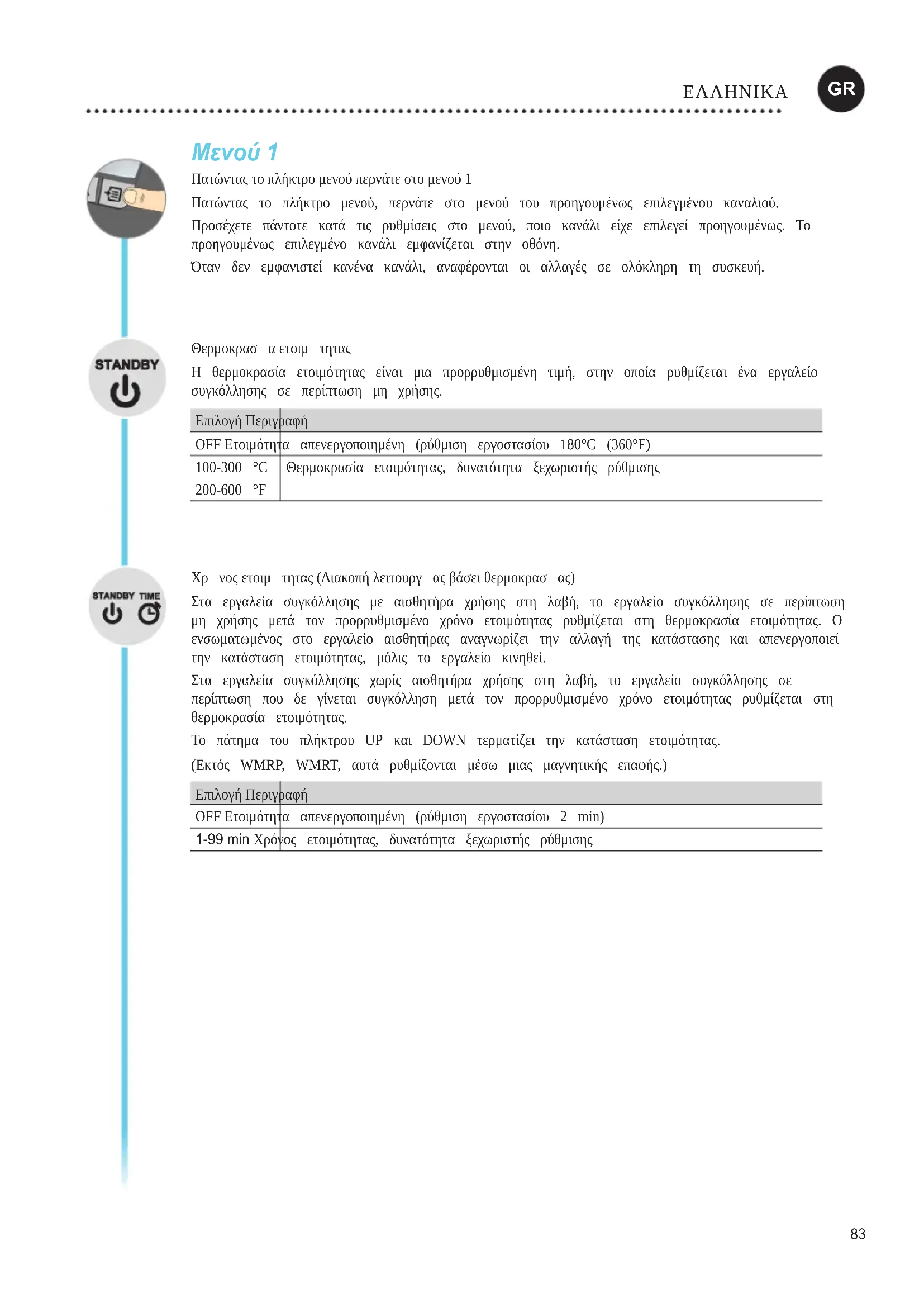 SUOMI83 Μενού 1 Πατώντας το πλήκτρο μενού περνάτε στο μενού 1 Πατώνταςτοπλήκτρομενού,περνάτεστομενούτουπροηγουμένωςεπιλεγμένουκαναλιού. Προσέχετεπάντοτεκατάτιςρυθμίσειςστομενού,ποιοκανάλιείχεεπιλεγείπροηγουμένως.Το προηγουμένωςεπιλεγμένοκανάλιεμφανίζεταιστηνοθόνη. Ότανδενεμφανιστείκανένακανάλι,αναφέρονταιοιαλλαγέςσεολόκληρητησυσκευή. Θερμοκρασα ετοιμτητας Ηθερμοκρασίαετοιμότηταςείναιμιαπρορρυθμισμένητιμή,στηνοποίαρυθμίζεταιέναεργαλείο συγκόλλησηςσεπερίπτωσημηχρήσης. Επιλογή Περιγραφή OFF Ετοιμότητααπενεργοποιημένη(ρύθμισηεργοστασίου180°C(360°F) 100-300°C 200-600°F Θερμοκρασίαετοιμότητας,δυνατότηταξεχωριστήςρύθμισης Χρνος ετοιμτητας (Διακοπή λειτουργας βάσει θερμοκρασας) Σταεργαλείασυγκόλλησηςμεαισθητήραχρήσηςστηλαβή,τοεργαλείοσυγκόλλησηςσεπερίπτωση μηχρήσηςμετάτονπρορρυθμισμένοχρόνοετοιμότηταςρυθμίζεταιστηθερμοκρασίαετοιμότητας.Ο ενσωματωμένοςστοεργαλείοαισθητήραςαναγνωρίζειτηναλλαγήτηςκατάστασηςκαιαπενεργοποιεί τηνκατάστασηετοιμότητας,μόλιςτοεργαλείοκινηθεί. Σταεργαλείασυγκόλλησηςχωρίςαισθητήραχρήσηςστηλαβή,τοεργαλείοσυγκόλλησηςσε περίπτωσηπουδεγίνεταισυγκόλλησημετάτονπρορρυθμισμένοχρόνοετοιμότηταςρυθμίζεταιστη θερμοκρασίαετοιμότητας. ΤοπάτηματουπλήκτρουUPκαιDOWNτερματίζειτηνκατάστασηετοιμότητας. (ΕκτόςWMRP,WMRT,αυτάρυθμίζονταιμέσωμιαςμαγνητικήςεπαφής.) Επιλογή Περιγραφή OFF Ετοιμότητααπενεργοποιημένη(ρύθμισηεργοστασίου2min) 1-99 min Χρόνοςετοιμότητας,δυνατότηταξεχωριστήςρύθμισης