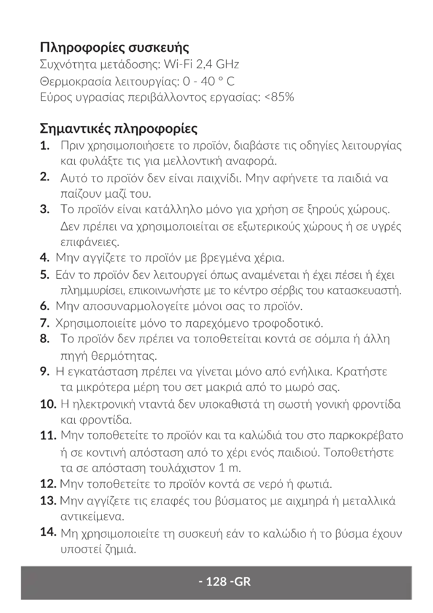 BrandLine Group Sp. z o. o. ul. A. Kręglewskiego 1, 61-248 Poznań, Πολωνία RO | GR‑ 128 ‑GR Πληροφορίες συσκευής Συχνότητα μετάδοσης: Wi-Fi 2,4 GHz Θερμοκρασία λειτουργίας: 0 - 40 ° C Εύρος υγρασίας περιβάλλοντος εργασίας: <85% Σημαντικές πληροφορίες