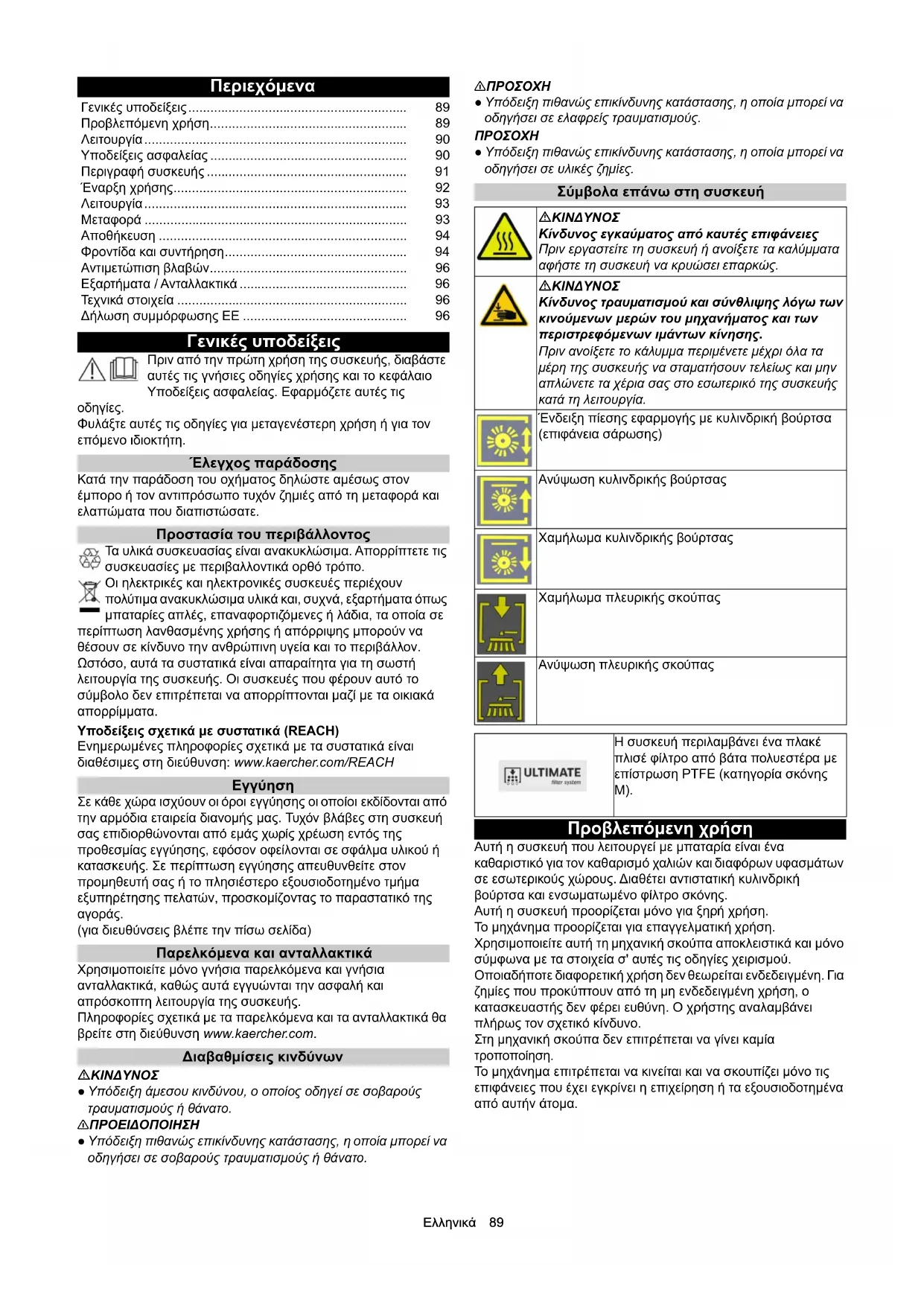 Φυλάξτε αυτές τις οδηγίες για μεταγενέστερη χρήση ή για τον επόμενο ιδιοκτήτη. Έλεγχος παράδοσης Κατά την παράδοση του οχήματος δηλώστε αμέσως στον έμπορο ή τον αντιπρόσωπο τυχόν ζημιές από τη μεταφορά και ελαττώματα που διαπιστώσατε. Προστασία του περιβάλλοντος Τα υλικά συσκευασίας είναι ανακυκλώσιμα. Απορρίπτετε τις συσκευασίες με περιβαλλοντικά ορθό τρόπο. Οι ηλεκτρικές και ηλεκτρονικές συσκευές περιέχουν πολύτιμα ανακυκλώσιμα υλικά και, συχνά, εξαρτήματα όπως μπαταρίες απλές, επαναφορτιζόμενες ή λάδια, τα οποία σε περίπτωση λανθασμένης χρήσης ή απόρριψης μπορούν να θέσουν σε κίνδυνο την ανθρώπινη υγεία και το περιβάλλον. Ωστόσο, αυτά τα συσ τατικά είναι απαραίτητα για τη σωστή λειτουργία της συσκευής. Οι συσκευές που φέρουν αυτό το σύμβολο δεν επιτρέπεται να απορρίπτονται μαζί με τα οικιακά απορρίμματα. Υποδείξεις σχετικά με συστατικά (REACH) Ενημερωμένες πληροφορίες σχετικά με τα συστατικά είναι διαθέσιμες στη διεύθυνση: www.kaercher.com/REACH