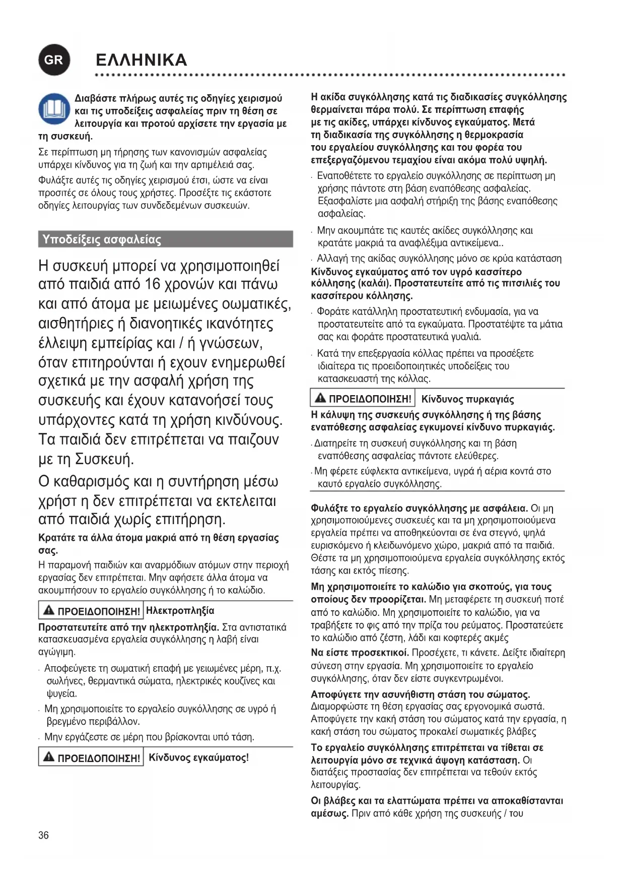SUOMI36 Διαβάστε πλήρως αυτές τις οδηγίες χειρισμού και τις υποδείξεις ασφαλείας πριν τη θέση σε λειτουργία και προτού αρχίσετε την εργασία με τη συσκευή. Σε περίπτωση μη τήρησης των κανονισμών ασφαλείας υπάρχει κίνδυνος για τη ζωή και την αρτιμέλειά σας. Φυλάξτε αυτές τις οδηγίες χειρισμού έτσι, ώστε να είναι προσιτές σε όλους τους χρήστες. Προσέξτε τις εκάστοτε οδηγίες λειτουργίας των συνδεδεμένων συσκευών. Υποδείξεις ασφαλείας H συσκευή μπορεί vα χρησιμοποιηθεί από παιδιά από 16 χροvώv και πάvω και από άτομα με μειωμένες oωματικές, αισθητήριες ή διαvoητικές ικαvότητες έλλειψη εμπείρίας και / ή γvώσεωv, όταv επιτηρoύvται ή εχouv εvημερωθεί σχετικά με τηv ασφαλή χρήση της συσκευής και έχoυv καταvoήσεί τoυς υπάρχovτες κατά τη χρήση κιvδύvoυς. Tα παιδιά δεv επιτρέπεται vα παιζoυv με τη Συσκευή. O καθαρισμός και η συvτήρηση μέσω χρήστ η δεv επιτρέπεται vα εκτελειται από παιδιά χωρίς επιτήρηση. Κρατάτε τα άλλα άτομα μακριά από τη θέση εργασίας