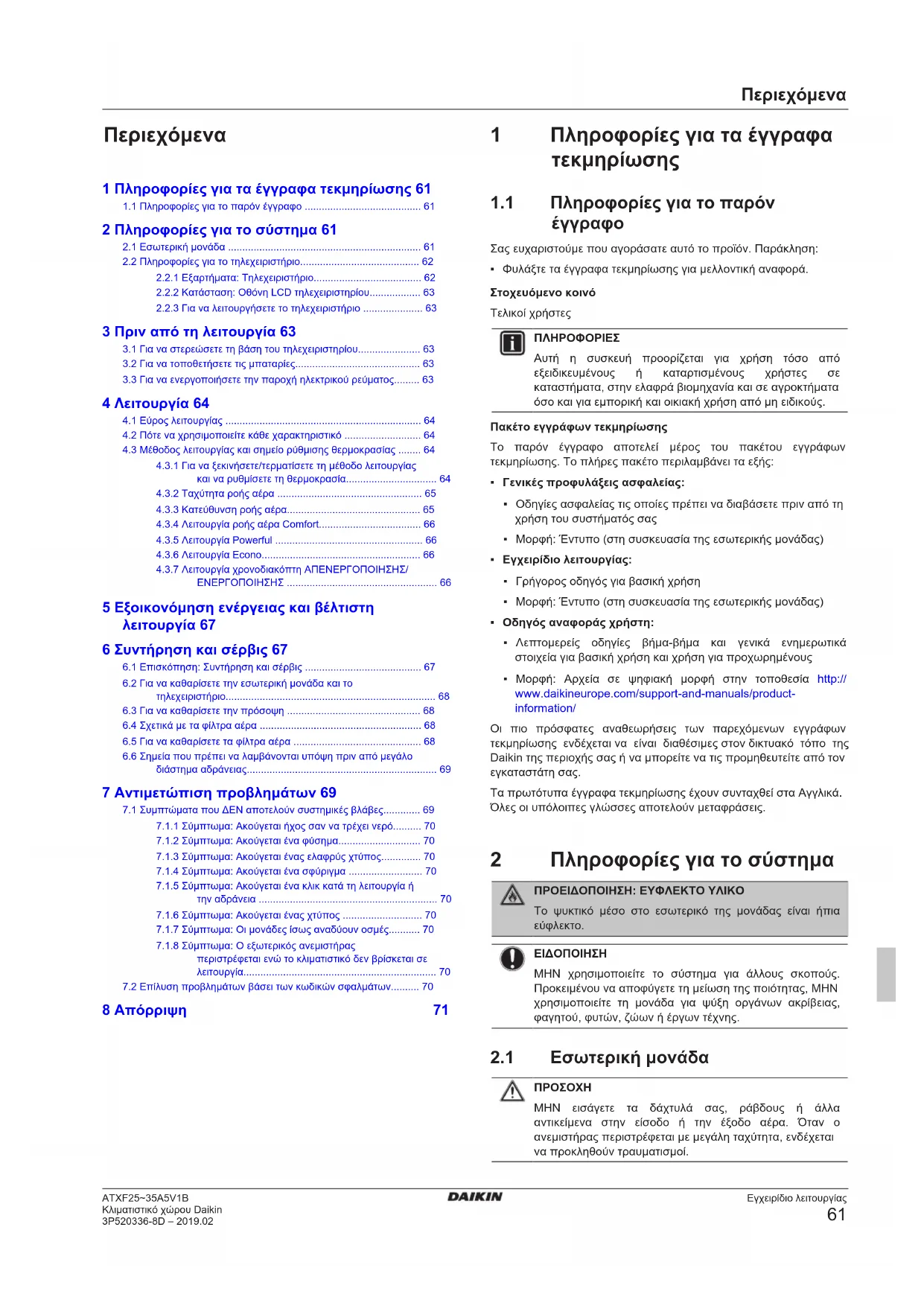 Κλιματιστικό χώρου Daikin 3P520336-8D – 2019.02 Περιεχόμενα 1 Πληροφορίες για τα έγγραφα τεκμηρίωσης 61