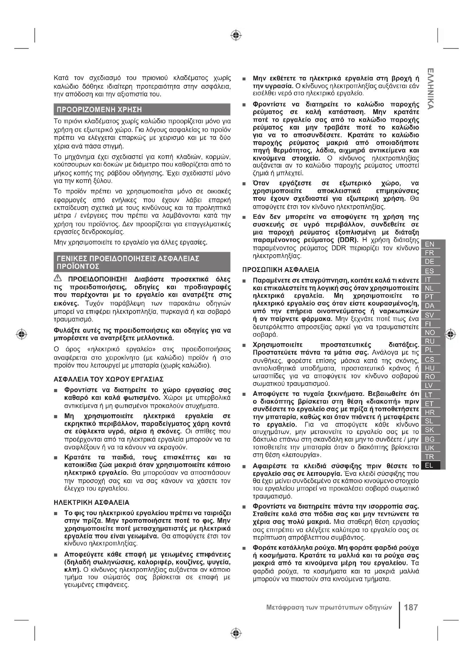 ΠΡΟΕΙΔΟΠΟΙΗΣΗ! Διαβάστε προσεκτικά όλες τις προειδοποιήσεις, οδηγίες και προδιαγραφές που παρέχονται με το εργαλείο και ανατρέξτε στις εικόνες. Τυχόν παράβλεψη των παρακάτω οδηγιών μπορεί να επιφέρει ηλεκτροπληξία, πυρκαγιά ή και σοβαρό τραυματισμό. Φυλάξτε αυτές τις προειδοποιήσεις και οδηγίες για να μπορέσετε να ανατρέξετε μελλοντικά. Ο όρος «ηλεκτρικό εργαλείο» στις προειδοποιήσεις αναφέρεται στο χειροκίνητο (με καλώδιο) προϊόν ή στο προϊόν που λειτουργεί με μπαταρία (χωρίς καλώδιο). ΑΣΦΑΛΕΙΑ ΤΟΥ ΧΩΡΟΥ ΕΡΓΑΣΙΑΣ ■ Φροντίστε να διατηρείτε το χώρο εργασίας σας καθαρό και καλά φωτισμένο. Χώροι με υπερβολικά αντικείμενα ή μη φωτισμένοι προκαλούν ατυχήματα. ■ Μη χρησιμοποιείτε ηλεκτρικά εργαλεία σε εκρηκτικό περιβάλλον, παραδείγματος χάρη κοντά σε εύφλεκτα υγρά, αέρια ή σκόνες. Οι σπίθες που προέρχονται από τα ηλεκτρικά εργαλεία μπορούν να τα αναφλέξουν ή να τα κάνουν να εκραγούν. ■ Κρατάτε τα παιδιά, τους επισκέπτες και τα κατοικίδια ζώα μακριά όταν χρησιμοποιείτε κάποιο ηλεκτρικό εργαλείο. Θα μπορούσαν να αποσπάσουν την προσοχή σας και να σας κάνουν να χάσετε τον έλεγχο του εργαλείου. ΗΛΕΚΤΡΙΚΗ ΑΣΦΑΛΕΙΑ ■ Το φις του ηλεκτρικού εργαλείου πρέπει να ταιριάζει στην πρίζα. Μην τροποποιήσετε ποτέ το φις. Μην χρησιμοποιείτε ποτέ μετασχηματιστές με ηλεκτρικά εργαλεία που είναι γειωμένα. Θα αποφύγετε έτσι τον κίνδυνο ηλεκτροπληξίας. ■ Αποφεύγετε κάθε επαφή με γειωμένες επιφάνειες (δηλαδή σωληνώσεις, καλοριφέρ, κουζίνες, ψυγεία, κλπ). Ο κίνδυνος ηλεκτροπληξίας αυξάνεται αν κάποιο τμήμα του σώματός σας βρίσκεται σε επαφή με γειωμένες επιφάνειες. ■ Μην εκθέτετε τα ηλεκτρικά εργαλεία στη βροχή ή την υγρασία. Ο κίνδυνος ηλεκτροπληξίας αυξάνεται εάν εισέλθει νερό στο ηλεκτρικό εργαλείο. ■ Φροντίστε να διατηρείτε το καλώδιο παροχής ρεύματος σε καλή κατάσταση. Μην κρατάτε ποτέ το εργαλείο σας από το καλώδιο παροχής ρεύματος και μην τραβάτε ποτέ το καλώδιο για να το αποσυνδέσετε. Κρατάτε το καλώδιο παροχής ρεύματος μακριά από οποιαδήποτε πηγή θερμότητας, λάδια, αιχμηρά αντικείμενα και κινούμενα στοιχεία. Ο κίνδυνος ηλεκτροπληξίας αυξάνεται αν το καλώδιο παροχής ρεύματος υποστεί ζημιά ή μπλεχτεί. ■ Όταν εργάζεστε σε εξωτερικό χώρο, να χρησιμοποιείτε αποκλειστικά επιμηκύνσεις που έχουν σχεδιαστεί για εξωτερική χρήση. Θα αποφύγετε έτσι τον κίνδυνο ηλεκτροπληξίας. ■ Εάν δεν μπορείτε να αποφύγετε τη χρήση της συσκευής σε υγρό περιβάλλον, συνδεθείτε σε μια παροχή ρεύματος εξοπλισμένη με διάταξη παραμένοντος ρεύματος (DDR). Η χρήση διάταξης παραμένοντος ρεύματος DDR περιορίζει τον κίνδυνο ηλεκτροπληξίας. ΠΡΟΣΩΠΙΚΗ ΑΣΦΑΛΕΙΑ ■ Παραμένετε σε επαγρύπνηση, κοιτάτε καλά τι κάνετε και επικαλεστείτε τη λογική σας όταν χρησιμοποιείτε ηλεκτρικά εργαλεία. Μη χρησιμοποιείτε το ηλεκτρικό εργαλείο σας όταν είστε κουρασμένος/η, υπό την επήρεια οινοπνεύματος ή ναρκωτικών ή αν παίρνετε φάρμακα. Μην ξεχνάτε ποτέ πως ένα δευτερόλεπτο απροσεξίας αρκεί για να τραυματιστείτε
