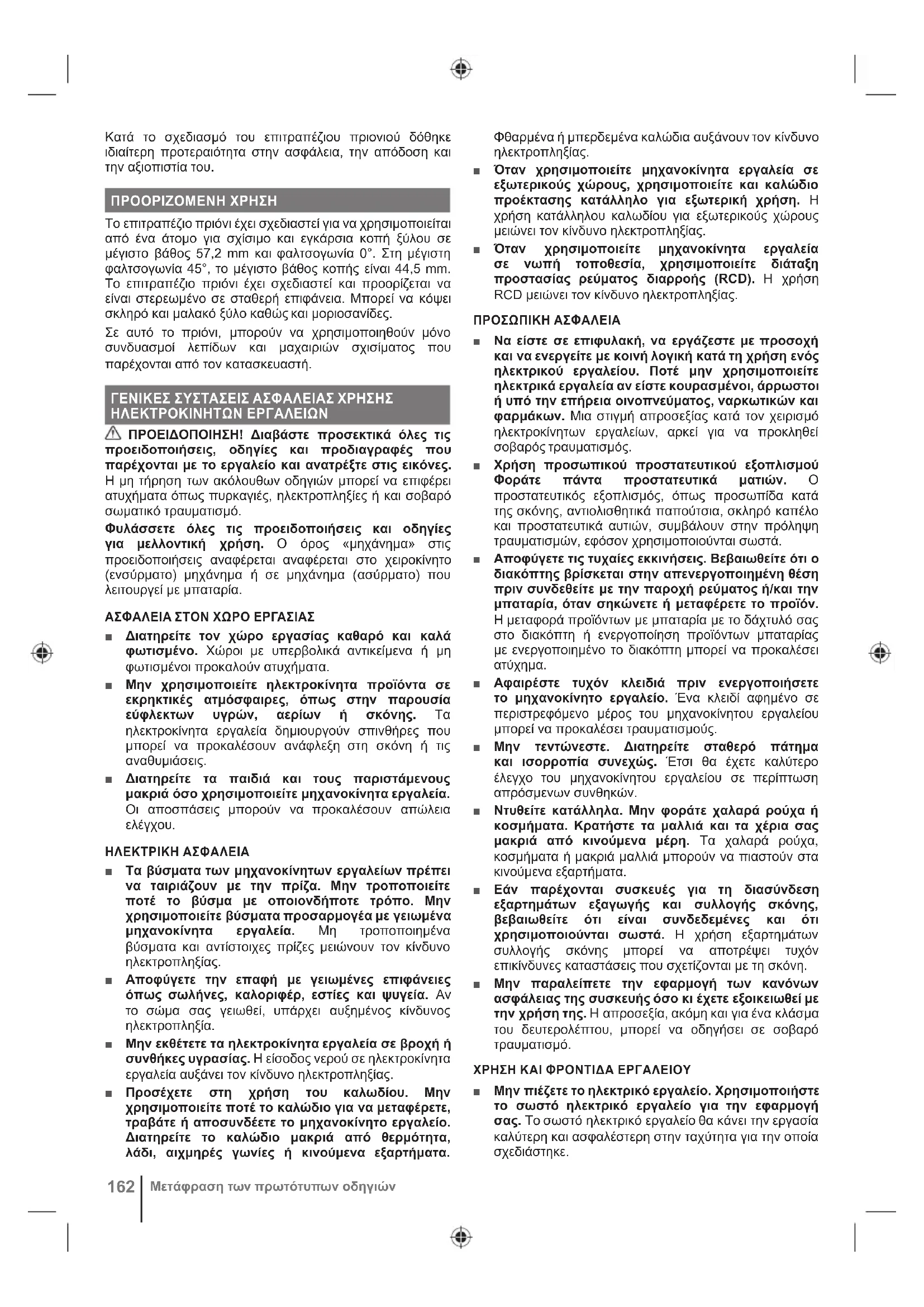 ELΚατά το σχεδιασμό του επιτραπέζιου πριονιού δόθηκε ιδιαίτερη προτεραιότητα στην ασφάλεια, την απόδοση και την αξιοπιστία του. ΠΡΟΟΡΙΖΟΜΕΝΗ ΧΡΗΣΗ Το επιτραπέζιο πριόνι έχει σχεδιαστεί για να χρησιμοποιείται από ένα άτομο για σχίσιμο και εγκάρσια κοπή ξύλου σε μέγιστο βάθος 57,2 mm και φαλτσογωνία 0°. Στη μέγιστη φαλτσογωνία 45°, το μέγιστο βάθος κοπής είναι 44,5 mm. Το επιτραπέζιο πριόνι έχει σχεδιαστεί και προορίζεται να είναι στερεωμένο σε σταθερή επιφάνεια. Μπορεί να κόψει σκληρό και μαλακό ξύλο καθώς και μοριοσανίδες. Σε αυτό το πριόνι, μπορούν να χρησιμοποιηθούν μόνο συνδυασμοί λεπίδων και μαχαιριών σχισίματος που παρέχονται από τον κατασκευαστή. ΓΕΝΙΚΕΣ ΣΥΣΤΑΣΕΙΣ ΑΣΦΑΛΕΙΑΣ ΧΡΗΣΗΣ ΗΛΕΚΤΡΟΚΙΝΗΤΩΝ ΕΡΓΑΛΕΙΩΝ ΠΡΟΕΙΔΟΠΟΙΗΣΗ! Διαβάστε προσεκτικά όλες τις προειδοποιήσεις, οδηγίες και προδιαγραφές που παρέχονται με το εργαλείο και ανατρέξτε στις εικόνες. Η μη τήρηση των ακόλουθων οδηγιών μπορεί να επιφέρει ατυχήματα όπως πυρκαγιές, ηλεκτροπληξίες ή και σοβαρό σωματικό τραυματισμό. Φυλάσσετε όλες τις προειδοποιήσεις και οδηγίες για μελλοντική χρήση. Ο όρος «μηχάνημα» στις προειδοποιήσεις αναφέρεται αναφέρεται στο χειροκίνητο (ενσύρματο) μηχάνημα ή σε μηχάνημα (ασύρματο) που λειτουργεί με μπαταρία. ΑΣΦΑΛΕΙΑ ΣΤΟΝ ΧΩΡΟ ΕΡΓΑΣΙΑΣ ■ Διατηρείτε τον χώρο εργασίας καθαρό και καλά φωτισμένο. Χώροι με υπερβολικά αντικείμενα ή μη φωτισμένοι προκαλούν ατυχήματα. ■ Μην χρησιμοποιείτε ηλεκτροκίνητα προϊόντα σε εκρηκτικές ατμόσφαιρες, όπως στην παρουσία εύφλεκτων υγρών, αερίων ή σκόνης. Τα ηλεκτροκίνητα εργαλεία δημιουργούν σπινθήρες που μπορεί να προκαλέσουν ανάφλεξη στη σκόνη ή τις αναθυμιάσεις. ■ Διατηρείτε τα παιδιά και τους παριστάμενους μακριά όσο χρησιμοποιείτε μηχανοκίνητα εργαλεία. Οι αποσπάσεις μπορούν να προκαλέσουν απώλεια