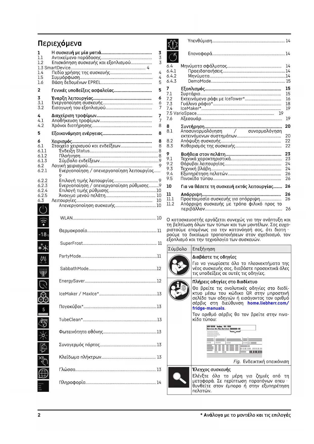 ύμβολο Επεξήγηση Διαβάστε τις οδηγίες Για να γνωρίσετε όλα τα πλεονεκτήματα της νέας συσκευής σας, διαβάστε προσεκτικά όλες τις υποδείξεις σε αυτές τις οδηγίες. Πλήρεις οδηγίες στο διαδίκτυο Θα βρείτε τις αναλυτικές οδηγίες στο διαδί- κτυο μέσω του κώδικα QR στην μπροστινή σελίδα των οδηγιών ή εισάγοντας τον αριθμό σέρβις στη διεύθυνση home.liebherr.com/ fridge-manuals. Τον αριθμό σέρβις θα τον βρείτε στην πινα‐ κίδα τύπου: Fig. Ενδεικτική απεικόνιση Έλεγχος συσκευής Ελέγξτε όλα τα μέρη για ζημιές από τη μεταφορά. Σε περίπτωση παραπόνων απευ‐ θυνθείτε στον έμπορο ή στην εξυπηρέτηση