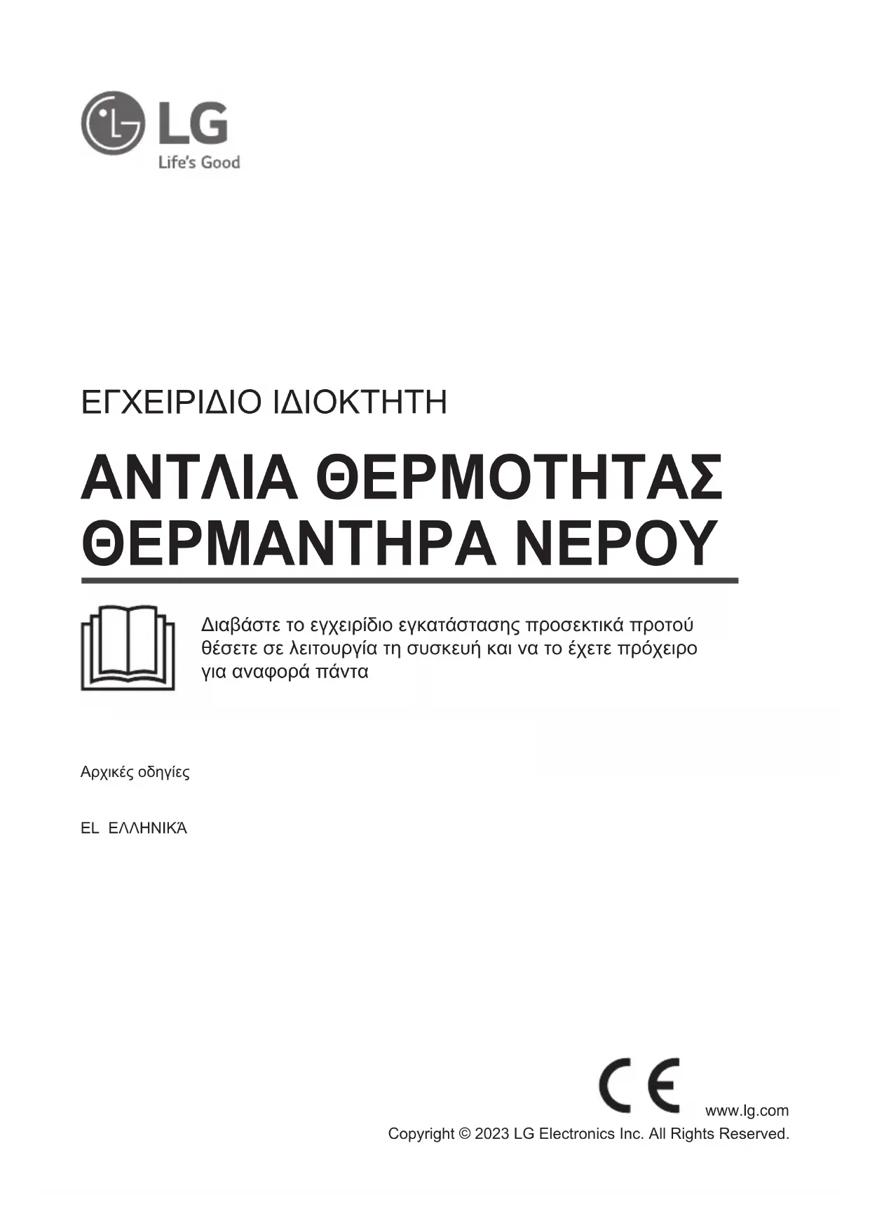 - Zonder voorafgaande kennisgeving kan de functie onderhevig zijn aan veranderingen en kan deze een andere vorm hebben, afhankelijk van waar u zich bevindt.www.lg.com ΕΓΧΕΙΡΙΔΙΟ ΙΔΙΟΚΤΗΤΗ ΑΝΤΛΙΑ ΘΕΡΜΟΤΗΤΑΣ ΘΕΡΜΑΝΤΗΡΑ ΝΕΡΟΥ Copyright © 2023 LG Electronics Inc. All Rights Reserved. Αρχικές οδηγίες Διαβάστε το εγχειρίδιο εγκατάστασης προσεκτικά προτού θέσετε σε λειτουργία τη συσκευή και να το έχετε πρόχειρο για αναφορά πάντα EL ΕΛΛΗΝΙΚΆΠΙΝΑΚΑΣ ΠΕΡΙΕΧΟΜΕΝΩΝ ΟΔΗΓΙΕΣ ΑΣΦΑΛΕΙΑΣ ................................................................3 Προφυλάξεις Ασφαλείας ...........................................................................................................4 ΕΓΚΑΤΑΣΤΑΣΗ ..........................................................................12 Μέρη και Λειτουργίες...............................................................................................................12 Εργαλεία Εγκατάστασης .........................................................................................................13 Εξαρτήματα.............................................................................................................................13 Οδηγίες Εγκατάστασης...........................................................................................................14 Επιλέξτε την καλύτερη Τοποθεσία ..........................................................................................15 Αποσυσκευάζοντας και Αφαιρώντας τις ασφάλειες μεταφοράς ..............................................16 Θερμική Διαστολή ...................................................................................................................16 Εγκατάσταση της Βαλβίδας Αποστράγγισης ..........................................................................16 Εγκατάσταση της Ανακουφιστικής Βαλβίδας Θερμοκρασίας και Πίεσης ................................16 Εγκατάσταση των Γραμμών Αποστράγγισης Συμπυκνωμάτων .............................................18 Συνδέοντας την Παροχή Νερού ..............................................................................................19 Κάνοντας τις Ηλεκτρικές Συνδέσεις ........................................................................................20 Έλεγχοι Ασφαλείας .................................................................................................................21 Σύνολο συνέργων μονωτικής επικάλυψης..............................................................................21 Λίστα ελέγχου Εγκατάστασης .................................................................................................22 ΛΕΙΤΟΥΡΓΙΑ ..............................................................................23 Χρησιμοποιώντας Βασικό Έλεγχο ..........................................................................................23 ΕΞΥΠΝΕΣ ΛΕΙΤΟΥΡΓΙΕΣ...........................................................25 Εφαρμογή LG ThinQ ..............................................................................................................25 Αυτό το εγχειρίδιο περιέχει εικόνες ή περιεχόμενο που μπορεί να διαφέρει από το μοντέλο που αγοράσατε. υτό το εγχειρίδιο υπόκειται σε αναθεώρηση από τον κατασκευαστή.EL ΟΔΗΓΙΕΣ ΑΣΦΑΛΕΙΑΣ Η ασφάλειά σας και η ασφάλεια των άλλων είναι πολύ σημαντικές. Σας παρέχουμε πολλά σημαντικά μηνύματα ασφάλειας σε αυτό το εγχειρίδιο και πάνω στη συσκευή σας. Πάντα να διαβάζετε και να ακολουθείτε όλα τα μηνύματα ασφαλείας. Αυτό είναι το σύμβολο ειδοποίησης κινδύνου. Αυτό το σύμβολο σας προειδοποιεί για δυνητικούς κινδύνους που μπορούν να σκοτώσουν ή να τραυματίσουν εσάς και άλλους. Όλα τα μηνύματα ασφαλείας θα ακολουθούν το σύμβολο ειδοποίησης κινδύνου και είτε τις λέξεις ΚΙΝΔΥΝΟΣ, ΠΡΟΕΙΔΟΠΟΙΗΣΗ είτε ΠΡΟΣΟΧΗ. Αυτές οι λέξεις σημαίνουν: