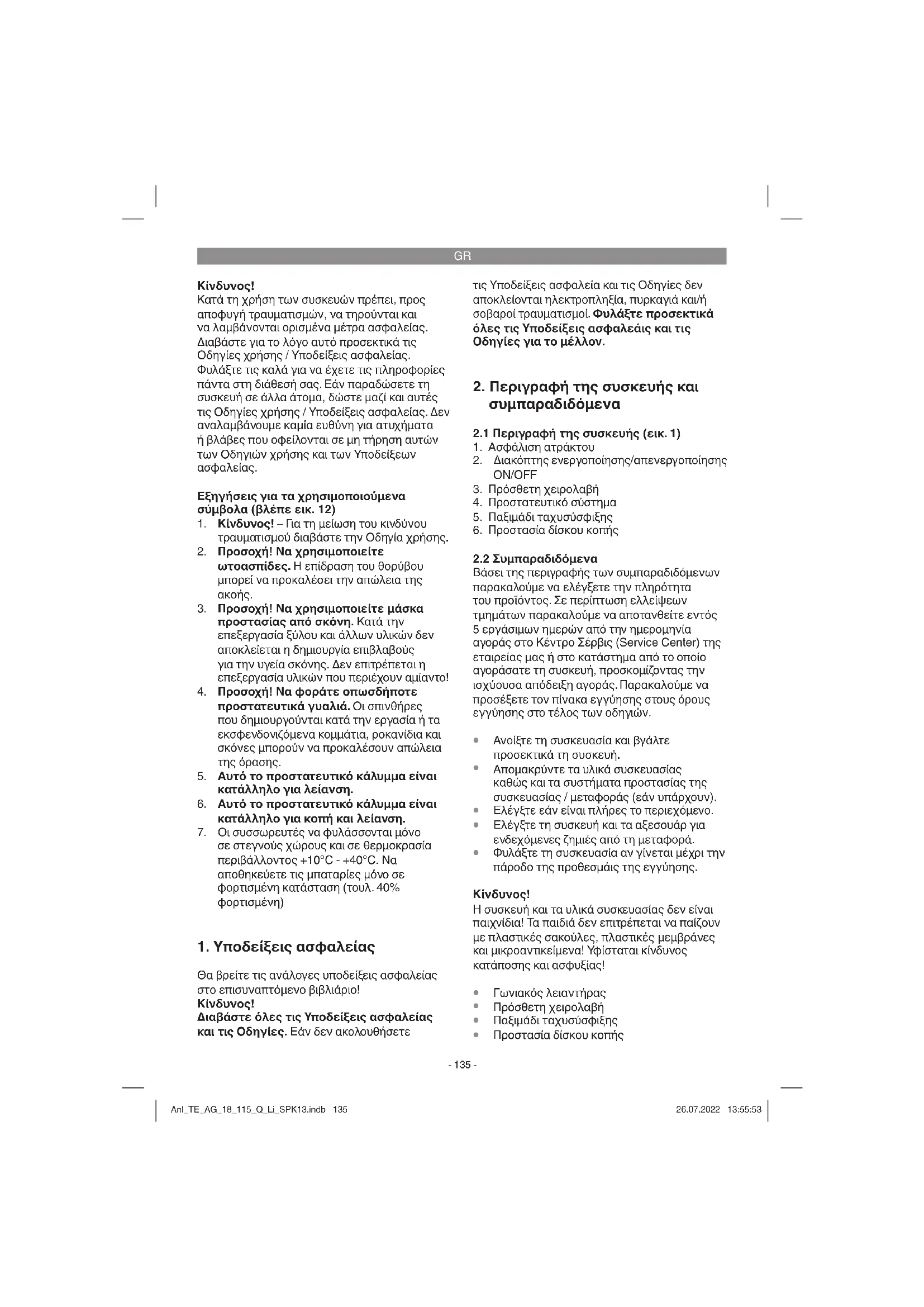 Υπολειπόμενοι κίνδυνοι Aκόμη και σε περίπτωση σωστής και κανονικής χρήσης αυτού του ηλεκτρικού εργαλείου, υφίστανται πάντα ορισμένοι υπολειπόμενοι κίνδυνοι. Oι ακόλουθοι κίνδυνοι μπορούν να παρουσιαστούν ανάλογα με το είδος κατασκευής και το μεντέλο αυτού του ηλεκτρικού εργαλείου: Anl_TE_AG_18_115_Q_Li_SPK13.indb 136Anl_TE_AG_18_115_Q_Li_SPK13.indb 136 26.07.2022 13:55:5326.07.2022 13:55:53GR