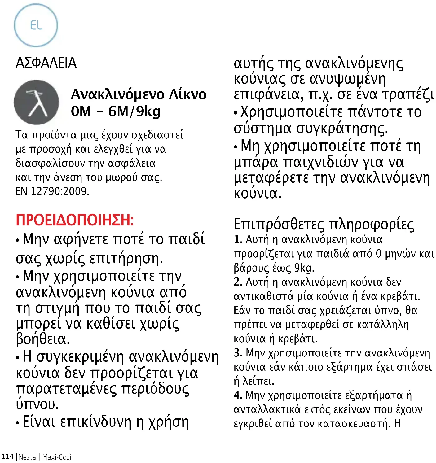 Ανακλινόμενο Λίκνο 0M - 6M/9kg Τα προϊόντα μας έχουν σχεδιαστεί με προσοχή και ελεγχθεί για να διασφαλίσουν την ασφάλεια και την άνεση του μωρού σας. EN 12790:2009. ΠΡΟΕΙΔΟΠΟΙΗΣΗ: