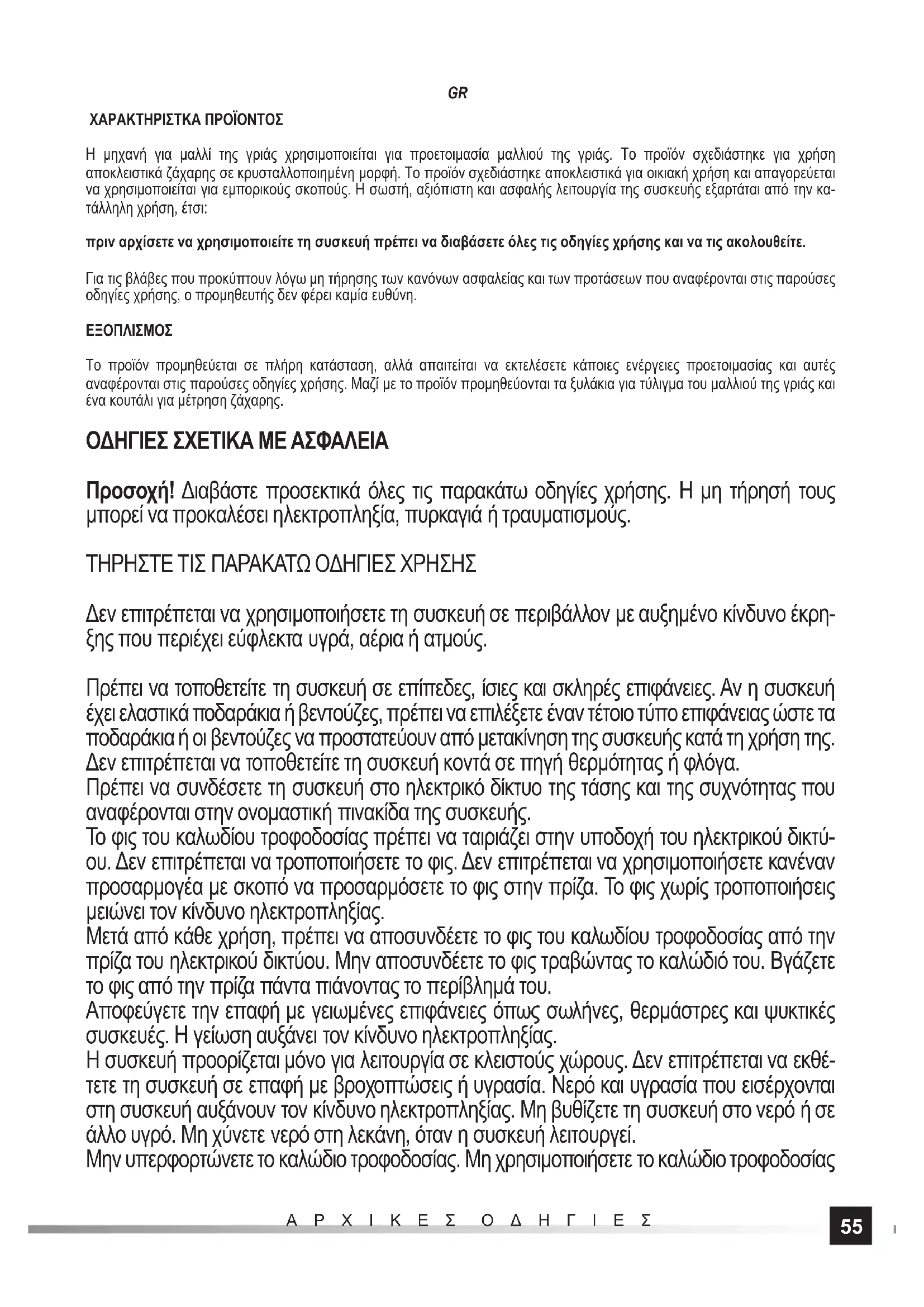 Το προϊόν προμηθεύεται σε πλήρη κατάσταση, αλλά απαιτείται να εκτελέσετε κάποιες ενέργειες προετοιμασίας και αυτές αναφέρονται στις παρούσες οδηγίες χρήσης. Μαζί με το προϊόν προμηθεύονται τα ξυλάκια για τύλιγμα του μαλλιού της γριάς και ένα κουτάλι για μέτρηση ζάχαρης. ΟΔΗΓΙΕΣ ΣΧΕΤΙΚΑ ΜΕ ΑΣΦΑΛΕΙΑ Προσοχή! Διαβάστε προσεκτικά όλες τις παρακάτω οδηγίες χρήσης. Η μη τήρησή τους μπορεί να προκαλέσει ηλεκτροπληξία, πυρκαγιά ή τραυματισμούς. ΤΗΡΗΣΤΕ ΤΙΣ ΠΑΡΑΚΑΤΩ ΟΔΗΓΙΕΣ ΧΡΗΣΗΣ Δεν επιτρέπεται να χρησιμοποιήσετε τη συσκευή σε περιβάλλον με αυξημένο κίνδυνο έκρη- ξης που περιέχει εύφλεκτα υγρά, αέρια ή ατμούς. Πρέπει να τοποθετείτε τη συσκευή σε επίπεδες, ίσιες και σκληρές επιφάνειες. Αν η συσκευή έχει ελαστικά ποδαράκια ή βεντούζες, πρέπει να επιλέξετε έναν τέτοιο τύπο επιφάνειας ώστε τα ποδαράκια ή οι βεντούζες να προστατεύουν από μετακίνηση της συσκευής κατά τη χρήση της. Δεν επιτρέπεται να τοποθετείτε τη συσκευή κοντά σε πηγή θερμότητας ή φλόγα. Πρέπει να συνδέσετε τη συσκευή στο ηλεκτρικό δίκτυο της τάσης και της συχνότητας που αναφέρονται στην ονομαστική πινακίδα της συσκευής. Το φις του καλωδίου τροφοδοσίας πρέπει να ταιριάζει στην υποδοχή του ηλεκτρικού δικτύ- ου. Δεν επιτρέπεται να τροποποιήσετε το φις. Δεν επιτρέπεται να χρησιμοποιήσετε κανέναν προσαρμογέα με σκοπό να προσαρμόσετε το φις στην πρίζα. Το φις χωρίς τροποποιήσεις μειώνει τον κίνδυνο ηλεκτροπληξίας. Μετά από κάθε χρήση, πρέπει να αποσυνδέετε το φις του καλωδίου τροφοδοσίας από την πρίζα του ηλεκτρικού δικτύου. Μην αποσυνδέετε το φις τραβώντας το καλώδιό του. Βγάζετε το φις από την πρίζα πάντα πιάνοντας το περίβλημά του. Αποφεύγετε την επαφή με γειωμένες επιφάνειες όπως σωλήνες, θερμάστρες και ψυκτικές συσκευές. Η γείωση αυξάνει τον κίνδυνο ηλεκτροπληξίας. Η συσκευή προορίζεται μόνο για λειτουργία σε κλειστούς χώρους. Δεν επιτρέπεται να εκθέ- τετε τη συσκευή σε επαφή με βροχοπτώσεις ή υγρασία. Νερό και υγρασία που εισέρχονται στη συσκευή αυξάνουν τον κίνδυνο ηλεκτροπληξίας. Μη βυθίζετε τη συσκευή στο νερό ή σε άλλο υγρό. Μη χύνετε νερό στη λεκάνη, όταν η συσκευή λειτουργεί. Μην υπερφορτώνετε το καλώδιο τροφοδοσίας. Μη χρησιμοποιήσετε το καλώδιο τροφοδοσίας56 ΑΡΧΙΚΕΣ ΟΔΗΓΙΕΣ