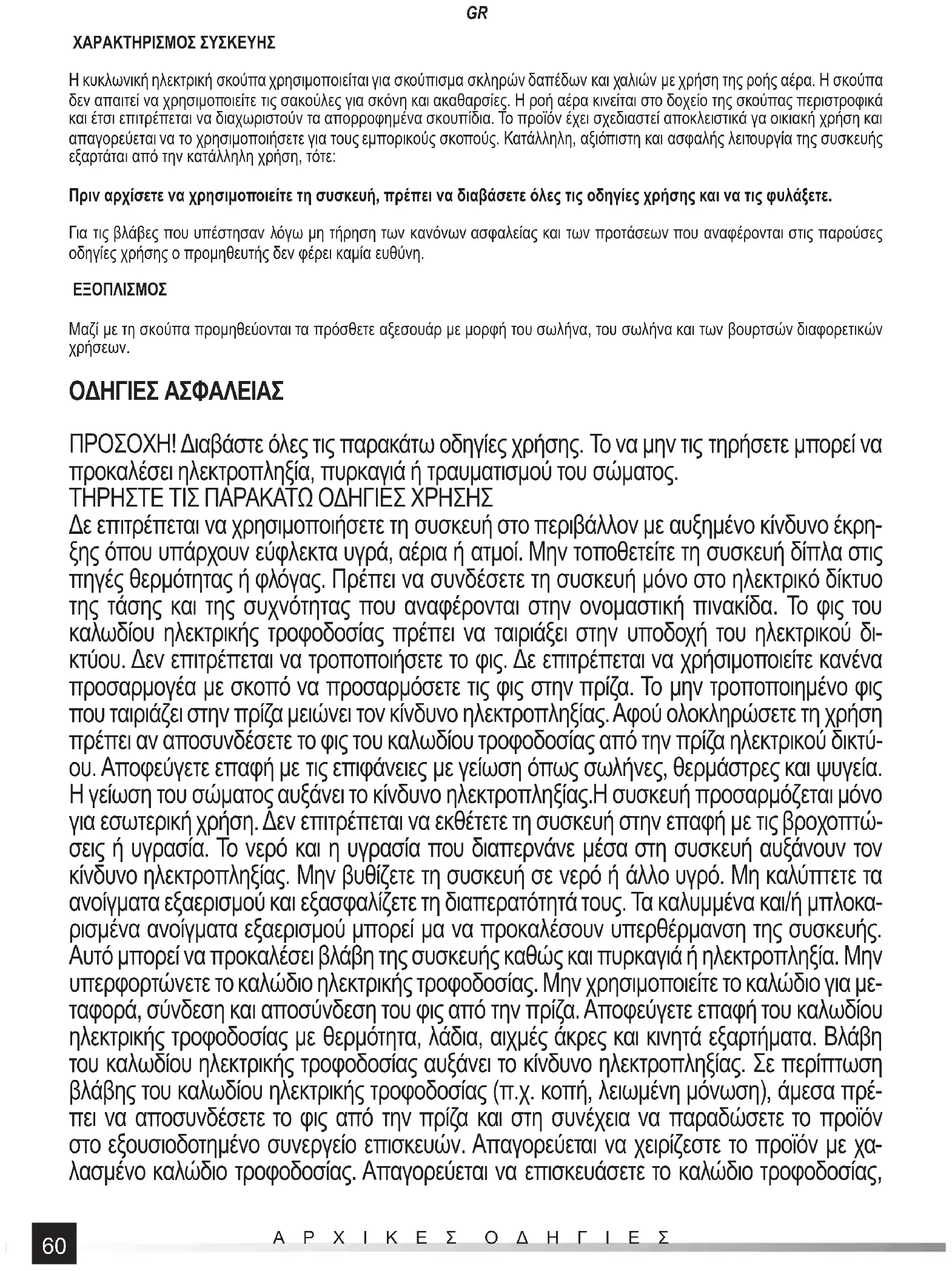 ΟΔΗΓΙΕΣ ΑΣΦΑΛΕΙΑΣ ΠΡΟΣΟΧΗ! Διαβάστε όλες τις παρακάτω οδηγίες χρήσης. Το να μην τις τηρήσετε μπορεί να προκαλέσει ηλεκτροπληξία, πυρκαγιά ή τραυματισμού του σώματος. ΤΗΡΗΣΤΕ ΤΙΣ ΠΑΡΑΚΑΤΩ ΟΔΗΓΙΕΣ ΧΡΗΣΗΣ Δε επιτρέπεται να χρησιμοποιήσετε τη συσκευή στο περιβάλλον με αυξημένο κίνδυνο έκρη- ξης όπου υπάρχουν εύφλεκτα υγρά, αέρια ή ατμοί. Μην τοποθετείτε τη συσκευή δίπλα στις πηγές θερμότητας ή φλόγας. Πρέπει να συνδέσετε τη συσκευή μόνο στο ηλεκτρικό δίκτυο της τάσης και της συχνότητας που αναφέρονται στην ονομαστική πινακίδα. Το φις του καλωδίου ηλεκτρικής τροφοδοσίας πρέπει να ταιριάξει στην υποδοχή του ηλεκτρικού δι- κτύου. Δεν επιτρέπεται να τροποποιήσετε το φις. Δε επιτρέπεται να χρήσιμοποιείτε κανένα προσαρμογέα με σκοπό να προσαρμόσετε τις φις στην πρίζα. Το μην τροποποιημένο φις που ταιριάζει στην πρίζα μειώνει τον κίνδυνο ηλεκτροπληξίας. Αφού ολοκληρώσετε τη χρήση πρέπει αν αποσυνδέσετε το φις του καλωδίου τροφοδοσίας από την πρίζα ηλεκτρικού δικτύ- ου. Αποφεύγετε επαφή με τις επιφάνειες με γείωση όπως σωλήνες, θερμάστρες και ψυγεία. Η γείωση του σώματος αυξάνει το κίνδυνο ηλεκτροπληξίας.Η συσκευή προσαρμόζεται μόνο για εσωτερική χρήση. Δεν επιτρέπεται να εκθέτετε τη συσκευή στην επαφή με τις βροχοπτώ- σεις ή υγρασία. Το νερό και η υγρασία που διαπερνάνε μέσα στη συσκευή αυξάνουν τον κίνδυνο ηλεκτροπληξίας. Μην βυθίζετε τη συσκευή σε νερό ή άλλο υγρό. Μη καλύπτετε τα ανοίγματα εξαερισμού και εξασφαλίζετε τη διαπερατότητά τους. Τα καλυμμένα και/ή μπλοκα- ρισμένα ανοίγματα εξαερισμού μπορεί μα να προκαλέσουν υπερθέρμανση της συσκευής. Αυτό μπορεί να προκαλέσει βλάβη της συσκευής καθώς και πυρκαγιά ή ηλεκτροπληξία. Μην υπερφορτώνετε το καλώδιο ηλεκτρικής τροφοδοσίας. Μην χρησιμοποιείτε το καλώδιο για με- ταφορά, σύνδεση και αποσύνδεση του φις από την πρίζα. Αποφεύγετε επαφή του καλωδίου ηλεκτρικής τροφοδοσίας με θερμότητα, λάδια, αιχμές άκρες και κινητά εξαρτήματα. Βλάβη του καλωδίου ηλεκτρικής τροφοδοσίας αυξάνει το κίνδυνο ηλεκτροπληξίας. Σε περίπτωση βλάβης του καλωδίου ηλεκτρικής τροφοδοσίας (π.χ. κοπή, λειωμένη μόνωση), άμεσα πρέ- πει να αποσυνδέσετε το φις από την πρίζα και στη συνέχεια να παραδώσετε το προϊόν στο εξουσιοδοτημένο συνεργείο επισκευών. Απαγορεύεται να χειρίζεστε το προϊόν με χα- λασμένο καλώδιο τροφοδοσίας. Απαγορεύεται να επισκευάσετε το καλώδιο τροφοδοσίας,61