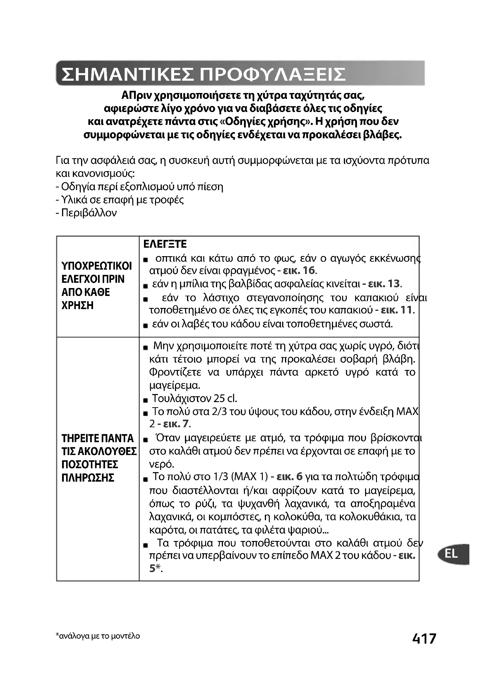 *ανάλογα με το μοντέλο ΣΗΜΑΝΤΙΚΕΣ ΠΡΟΦΥΛΑΞΕΙΣ AΠριν χρησιμοποιήσετε τη χύτρα ταχύτητάς σας, αφιερώστε λίγο χρόνο για να διαβάσετε όλες τις οδηγίες και ανατρέχετε πάντα στις «Οδηγίες χρήσης». Η χρήση που δεν συμμορφώνεται με τις οδηγίες ενδέχεται να προκαλέσει βλάβες. Για την ασφάλειά σας, η συσκευή αυτή συμμορφώνεται με τα ισχύοντα πρότυπα και κανονισμούς: - Οδηγία περί εξοπλισμού υπό πίεση - Υλικά σε επαφή με τροφές - Περιβάλλον ΥΠΟΧΡΕΩΤΙΚΟΙ ΕΛΕΓΧΟΙ ΠΡΙΝ