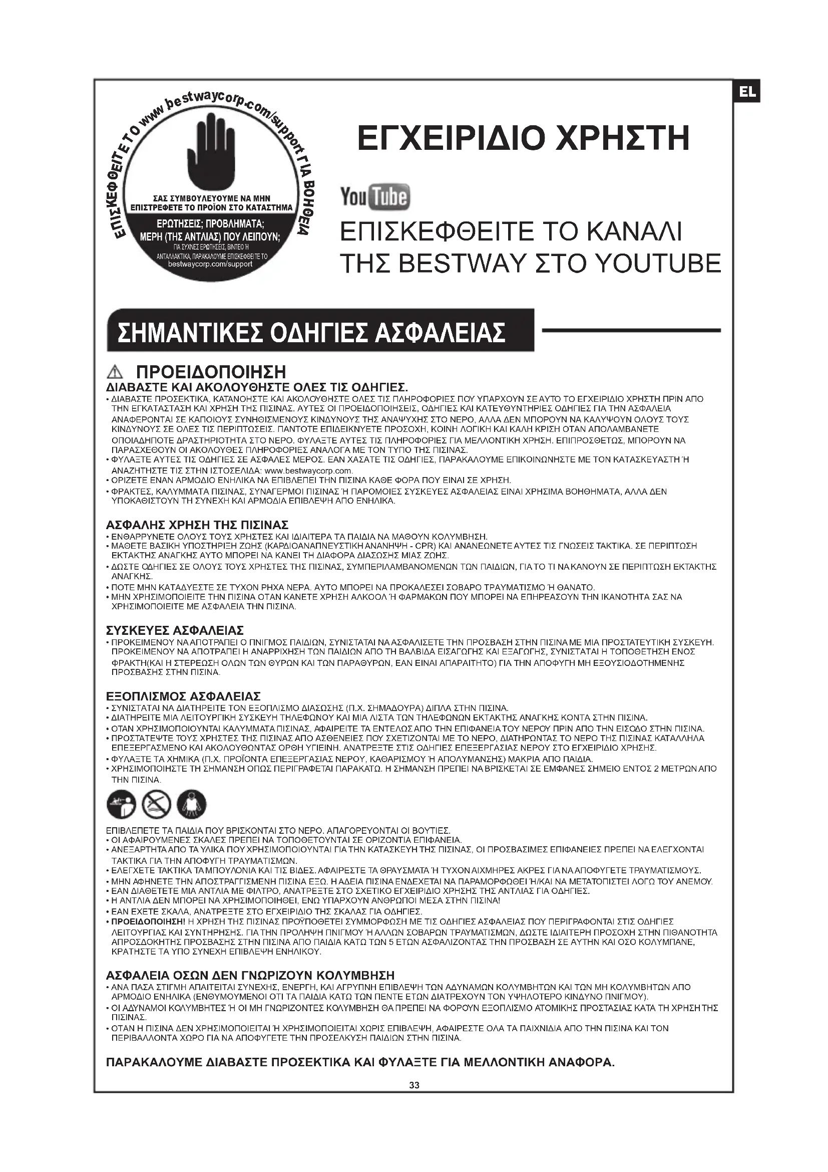 - ΔΙΑΒΑΣΤΕ ΠΡΟΣΕΚΤΙΚΑ, ΚΑΤΑΝΟΗΣΤΕ ΚΑΙ ΑΚΟΛΟΥΘΗΣΤΕ ΟΛΕΣ ΤΙΣ ΠΛΗΡΟΦΟΡΙΕΣ ΠΟΥ ΥΠΑΡΧΟΥΝ ΣΕ ΑΥΤΟ ΤΟ ΕΓΧΕΙΡΙΔΙΟ ΧΡΗΣΤΗ ΠΡΙΝ ΑΠΟ ΤΗΝ ΕΓΚΑΤΑΣΤΑΣΗ ΚΑΙ ΧΡΗΣΗ ΤΗΣ ΠΙΣΙΝΑΣ. ΑΥΤΕΣ ΟΙ ΠΡΟΕΙΔΟΠΟΙΗΣΕΙΣ, ΟΔΗΓΙΕΣ ΚΑΙ ΚΑΤΕΥΘΥΝΤΗΡΙΕΣ ΟΔΗΓΙΕΣ ΓΙΑ ΤΗΝ ΑΣΦΑΛΕΙΑ ΑΝΑΦΕΡΟΝΤΑΙ ΣΕ ΚΑΠΟΙΟΥΣ ΣΥΝΗΘΙΣΜΕΝΟΥΣ ΚΙΝΔΥΝΟΥΣ ΤΗΣ ΑΝΑΨΥΧΗΣ ΣΤΟ ΝΕΡΟ, ΑΛΛΑ ΔΕΝ ΜΠΟΡΟΥΝ ΝΑ ΚΑΛΥΨΟΥΝ ΟΛΟΥΣ ΤΟΥΣ ΚΙΝΔΥΝΟΥΣ ΣΕ ΟΛΕΣ ΤΙΣ ΠΕΡΙΠΤΩΣΕΙΣ. ΠΑΝΤΟΤΕ ΕΠΙΔΕΙΚΝΥΕΤΕ ΠΡΟΣΟΧΗ, ΚΟΙΝΗ ΛΟΓΙΚΗ ΚΑΙ ΚΑΛΗ ΚΡΙΣΗ ΟΤΑΝ ΑΠΟΛΑΜΒΑΝΕΤΕ ΟΠΟΙΑΔΗΠΟΤΕ ΔΡΑΣΤΗΡΙΟΤΗΤΑ ΣΤΟ ΝΕΡΟ. ΦΥΛΑΞΤΕ ΑΥΤΕΣ ΤΙΣ ΠΛΗΡΟΦΟΡΙΕΣ ΓΙΑ ΜΕΛΛΟΝΤΙΚΗ ΧΡΗΣΗ. ΕΠΙΠΡΟΣΘΕΤΩΣ, ΜΠΟΡΟΥΝ ΝΑ ΠΑΡΑΣΧΕΘΟΥΝ ΟΙ ΑΚΟΛΟΥΘΕΣ ΠΛΗΡΟΦΟΡΙΕΣ ΑΝΑΛΟΓΑ ΜΕ ΤΟΝ ΤΥΠΟ ΤΗΣ ΠΙΣΙΝΑΣ.• ΦΥΛΑΞΤΕ ΑΥΤΕΣ ΤΙΣ ΟΔΗΓΙΕΣ ΣΕ ΑΣΦΑΛΕΣ ΜΕΡΟΣ. ΕΑΝ ΧΑΣΑΤΕ ΤΙΣ ΟΔΗΓΙΕΣ, ΠΑΡΑΚΑΛΟΥΜΕ ΕΠΙΚΟΙΝΩΝΗΣΤΕ ΜΕ ΤΟΝ ΚΑΤΑΣΚΕΥΑΣΤΗ Ή ΑΝΑΖΗΤΗΣΤΕ ΤΙΣ ΣΤΗΝ ΙΣΤΟΣΕΛΙΔΑ: www.bestwaycorp.com.• ΟΡΙΖΕΤΕ ΕΝΑΝ ΑΡΜΟΔΙΟ ΕΝΗΛΙΚΑ ΝΑ ΕΠΙΒΛΕΠΕΙ ΤΗΝ ΠΙΣΙΝΑ ΚΑΘΕ ΦΟΡΑ ΠΟΥ ΕΙΝΑΙ ΣΕ ΧΡΗΣΗ.• ΦΡΑΚΤΕΣ, ΚΑΛΥΜΜΑΤΑ ΠΙΣΙΝΑΣ, ΣΥΝΑΓΕΡΜΟΙ ΠΙΣΙΝΑΣ Ή ΠΑΡΟΜΟΙΕΣ ΣΥΣΚΕΥΕΣ ΑΣΦΑΛΕΙΑΣ ΕΙΝΑΙ ΧΡΗΣΙΜΑ ΒΟΗΘΗΜΑΤΑ, ΑΛΛΑ ΔΕΝ ΥΠΟΚΑΘΙΣΤΟΥΝ ΤΗ ΣΥΝΕΧΗ ΚΑΙ ΑΡΜΟΔΙΑ ΕΠΙΒΛΕΨΗ ΑΠΟ ΕΝΗΛΙΚΑ. ΑΣΦΑΛΗΣ ΧΡΗΣΗ ΤΗΣ ΠΙΣΙΝΑΣ• ΕΝΘΑΡΡΥΝΕΤΕ ΟΛΟΥΣ ΤΟΥΣ ΧΡΗΣΤΕΣ ΚΑΙ ΙΔΙΑΙΤΕΡΑ ΤΑ ΠΑΙΔΙΑ ΝΑ ΜΑΘΟΥΝ ΚΟΛΥΜΒΗΣΗ.