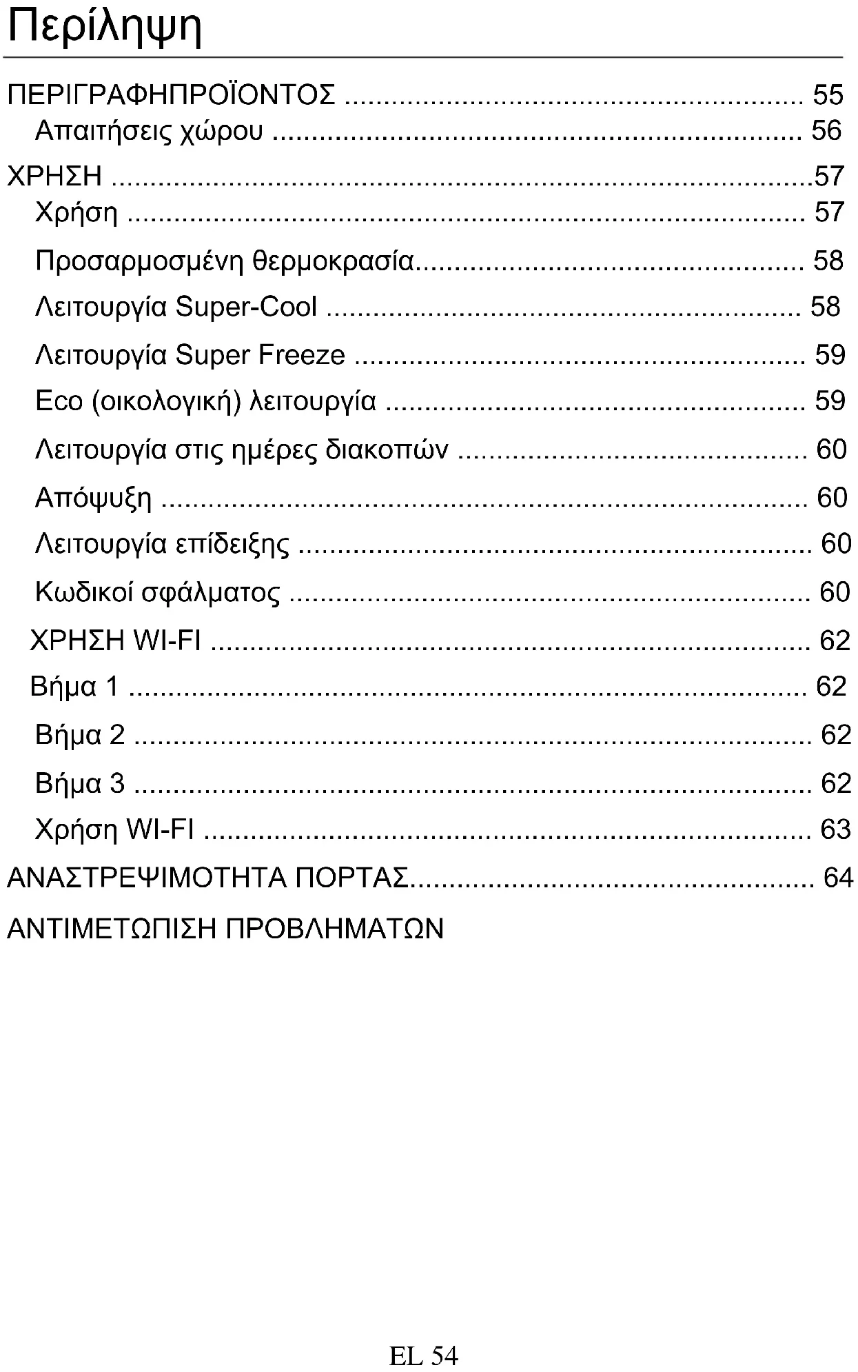 ● Η πόρτα του καταψύκτη δεν έχει κλείσει. Βεβαιωθείτε ότι η πόρτα είναι κλειστή και το λάστιχο εφαρμόζει σωστά. Συναγερμός πόρτας ψυγείου. ● Ο συναγερμός πόρτας ψυγείου (ηχητικό σήμα μπιπ) ενεργοποιείται κάθε φορά που η πόρτα μένει ανοιχτή για περισσότερο από 3 λεπτά. Αποφύγετε να αφήνετε την πόρτα ανοιχτή όταν δεν χρειάζεται. Το μπιπ σταματά όταν η πόρτα κλείσει. Η συσκευή κάνει θορύβους όπως γουργουρητό, βουητό, κλικ, τρίξιμο. ● Δεν πρόκειται για βλάβες. Ένας κινητήρας λειτουργεί, π.χ. μονάδα ψύξης, ανεμιστήρας. Το ψυκτικό μέσο ρέει μέσα στους σωλήνες. Ο κινητήρας, οι διακόπτες και οι ηλεκτρομαγνητικές βαλβίδες ενεργοποιούνται ή απενεργοποιούνται. Δεν απαιτείται καμία ενέργεια. ● Η συσκευή δεν βρίσκεται σε επίπεδο έδαφος. Ρυθμίστε τα πόδια για να ισιώσετε τη συσκευή. ● Η συσκευή αγγίζει κάποιο αντικείμενο γύρω της. Αφαιρέστε τα αντικείμενα γύρω από τη συσκευή. Η συσκευή δεν ψυχραίνει, οι ενδείξεις θερμοκρασίας και φωτισμού είναι αναμμένες. ● Η λειτουργία επίδειξης είναι ενεργοποιημένη. Απενεργοποιήστε τη λειτουργία ΕΠΙΔΕΙΞΗΣ. Έντονος πάγος και δροσοπάγος στον θάλαμο του καταψύκτη. ● Τα προϊόντα δεν είχαν συσκευαστεί ικανοποιητικά. Πάντα να συσκευάζετε καλά τα προϊόντα. ● Η πόρτα/το συρτάρι της συσκευής δεν είναι κλειστό καλά. Κλείστε την πόρτα/το συρτάρι. ● Η πόρτα/το συρτάρι ανοίγει πολύ συχνά ή για μεγάλα χρονικά διαστήματα. Μην ανοίγετε την πόρτα/το συρτάρι πολύ συχνά. ● Το λάστιχο πόρτας/συρταριού είναι βρώμικο, φθαρμένο, ραγισμένο ή παράταιρο. Καθαρίστε το λάστιχο πόρτας/συρταριού ή αντικαταστήστε το με καινούργιο. ● Κάτι στο εσωτερικό εμποδίζει το σωστό κλείσιμο της πόρτας/του συρταριού. Επανατοποθετήστε τα ράφια, τα ράφια πόρτας ή τα εσωτερικά δοχεία για να επιτραπεί το κλείσιμο της πόρτας/του συρταριού. Οι πλευρές της συσκευής είναι ζεστές. ● Αυτό είναι φυσιολογικό.ES 66
