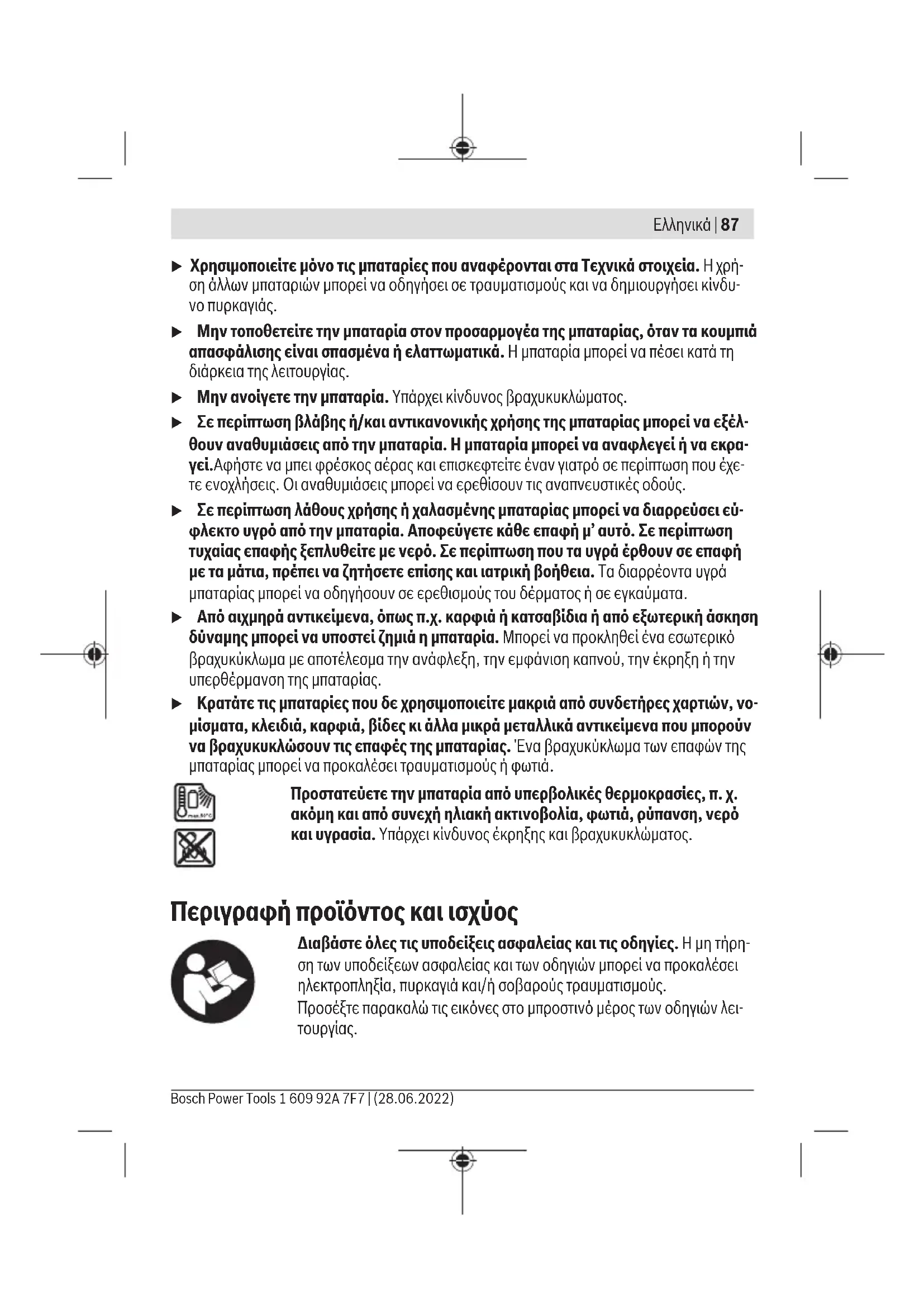 Υποδείξεις ασφαλείας Διαβάστε όλες τις υποδείξεις ασφαλείας και τις οδηγίες. Η μη τήρη- ση των υποδείξεων ασφαλείας και των οδηγιών μπορεί να προκαλέσει ηλεκτροπληξία, πυρκαγιά και/ή σοβαρούς τραυματισμούς. Φυλάξτε όλες τις προειδοποιητικές υποδείξεις και οδηγίες για κάθε μελλοντική χρήση. 1 609 92A 7F7 | (28.06.2022) Bosch Power ToolsΕλληνικά | 87 u Χρησιμοποιείτε μόνο τις μπαταρίες που αναφέρονται στα Τεχνικά στοιχεία. Η χρή- ση άλλων μπαταριών μπορεί να οδηγήσει σε τραυματισμούς και να δημιουργήσει κίνδυ- νο πυρκαγιάς. u Μην τοποθετείτε την μπαταρία στον προσαρμογέα της μπαταρίας, όταν τα κουμπιά απασφάλισης είναι σπασμένα ή ελαττωματικά. Η μπαταρία μπορεί να πέσει κατά τη διάρκεια της λειτουργίας. u Μην ανοίγετε την μπαταρία. Υπάρχει κίνδυνος βραχυκυκλώματος. u Σε περίπτωση βλάβης ή/και αντικανονικής χρήσης της μπαταρίας μπορεί να εξέλ- θουν αναθυμιάσεις από την μπαταρία. Η μπαταρία μπορεί να αναφλεγεί ή να εκρα- γεί.Αφήστε να μπει φρέσκος αέρας και επισκεφτείτε έναν γιατρό σε περίπτωση που έχε- τε ενοχλήσεις. Οι αναθυμιάσεις μπορεί να ερεθίσουν τις αναπνευστικές οδούς. u Σε περίπτωση λάθους χρήσης ή χαλασμένης μπαταρίας μπορεί να διαρρεύσει εύ- φλεκτο υγρό από την μπαταρία. Αποφεύγετε κάθε επαφή μ’ αυτό. Σε περίπτωση τυχαίας επαφής ξεπλυθείτε με νερό. Σε περίπτωση που τα υγρά έρθουν σε επαφή με τα μάτια, πρέπει να ζητήσετε επίσης και ιατρική βοήθεια. Τα διαρρέοντα υγρά μπαταρίας μπορεί να οδηγήσουν σε ερεθισμούς του δέρματος ή σε εγκαύματα. u Από αιχμηρά αντικείμενα, όπως π.χ. καρφιά ή κατσαβίδια ή από εξωτερική άσκηση δύναμης μπορεί να υποστεί ζημιά η μπαταρία. Μπορεί να προκληθεί ένα εσωτερικό βραχυκύκλωμα με αποτέλεσμα την ανάφλεξη, την εμφάνιση καπνού, την έκρηξη ή την υπερθέρμανση της μπαταρίας. u Κρατάτε τις μπαταρίες που δε χρησιμοποιείτε μακριά από συνδετήρες χαρτιών, νο- μίσματα, κλειδιά, καρφιά, βίδες κι άλλα μικρά μεταλλικά αντικείμενα που μπορούν να βραχυκυκλώσουν τις επαφές της μπαταρίας. Ένα βραχυκύκλωμα των επαφών της μπαταρίας μπορεί να προκαλέσει τραυματισμούς ή φωτιά. Προστατεύετε την μπαταρία από υπερβολικές θερμοκρασίες, π.χ. ακόμη και από συνεχή ηλιακή ακτινοβολία, φωτιά, ρύπανση, νερό και υγρασία. Υπάρχει κίνδυνος έκρηξης και βραχυκυκλώματος. Περιγραφή προϊόντος και ισχύος Διαβάστε όλες τις υποδείξεις ασφαλείας και τις οδηγίες. Η μη τήρη- ση των υποδείξεων ασφαλείας και των οδηγιών μπορεί να προκαλέσει ηλεκτροπληξία, πυρκαγιά και/ή σοβαρούς τραυματισμούς. Προσέξτε παρακαλώ τις εικόνες στο μπροστινό μέρος των οδηγιών λει-