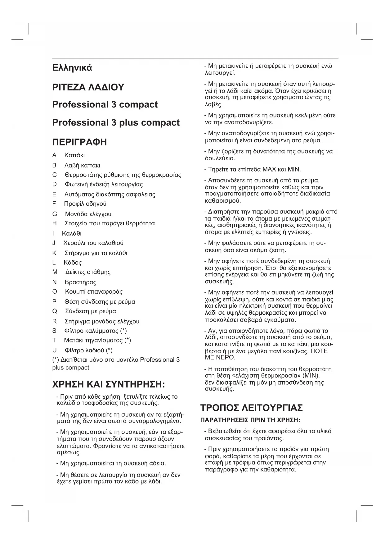 A Καπάκι B Λαβήκαπάκι C Θερμοστάτηςρύθμισηςτηςθερμοκρασίας D Φωτεινήένδειξηλειτουργίας E Αυτόματοςδιακόπτηςασφαλείας F Προφίλοδηγού G Μονάδαελέγχου H Στοιχείοπουπαράγειθερμότητα I Καλάθι J Χερούλιτουκαλαθιού K Στήριγμαγιατοκαλάθι L Κάδος M Δείκτεςστάθμης N Βραστήρας O Κουμπίεπαναφοράς P Θέσησύνδεσηςμερεύμα Q Σύνδεσημερεύμα R Στήριγμαμονάδαςελέγχου S Φίλτροκαλύμματος(*) T Ματάκιτηγανίσματος(*) U Φίλτρολαδιού(*) (*)ΔιατίθεταιμόνοστομοντέλοProfessional3 pluscompact ΧΡΉΣΉ ΚΑΙ ΣΥΝΤΉΡΉΣΉ: - Πριναπόκάθεχρήση,ξετυλίξτετελείωςτο καλώδιοτροφοδοσίαςτηςσυσκευής. - Μηχρησιμοποιείτετησυσκευήανταεξαρτή- ματάτηςδενείναισωστάσυναρμολογημένα. - Μηχρησιμοποιείτετησυσκευή,εάνταεξαρ- τήματαπουτησυνοδεύουνπαρουσιάζουν ελαττώματα.Φροντίστενατααντικαταστήσετε