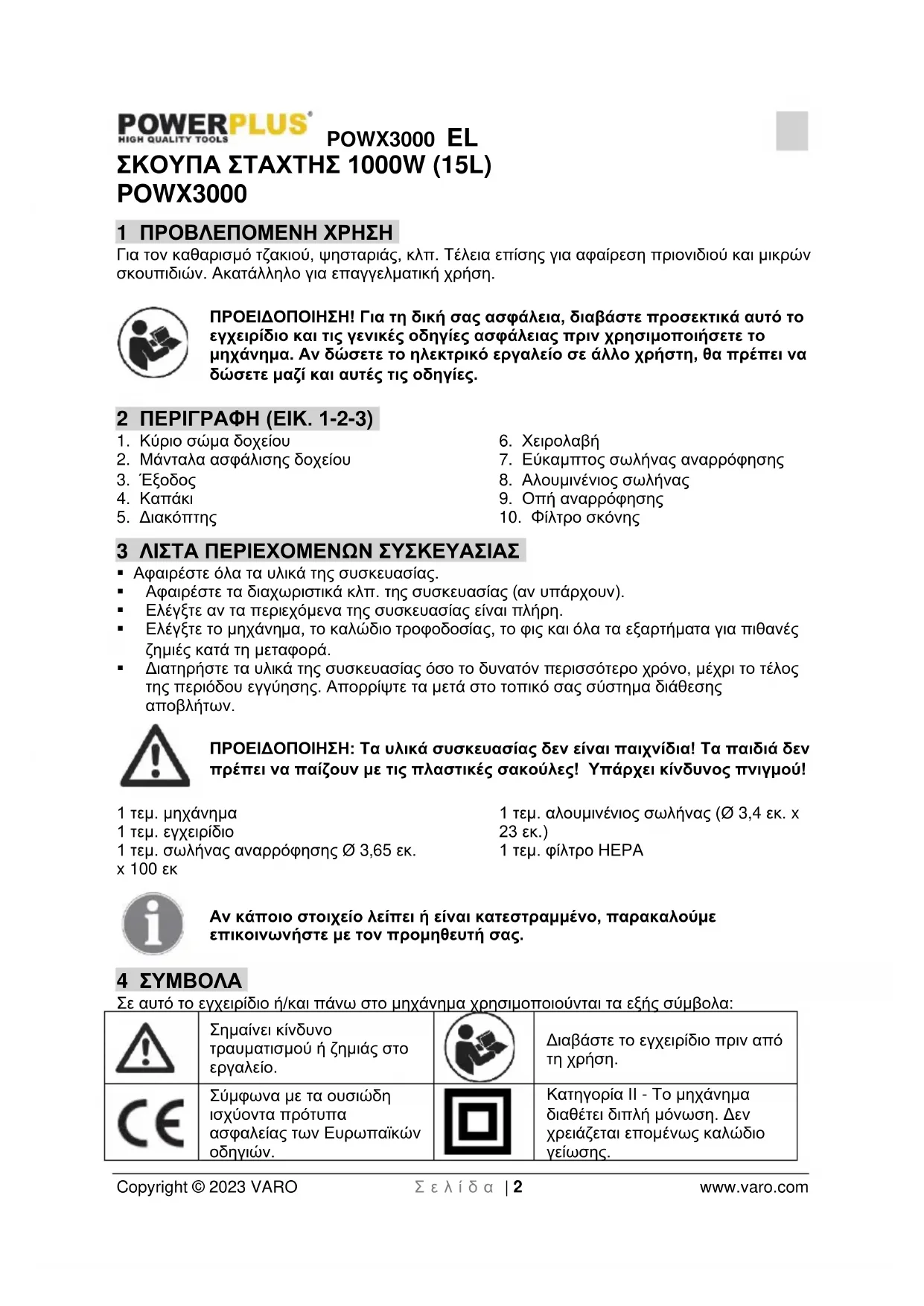 - 14 ΔΗΛΩΣΗ ΣΥΜΜΟΡΦΩΣΗΣ POWX3000 EL Copyright © 2023 VARO Σ ε λ ί δ α | 2 www.varo.com ΣΚΟΥΠΑ ΣΤΑΧΤΗΣ 1000W (15L) POWX3000 1 ΠΡΟΒΛΕΠΟΜΕΝΗ ΧΡΗΣΗ Για τον καθαρισμό τζακιού, ψησταριάς, κλπ. Τέλεια επίσης για αφαίρεση πριονιδιού και μικρών σκουπιδιών. Ακατάλληλο για επαγγελματική χρήση. ΠΡΟΕΙΔΟΠΟΙΗΣΗ! Για τη δική σας ασφάλεια, διαβάστε προσεκτικά αυτό το εγχειρίδιο και τις γενικές οδηγίες ασφάλειας πριν χρησιμοποιήσετε το μηχάνημα. Αν δώσετε το ηλεκτρικό εργαλείο σε άλλο χρήστη, θα πρέπει να δώσετε μαζί και αυτές τις οδηγίες. 2 ΠΕΡΙΓΡΑΦΗ (ΕΙΚ. 1-2-3) p. 8